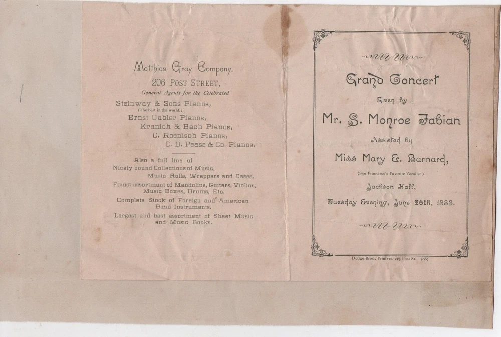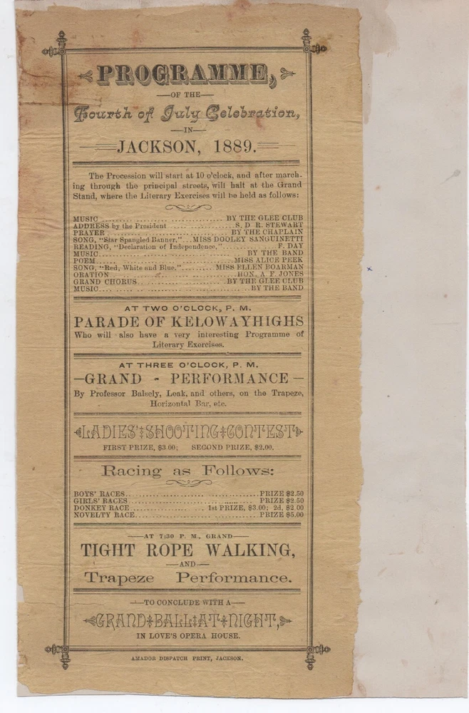 Up for auction are two Programs from Jackson Amador County California mounted back to back to an album page. The first is for a 4th of July Celebration. It measures 5.25 x 10.75 inches and has light soiling at top. The other is for a grand concert and measures 4.25 x 6 inches and has light wrinkling