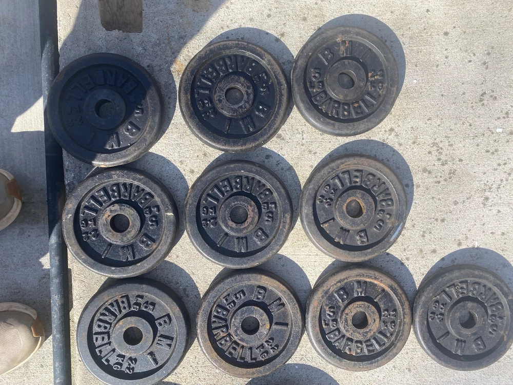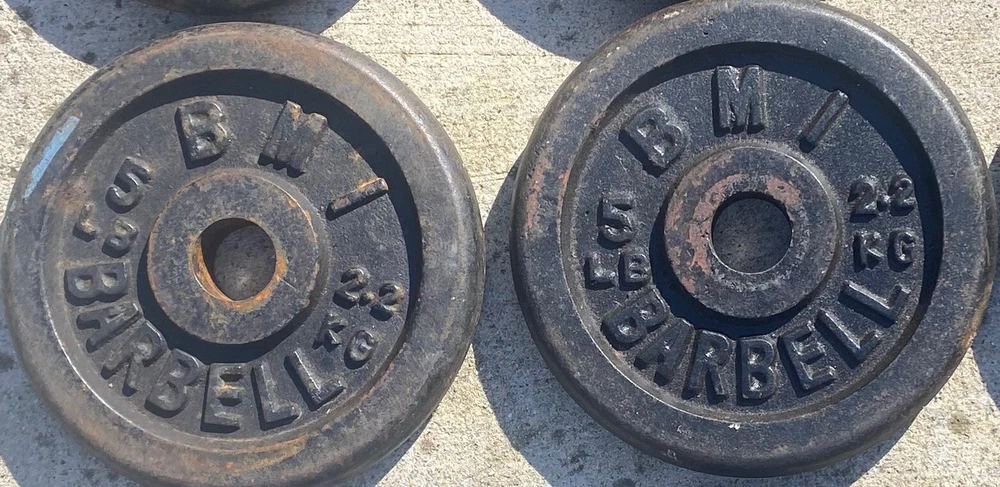 The product is a set of two vintage 5 lb. BMI cast iron weight plates with a 1" hole, suitable for standard bars. The weight plates are black in color and are designed for weight lifting activities. They are unisex and have a classic design, adding a touch of nostalgia to strength training routines. Made of durable cast iron, these weight plates are ideal for individuals looking to enhance their fitness and strength training regimen.