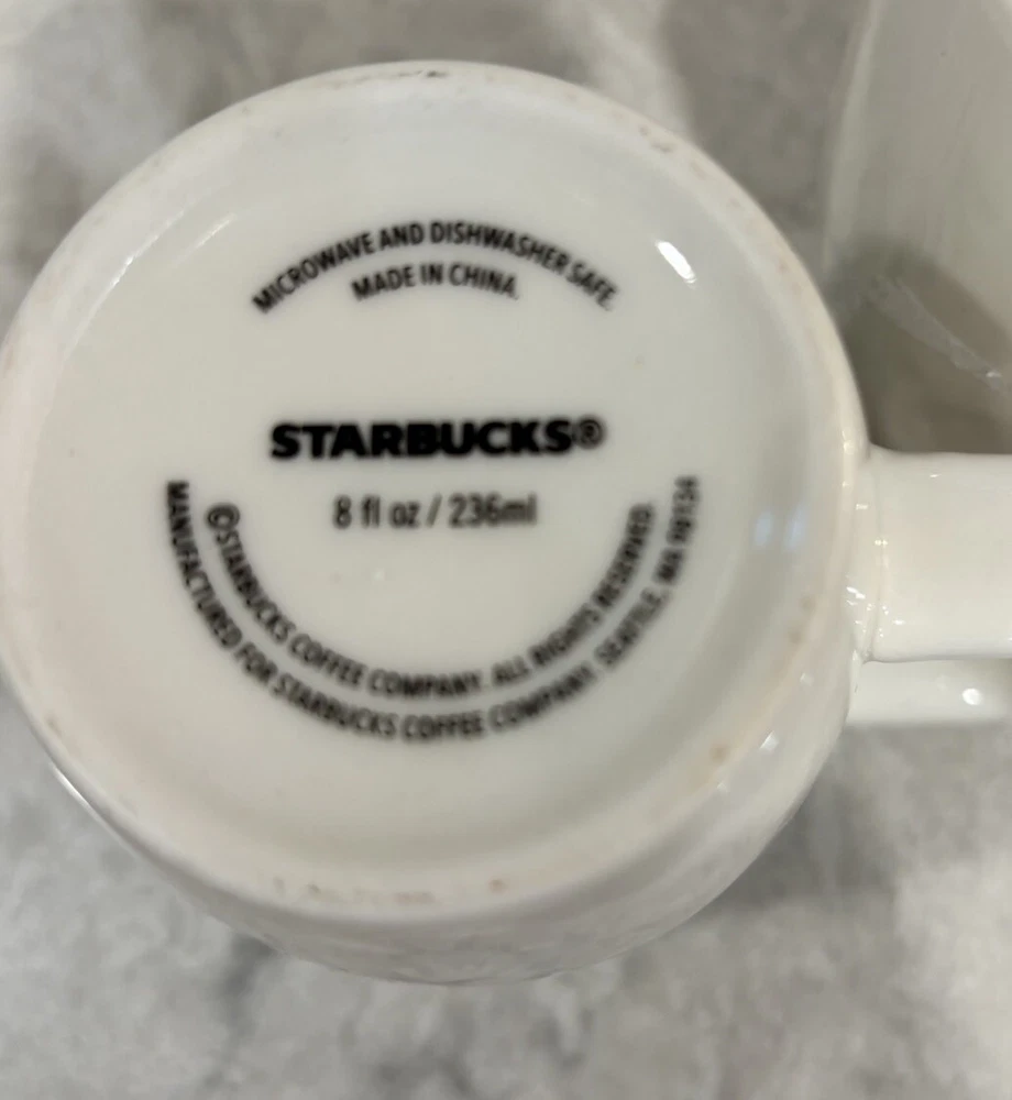 Pair of Starbucks holiday mugs with black logo surrounded by wreath of holly. 8 oz. Not dated. Square handle. Measure approximately 4 1/4” tall and 2 3/4” in diameter. New. No chips or cracks.