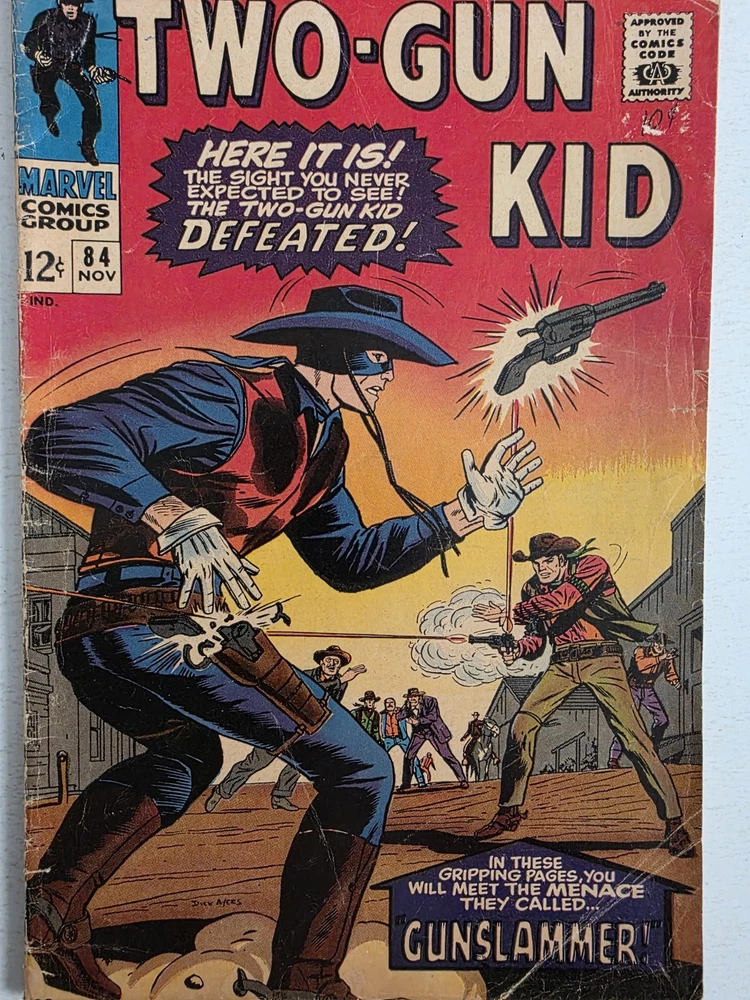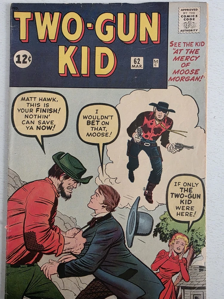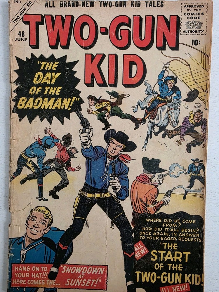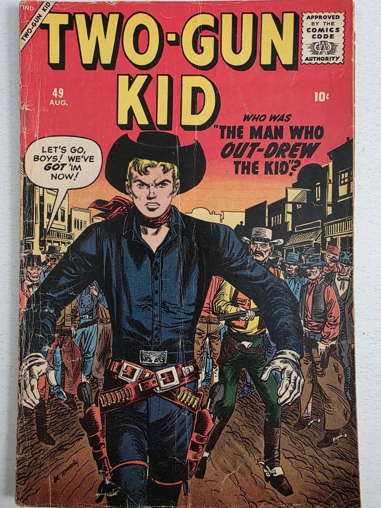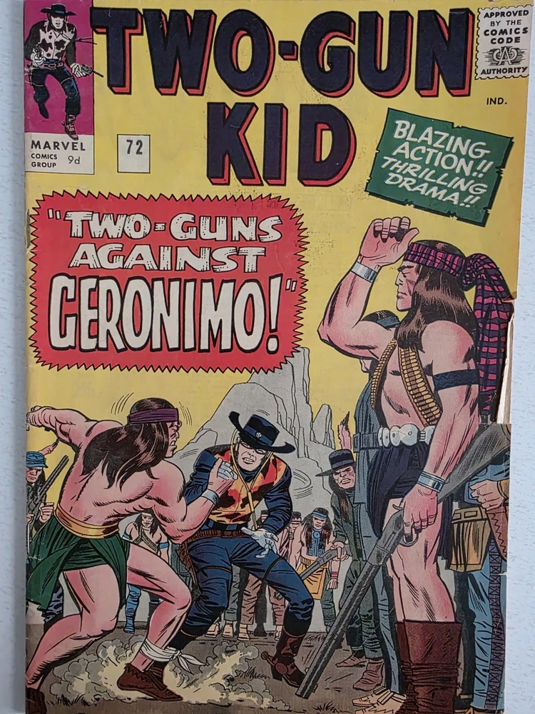 This is a set of four vintage US comic books from the SilverAge 1957 featuring characters like Two-Gun Kid, Geronimo and Kid Colt. The comics are in a high mid-grade condition and were created by renowned artists and writers like Jack Kirby and Stan Lee. The series title is "Two-Gun Kid" and the publisher is Marvel. These color comics are part of the Marvel Western universe and are intended for a general audience. *Includes #36 VG+ #48 VG- #49 VG- #62 FN #72 FN- #79 VG/FN #84 VG - Bagged and boarded - Shipped with Gemini packing to insure no damage during shipping - Usps Priority Check out our 1000s of comics in our store We combine shipping