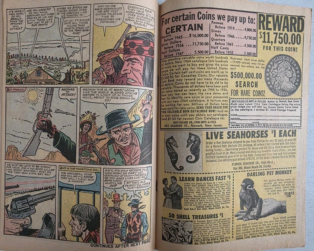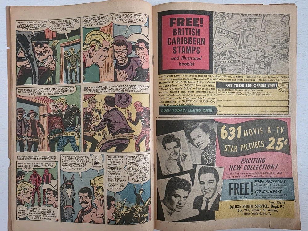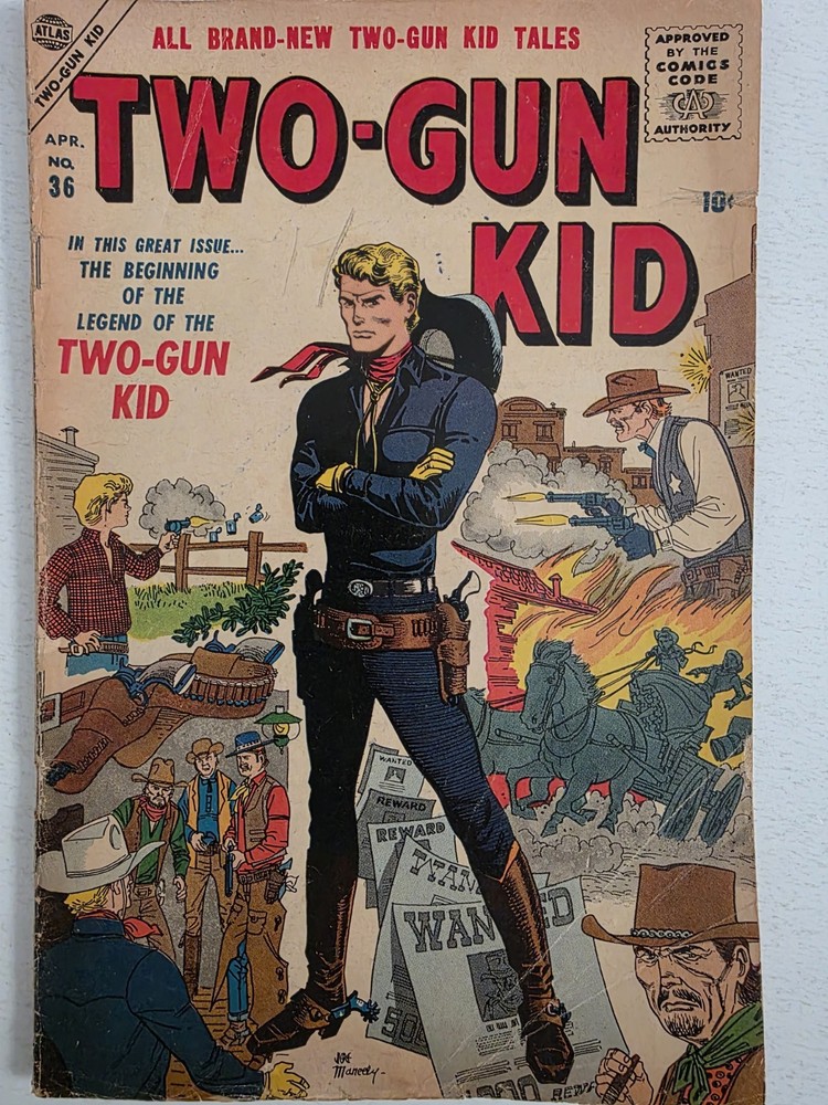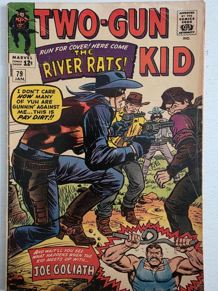 This is a set of four vintage US comic books from the SilverAge 1957 featuring characters like Two-Gun Kid, Geronimo and Kid Colt. The comics are in a high mid-grade condition and were created by renowned artists and writers like Jack Kirby and Stan Lee. The series title is "Two-Gun Kid" and the publisher is Marvel. These color comics are part of the Marvel Western universe and are intended for a general audience. *Includes #36 VG+ #48 VG- #49 VG- #62 FN #72 FN- #79 VG/FN #84 VG - Bagged and boarded - Shipped with Gemini packing to insure no damage during shipping - Usps Priority Check out our 1000s of comics in our store We combine shipping