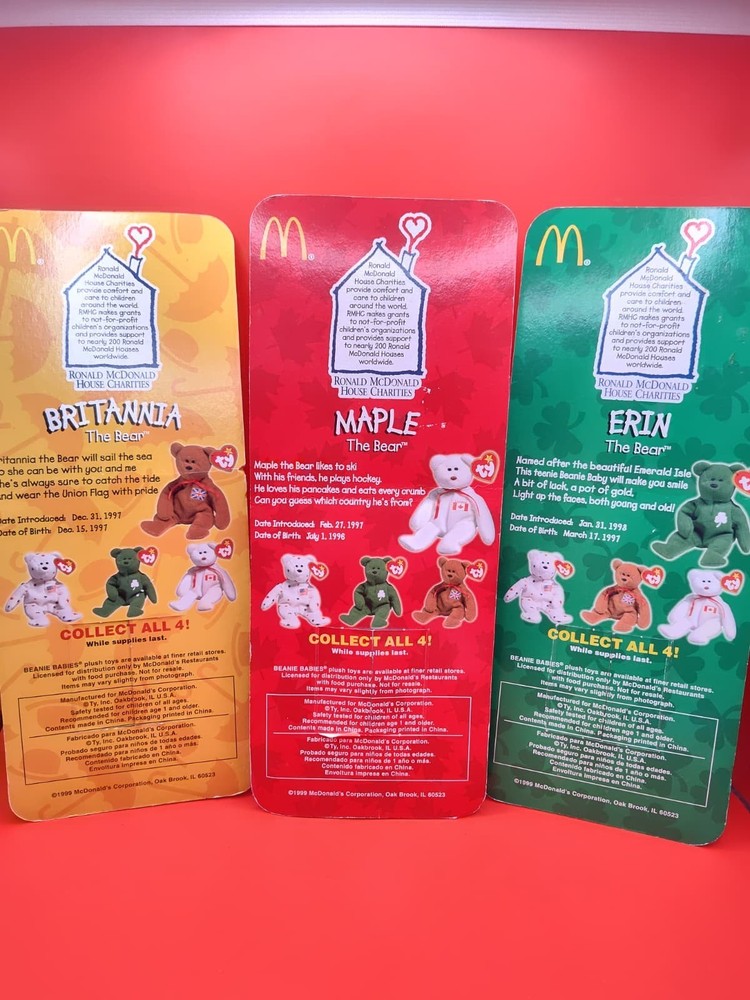 The product is a set of Ty Beanie Babies International Bears from McDonald's released in 1999 and still sealed in the original box. These rare collectible toys are from China and feature the iconic McDonald's branding. As part of the original Beanie Babies line by Ty, these plush bears hold sentimental value for collectors and fans of nostalgia from the late 90s.