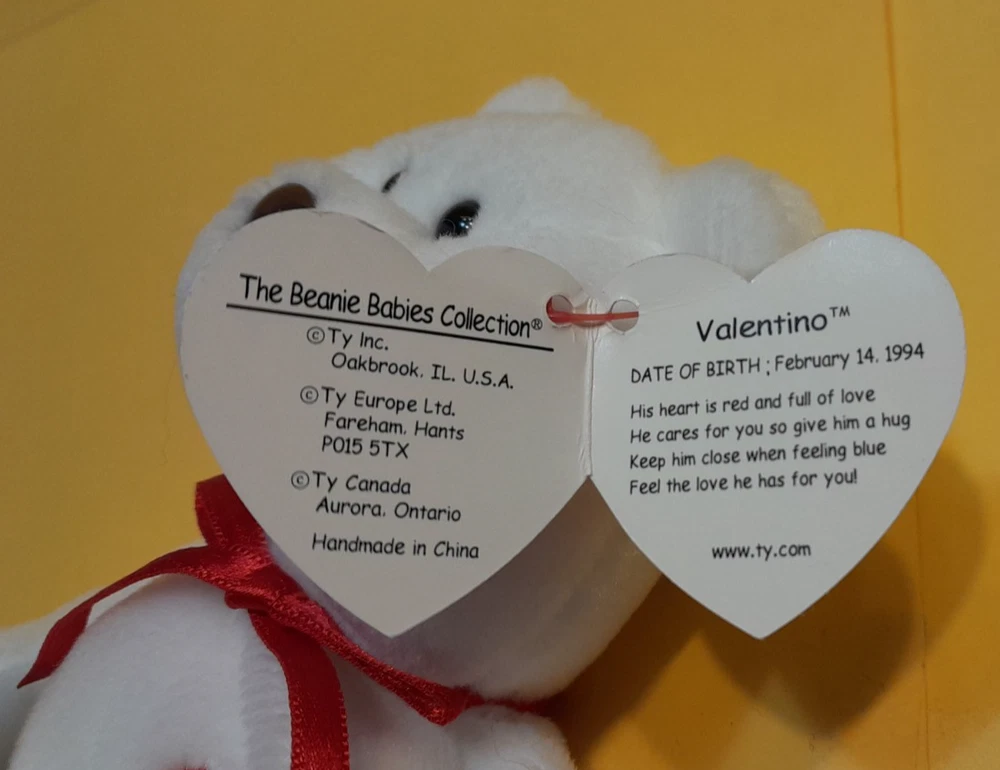 Ty Beanie Baby, Valentino & Valentina. Mint condition. Valentino's birthday is February 14,1994. Valentina's birthday is February 14, 1998. Valentino is filled with the PVC pellets. Valentina has PE Pellets. Ty