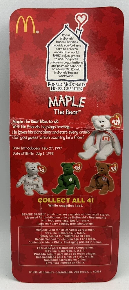 This vintage Ty Maple The Bear Beanie Baby is a must-have for any collector. Made in 1993, this rare edition is in great condition and comes with its original tag. Maple The Bear is part of the McDonald House charity collection and has a special place in the hearts of many Beanie Baby enthusiasts. The plush toy features fine details and is the perfect addition to any collection. Don't miss out on this opportunity to own a piece of nostalgia.