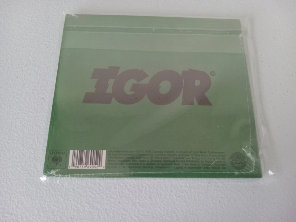 (CD) (NEW & SEALED) CASE (NM) Please view all pictures and if more are needed, just let me know! OFFICIAL MERCHANDISE Tyler, The Creator ‎– Igor CD Album Limited Edition Green Cover Limited edition CD available by preorder only. Tracklist 1 Igor's Theme 3:20 2 Earfquake 3:10 3 I Think 3:32 4 Boyfriend 4:00 5 Running Out of Time 2:57 6 New Magic Wand 3:15 7 A Boy is a Gun 3:30 8 Puppet 2:59 9 What's Good 3:25 10 Gone, Gone / Thank You 6:15 11 I Don't Love You Anymore 2:41 12 Are We Still Friends? 4:25