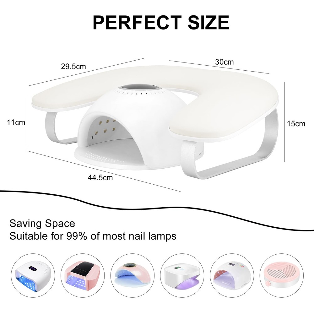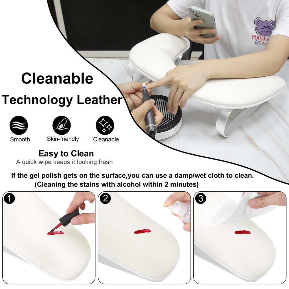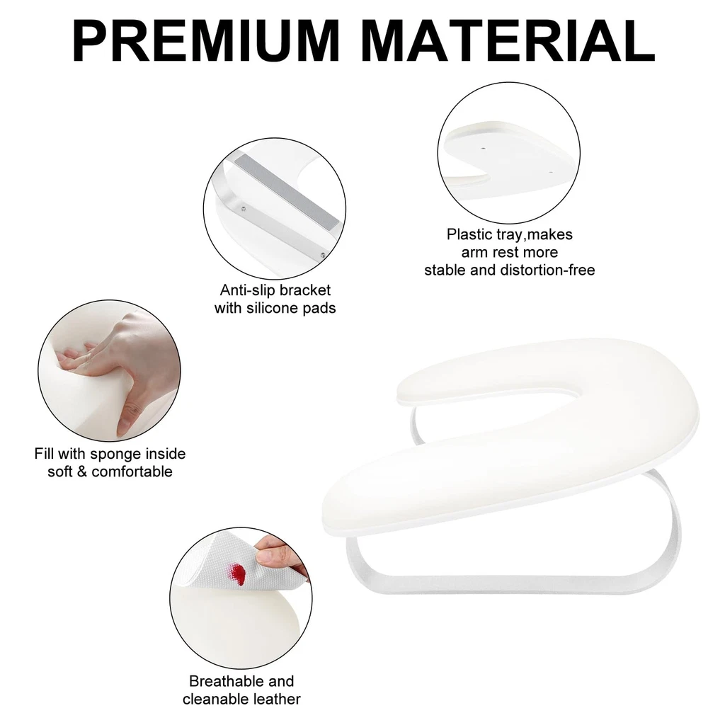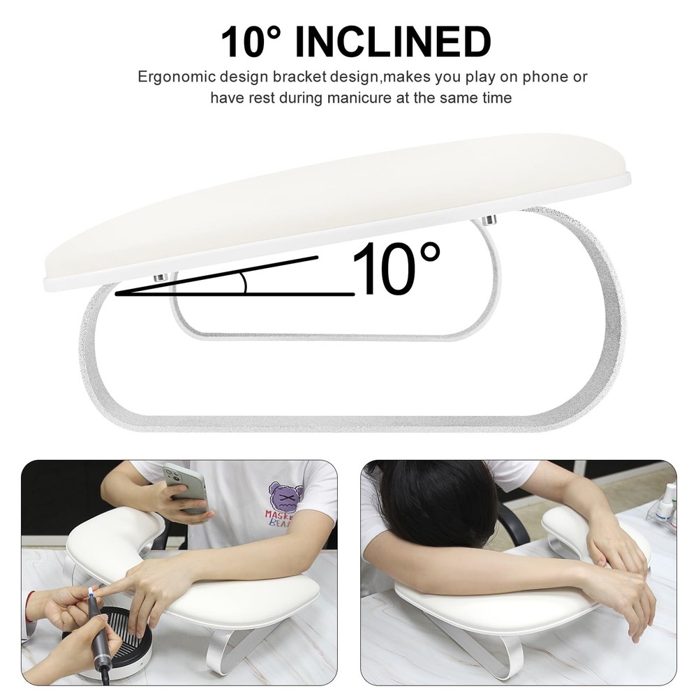 U Shaped Nail Arm Rest For Nails Tech,Cleanable Leather Nail Hand Rest Stand With Aluminum Alloy Bracket,Manicure Hand Rest For Salon Home DIY Nails,Non-slip Cleanable & Comfortable:Our nail arm rest are made of cleanable technological leather and non-deformable resilient sponge,effectively relieve your hand fatigue.The PU leather surface is stylish and easy to maintain.A quick wipe keeps it looking fresh. (NOTE:It is easily wiped clean with a damp cloth within 2 mins.Acidic or caustic cleaning solutions are prohibited) Ergonomic Design:U-shaped nail hand rest is engineered with 10-degree incline that aligns with ergonomic principles,allowing client to lie down to sleep or spend some time on the in a comfortable posture.For nail techs, this armrest for nails can make it easier to do nails as clients keep their hands and wrists at an easier angle for them to reach. Lightweight Bracket & Simple Assembly:Our nail hand rest is equipped with no-rust and lighter aluminum alloy bracket which makes it easy to carry and , ideal for mobile nail technicians.The nail arm rest holder is no need complicated installation steps,you just need to tighten the screws and start your manicure. Big & Space Saving:The arm rest for nails tech has enough height and larger space to place nail art machine,which can accommodate most of nail lamps,nail drill,nail dust collector and other nail art tools on the market and saving space on the manicure table and improving the efficiency of nail art.This manicure hand rest pillow for nails tech makes your work area look neat and professional! Perfect for nail salon and home DIY nails use. Ideal Gift:This nail hand rest holder is suitable for nail salons,home DIY,nail enthusiasts and nail beginners. In addition,our nail armrest comes in a delicate box,a perfect nail art gift for wives,ladies and girlfriends on Valentine's Day,birthdays, Christmas,New Year and other holidays.If you have any questions about our armrest,please us