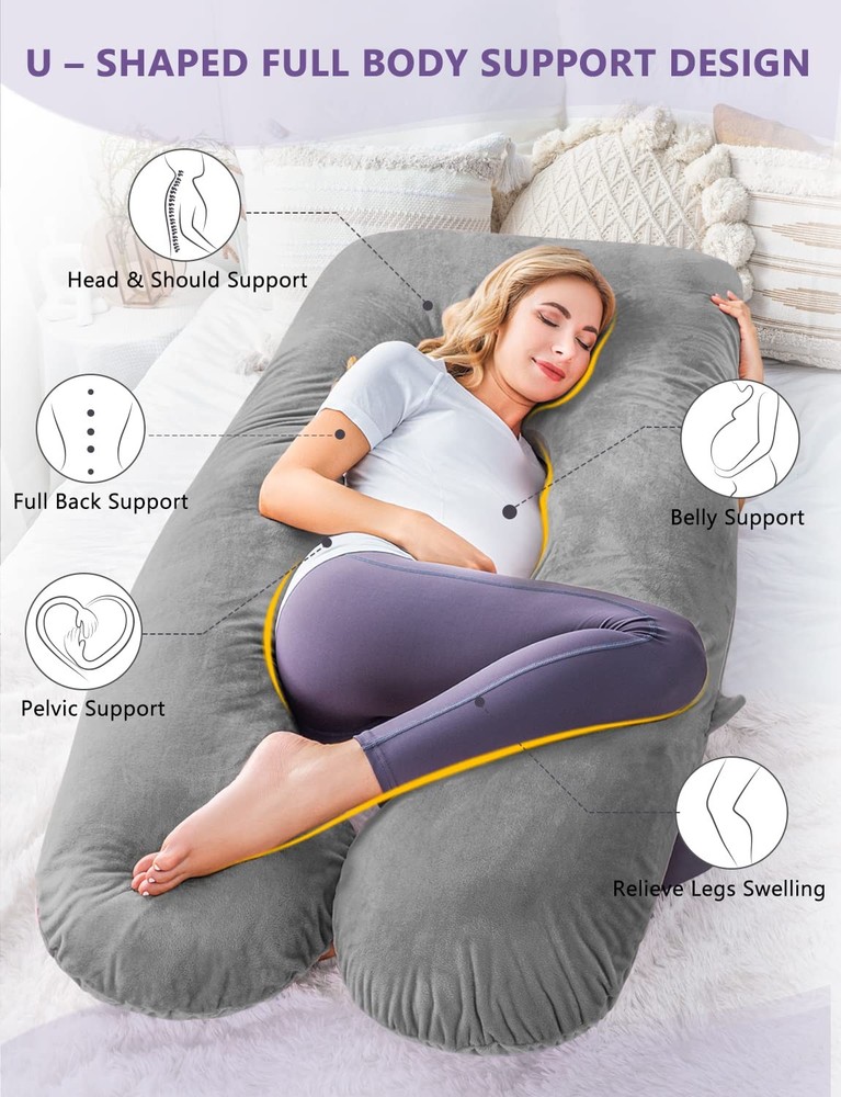 Body Pillow size: ( It will look small when you see the package.) This is a HUGE pillow.It measures approximately 30.7 inches by 55 inches.It will take up almost half of a big bed. Once you receive your new body maternity pillow Your body pregnancy pillow comes in a vacuum-sealed plastic.You will either need to pat & shake it lightly for the pillow body or let it sit for several hours so the air will cause the pillow to rise. Adjustable Full Support (DIY Pillow) Feature The special feature allows you to adjust your back support zones and headrest by shifting the fills inside, shaping the pillow to customize the support of human curvature, maintaining your head and back in comfortable position while in sleep. You can further adjust the firmness of the pillow by adding or removing the fills through the zipper at the bottom of the pouch. U Shaped Total Body Pillow, a good sleeping pillow for mother, side sleepers and back sleepers Cradle yourself in this U shape maternity pregnancy pillow, which has two contoured “legs” allowing you to sleep on your side or on your back, sitting up or lying down, the comfortable contoured body support pillow allows you to stretch out and cradle your entire body in support and comfort. Ergonomic U Shaped Design: - velvet cover is breathable and will allow for great airflow, easily removable and Machine washable; -Elevates and aligns hips to help ensure a neutral position to relieve strain on joints and increase the amount of blood. Cradle yourself in custom comfort all throughout the night; -Total body pregnancy pillow helps relieve carpal tunnel, sciatica, gastric reflux, nasal congestion, no more tossing, turning, or restless nights; -Premium plush interior cushion is soft but firm and helps with sore necks, shoulder aches, lower back pain or late-pregnancy discomforts. Pregnancy Pillow for pain relief - u shaped pregnancy pillow is designed to replace the needs of multiple bed pillows, and help support head, back, belly, sides, knees, hip and feet properly. Countless of our customers have been used this pregnancy body pillow for fibromyalgia, sciatica, gastric reflux, congestion, carpal tunnel syndrome, tossing and turning, back pain and 3rd trimester pregnancy body pain relief effectively. Best Maternity Pillow for Sound Sleep - The unique design follows the shape of pregnant moms, which is an over-sized U-shape, and is long enough for you to stretch out and support both back and front. The u shaped body pillow is not only a cool pregnancy gift for pregnant women, but also a comfortable gift for everyone who is eager for a better sleep. Multifunctional Cuddle Pillow – Our pregnancy pillows are quite suitable for side sleeper, back sleeper and stomach sleeper. Creates a relax & comfortable position for sleeping, reading and watching TV, etc. Machine Washable Material – Comfy velvet pregnancy pillow cover is machine washable. Both the outer and inner body pillow cover come with double zippers which allow you to adjust the filling to reach your own height.This adjustable 7D polyester filling is certified standard 100 by OEKO-TEX without smelling and retains fluffiness for better performance and longer use. Great gift to show your loved ones, family or friends that you really care about their relaxation and health with this amazing full body pregnancy pillow.