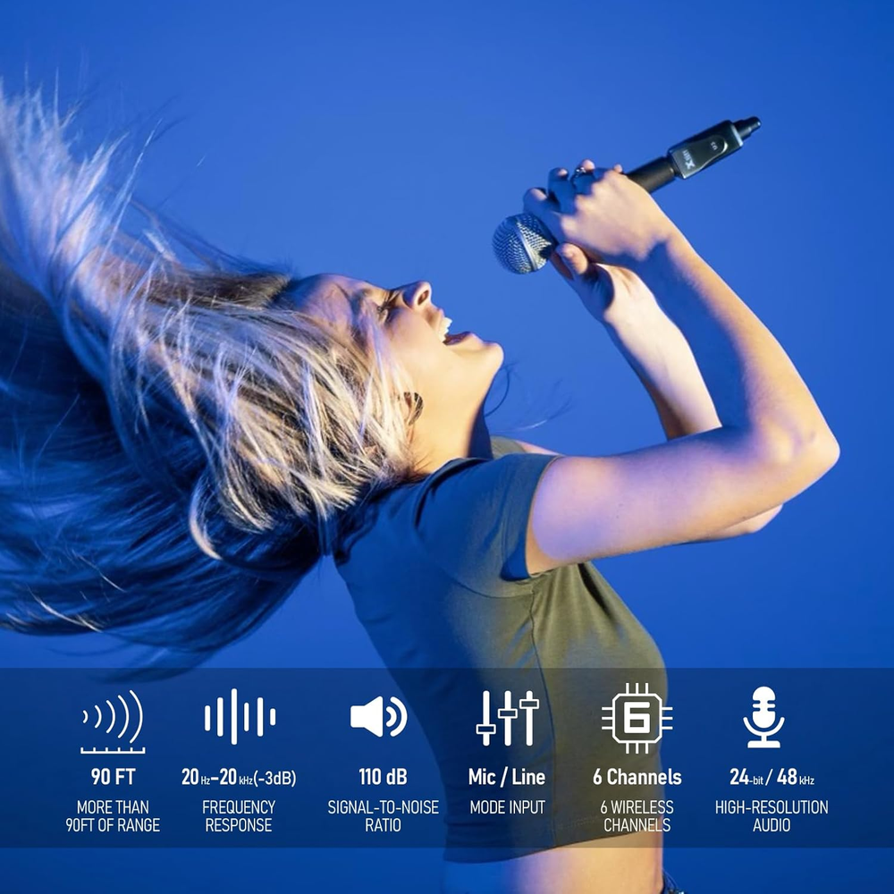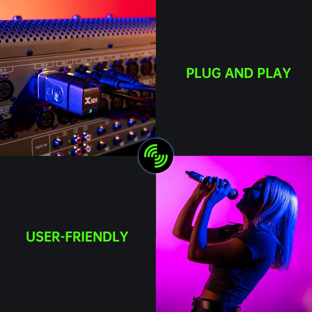 Store New Arrivals Add to Favorite View Feedback Contact U3 Wireless Microphone System 2.4Ghz Wireless XLR Transmitter and Receiver for Dynamic Microphone, Audio Mixer, PA System (U3 Dynamic) Description Item model number XV-U3 Hardware Platform Camera Style U3 DYNAMIC Power Source Battery Powered Country of Origin China Product Dimensions 7 x 5 x 3 inches Material Alloy Steel, Acrylonitrile Butadiene Styrene (ABS) Material Type Alloy Steel, Acrylonitrile Butadiene Styrene (ABS) Compatible Devices Mixer, Camera, PA system Connector Type XLR Item Weight 10.6 ounces Connectivity Technology XLR Size U3 Voltage 3.7 Volts Battery type Lithium Ion Color Name U3 XLR Batteries 2 CR2 batteries required. (included) Hardware Interface USB Special Feature Low Latency Is Discontinued By Manufacturer No Versatile Compatibility: Support 6 sets in the same place simultaneously. Works with any dynamic/Harmonic microphone, Audio mixer, PA system, Provides stable and reliable wireless transmission.Works with any active loudspeakers, Perfect for venues, weddings and mobile DJ's Crystal Clear Sound: Enjoy a broad frequency response from 20Hz to 20kHz, delivering high-resolution 24-bit/48kHz audio that captures every detail of your performance Optimized 2.4GHz Wireless Band: 2.4GHz band is optimal for Microphone wireless, Solid RF connection over a 90 feet range,uncompressed wireless signal transmission, low noise and latency.Up to 107 dB signal-to-noise ratio provides clear, detailed audio at any volume Ultra-Low Latency: Experience virtually no lag with less than 5ms latency, perfect for live performances. Supports up to 6 simultaneous channels for seamless multi-microphone setups Two Modes Mic and Line: Mic mode can use regular auxiliary output signals from computers and MP3 players. Line mode has a greater dynamic range and can handle larger output devices, such as the main mixer output, without producing popping sounds Transform Your Setup: Simplify your setup by turning any of your favorite dynamic microphones into a wireless system, perfect for both performers and active loudspeaker setups Long-Lasting Battery: Perform without interruption with up to 5 hours of battery life. Both the transmitter and receiver come with rechargeable batteries, ensuring you're always ready to go What's in the Box: Xvive U3 wireless system,charging cable,User manual Product Description STABLE AND FLEXIBLE - Designed for professional dynamic microphones, the U3 features recording-level sound transmission quality, and a stable and reliable wireless signal. This flexible and portable wireless solution accommodates a wide range of microphones—use your favorite! The U3 system is suitable for recording studios, music and theatre performances, public speaking, videography, outdoor use and more. PLUG AND TALK – The compact “plug and play” design makes the U3 super-easy to operate. The U3 uses a balanced XLR interface: just plug it in and turn it on. It sets up easily in seconds, allowing you to simply enjoy the fun and convenience of wireless. SMALL AND POWERFUL – In these ultra-compact units, built-in lithium-ion batteries provide you with five hours of usage—and dependable, stable wireless performance. The durable metal case makes the transmitter suitable for use in a wide variety of applications. 2.4GHz—FREE FROM INTERFERENCE – What’s the best way to avoid interference? The Xvive U3 digital wireless system broadcasts on the 2.4GHz band, which avoids interference caused by TV stations, public safety broadcasts, cell phone towers, and other high-powered sources. However, some environments are more difficult than others for 2.4GHz wireless system performance. We suggest you keep the transmitter at least 3 meters away from Wi-Fi routers or other wireless systems in the area; and not too far from the receiver. U3 WIRELESS MICROPHONE SYSTEM · The 2.4GHz band is optimal for microphone wireless, and is approved for use worldwide · Less than 5ms latency; simultaneous broadcast on 6 channels · Indoor range: up to 90 feet (actual range depends on RF signal absorption, reflection and interference) · 5 hours of battery life (rechargeable batteries onboard both the transmitter and the receiver) · Works with XLR dynamic microphones and battery-powered condenser microphones · Dynamic range of 110dB · The U3 wireless system aims to remove the complexity and frustration from traditional microphone wireless systems—creating a flexible, all in-one solution that converts your favorite microphone into a wireless mic. Transmitter U3 for Dynamic Microphone Supports dynamic microphones and battery- powered condenser microphones. U3 Mode Mic mode for dynamic microphones, Line mode for PA systems. The U3 transmitter can be connected to XLR jacks or mono 1/4" TS jacks with the included adapter. U3C for Condenser Microphone Wireless unit for handheld condenser microphones. Supports most models on the market. U3C Mode Only for XLR condenser microphones. Provides 48V or 12V phantom power. Receiver Portable size The transmitter and receiver can be held in one hand, carried in a gig bag, and used anywhere, anytime! Transmitter connection The U3 receiver works with both U3 and U3C transmitters. Multiple applications The mono, balanced XLR output can be connected to a mixer or XLR microphone preamp. Lose the XLR cable Eliminating cables makes your rig look cleaner and allows you to play more freely! More about the U3 and U3C Six channels The unit's 6 channels let you avoid interference on 2.4Ghz frequency bands. Use up to 6 sets at the same time! Simple operation Set the channel on first use, and then every time after, just turn on the power! Play more freely The U3 lets you move freely while you're singing, further than the length of a cable with no loss of sound quality! Built-in lithium battery Rechargeable internal batteries last for more than 5 hours per charge and avoid the waste and inconvenience of AA batteries. Avoid 2.4GHz in