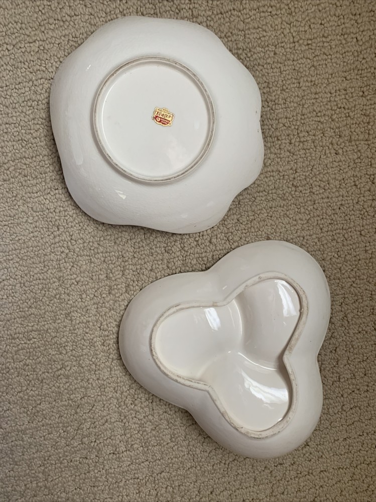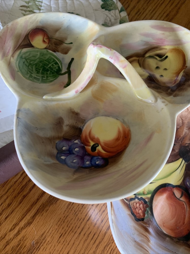 ucagco Bowl And Nut Dish. 3 part nut bowl measures approx 8” across and other bowl 8” too. Only the one has the ucagco ceramics Japan sticker on back so can’t say for sure what brand nut bowl is. However I think it is prettier snd has similar painting and color tones so it could be. No chips on either and in good condition. Questions welcome!