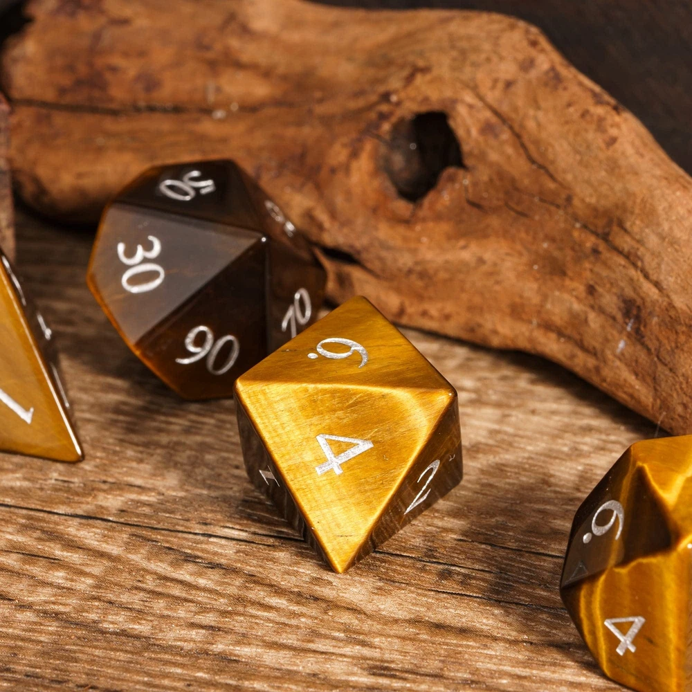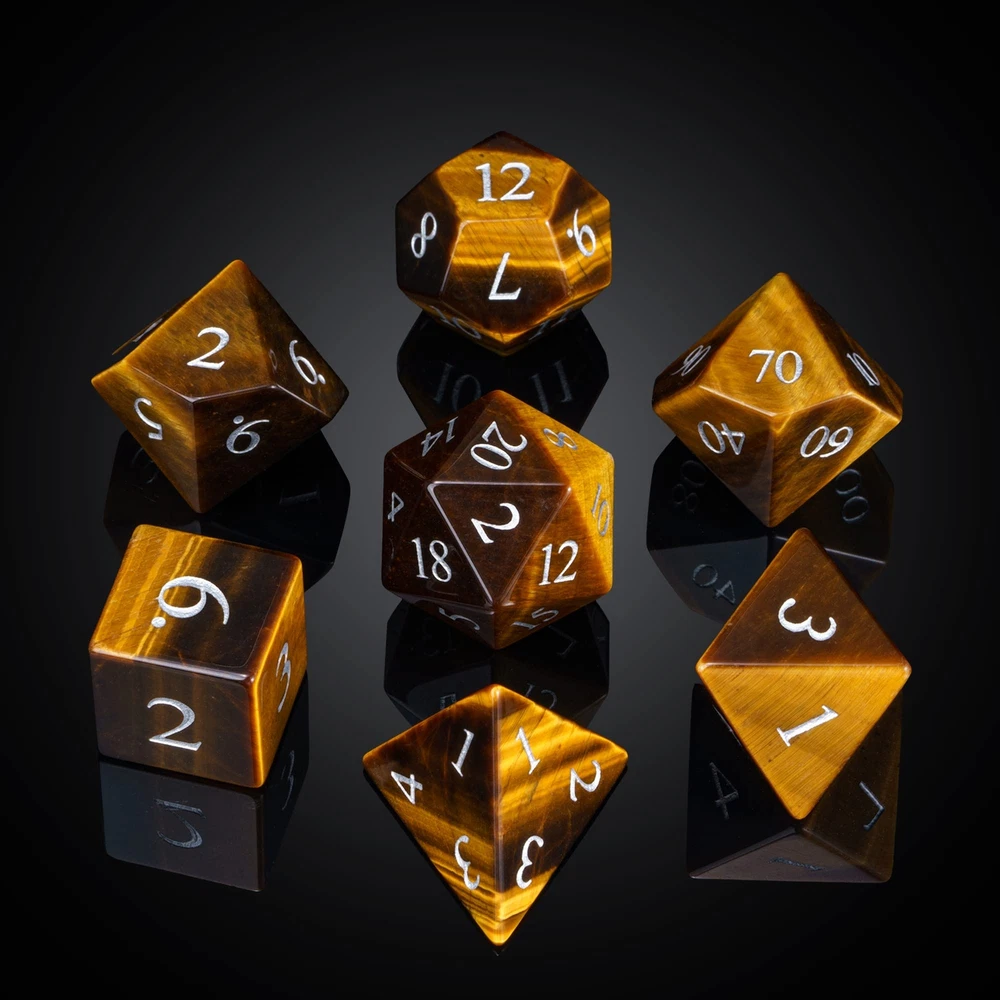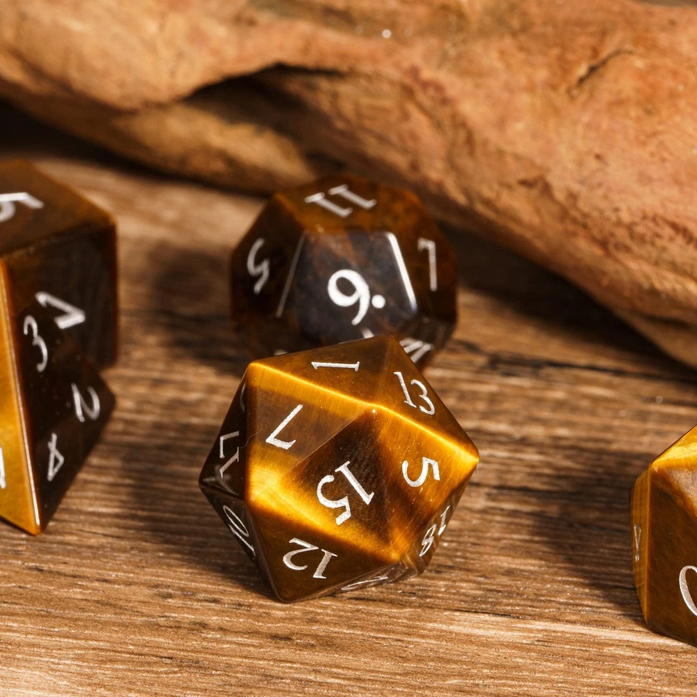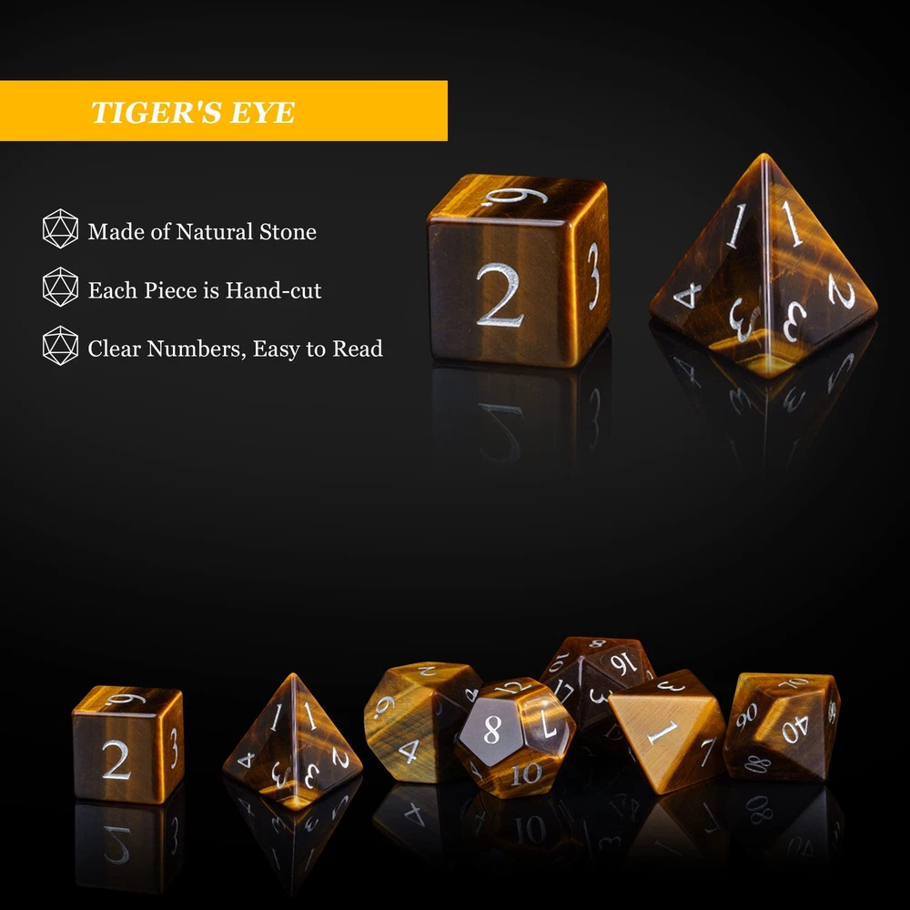 UDIXI Stone DND Dice Set, 7PCS Tiger's Eye Gemstone D&D Dice for Dungeons and Dragons, Role Playing Dice for RPG MTG Table Games GEMSTONE DICE: Made of natural gems, each gemstone dice is like a precious treasure. You can clearly see their natural texture under the light. PRODUCT PACKAGING: High-quality leather dice box, the inside of the dice box is made of sponge material, which can give the softest protection to the DND dice. The dice box has a button lock, which can more firmly protect the dice box from being easily opened and causing the gems dice to fall. BEST GIFT CHOICE: Exquisite dice with a high-end leather box, it can be used as a valuable gift for your friends and family, trust me, they will be very satisfied with your gift. NOTE: Although the material is already very strong, it is recommended to use it with a dice pad to better protect the dice and make it your most exquisite collection. HASSLE-FREE WARRANTY: All our dice set are hand packaged and inspected to ensure you receive the best of the best. Any issue, just contact us. We are always ready to help you. Shipping We offer FREE shipping on all orders! We use a selection of shipping services such as UPS, FedEx, USPS etc. We only ship to the lower 48 states, no APO/FPO addresses or PO Boxes allowed. Local pickups and combined shipping options are not provided at this time. Return You can return a product for up to 30 days from the date you purchased it. Any product you return must be in the same condition you received it and in the original packaging. Please keep the receipt. Payment We accept payment by any of the following methods: PayPal Please pay as soon as possible after winning an auction, as that will allow us to post your item to you sooner! Feedback Customer satisfaction is very important to us. If you have any problem with your order, please contact us and we will do our best to make you satisfied. Contact Us If you have any queries, please contact us via ebay. We usually respond within 24 hours on weekdays. Please visit our eBay store to check out other items for sale! Thank you for shopping at our store.