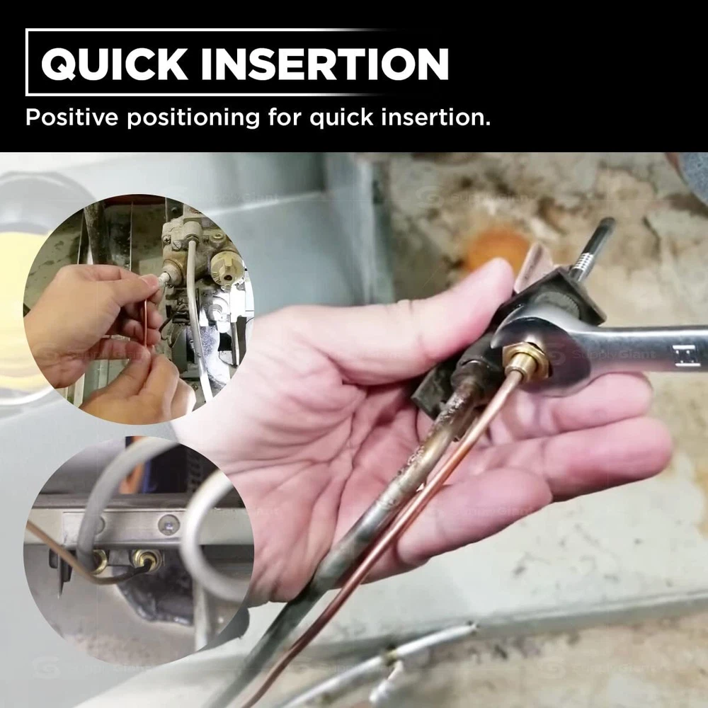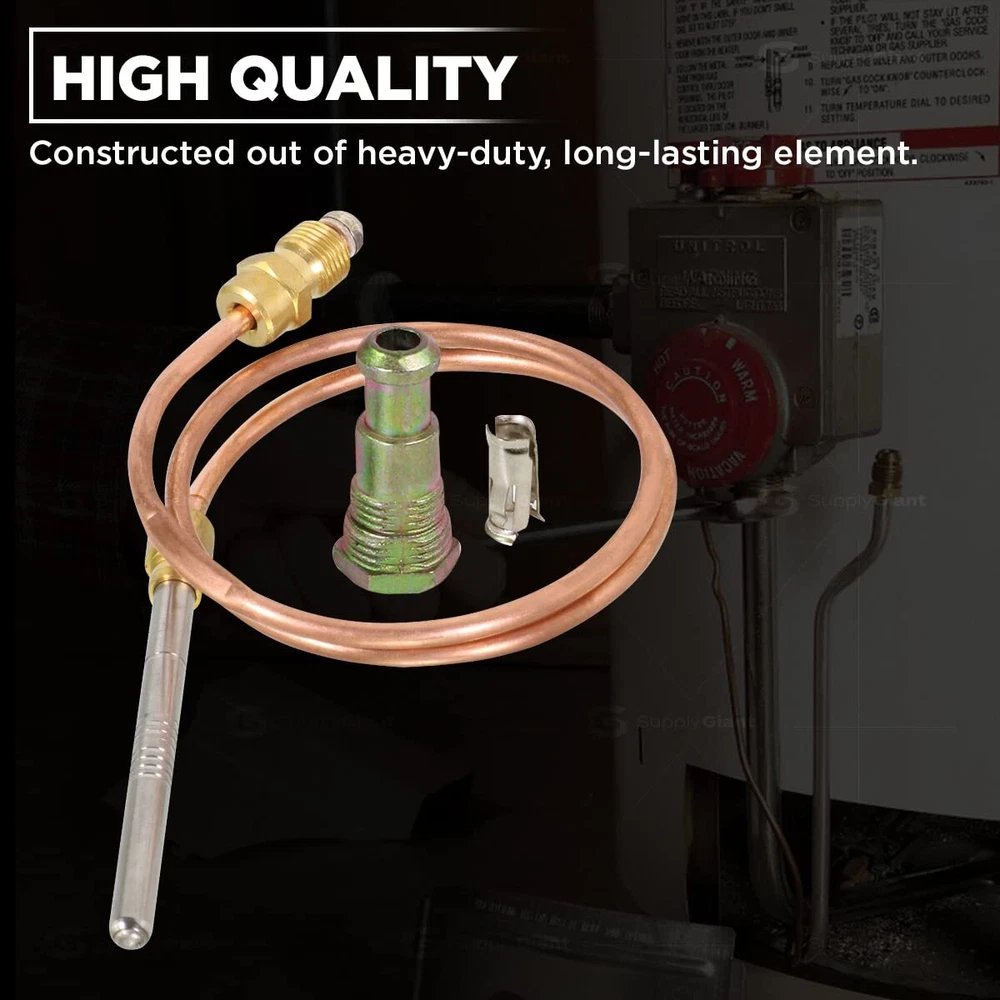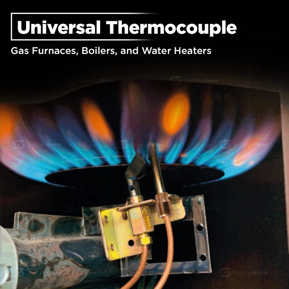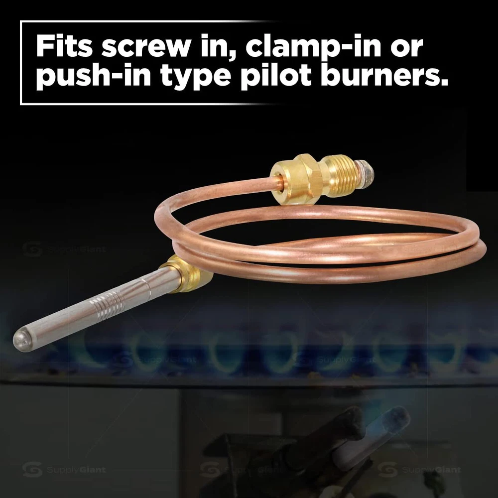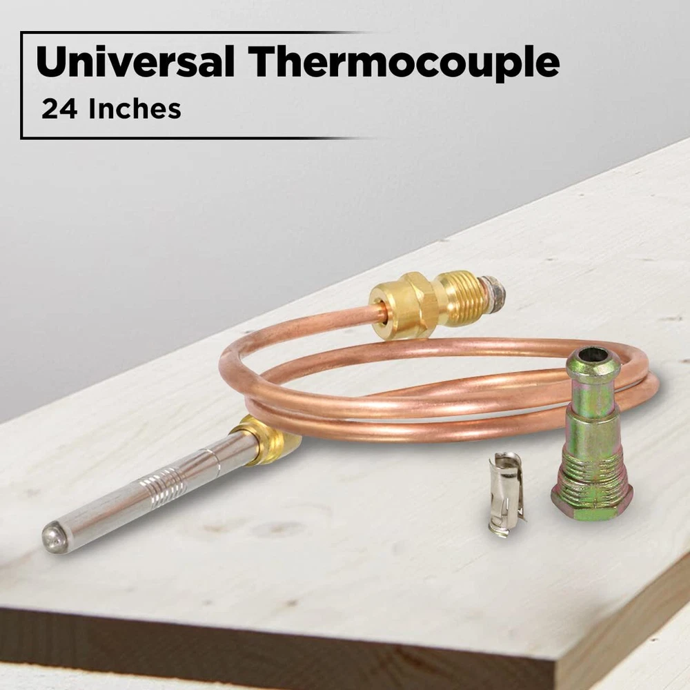 universal thermocouple can be used for a large range of applications, including gas fireplaces, BBQ grills, boilers, water heaters, and more. Features a positive positioning for quick insertion. Heavy-duty, long-lasting element. Fits screw in, clamp-in, or push in type pilot burners. Includes adapter fittings. ⚠ California Proposition 65 Warning: This product is known to the state of California to cause cancer, or other reproductive harm. For more information, go to www.p65warnings.ca.gov. · for Wide Range of Applications. for gas furnaces and 30 millivolt Systems which include boilers, Water heaters, BBQ grills etc. · Quick Insertion. Positive positioning for Quick Insertion. · High Quality. Constructed out of Heavy-Duty, Long-Lasting element. · Fits screw in, Clamp-in or push-in type pilot burners. · 24” thermocouple, Includes Adapter Fittings.