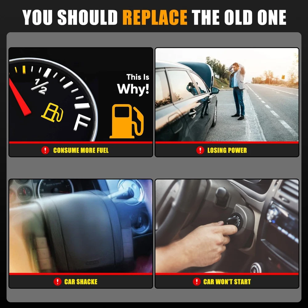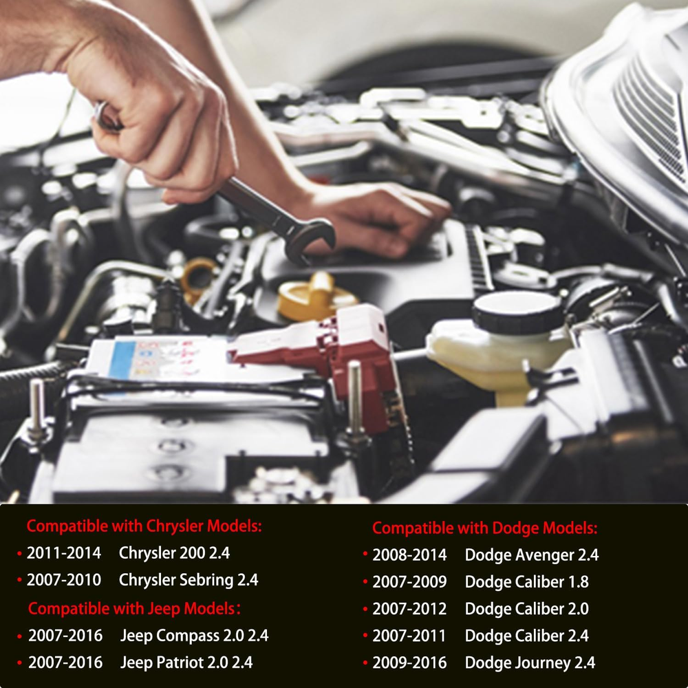 Compatible with: 2011-2014 Chrysler 200 , 2007-2010 Chrysler Sebring , 2008-2014 Dodge Avenger , 2007-2012 Dodge Caliber , 2009-2019 Dodge Journey , 2007-2016 Jeep Compass , 2007-2016 Jeep Patriot Replace Part Number: Spark plug : 4606824AB,4606824AC,5C1644,E1057 ; Ignition Coil Pack 52-1881,IC637,UF557,C1587 , 4503 , PK16TT, C1588, Contents: 4 PCS Ignition Coil Packs and Spark Plugs . Ignition Coil : 3 Pin Terminal , Blade Terminal , Bolt On Mount , Mount in Valve Cover . Spark Plug : Iridium Material . Voltage: 12V Performance Duo: Coils: High-temp epoxy prevents arcing. Plugs: Iridium tips enhance spark energy by 30% for smoother cold starts. Anti-Interference Durability: Multi-layer silicone insulation & EMI shielding. Withstands -30°C~150°C, eliminating cracks/interference from engine heat. 4-in-1 Bundle Advantage: Replace all 4 cylinders simultaneously for balanced combustion, preventing uneven fuel use or power loss. DIY-Friendly & Warranty: True plug-and-play with OEM connectors and 18-month warranty covers all components. Product Description The video showcases the product in use. The video guides you through product setup. The video compares multiple products. The video shows the product being unpacked. hero-video Merchant Video Compatible With Chrysler & Dodge & Jeep 2011-2014 Chrysler 200 2.4 2007-2010 Chrysler Sebring 2.4 2008-2014 Dodge Avenger 2.4 2007-2009 Dodge Caliber 1.8 2007-2012 Dodge Caliber 2.0 2007-2011 Dodge Caliber 2.4 2009-2019 Dodge Journey 2.4 2007-2016 Jeep Compass 2.0 2.4 2007-2016 Jeep Patriot 2.0 2.4 Should I replace ignition coils with spark plugs? As spark plugs wear down, the gap in each spark plug is fired is widened meaning the coil needs to provide a higher voltage in order to bridge the gap . This additional strain on the ignition coil may cause voltage overload leading to overheating and eventually failure. What in the Package include? 8x Ignition Coils, 8x Spark Plugs How about our product quality Our ignition coil adopts advanced professional equipment production, after quality testing before delivery, to ensure the stability of product quality
