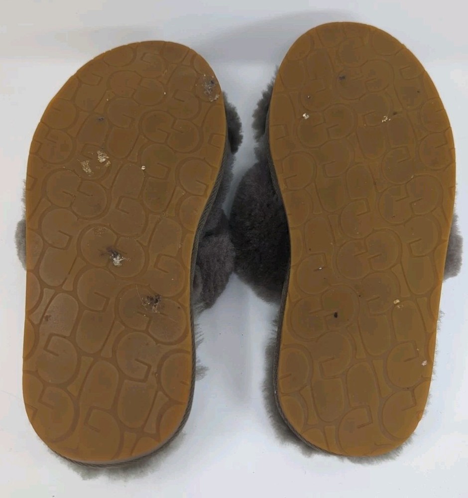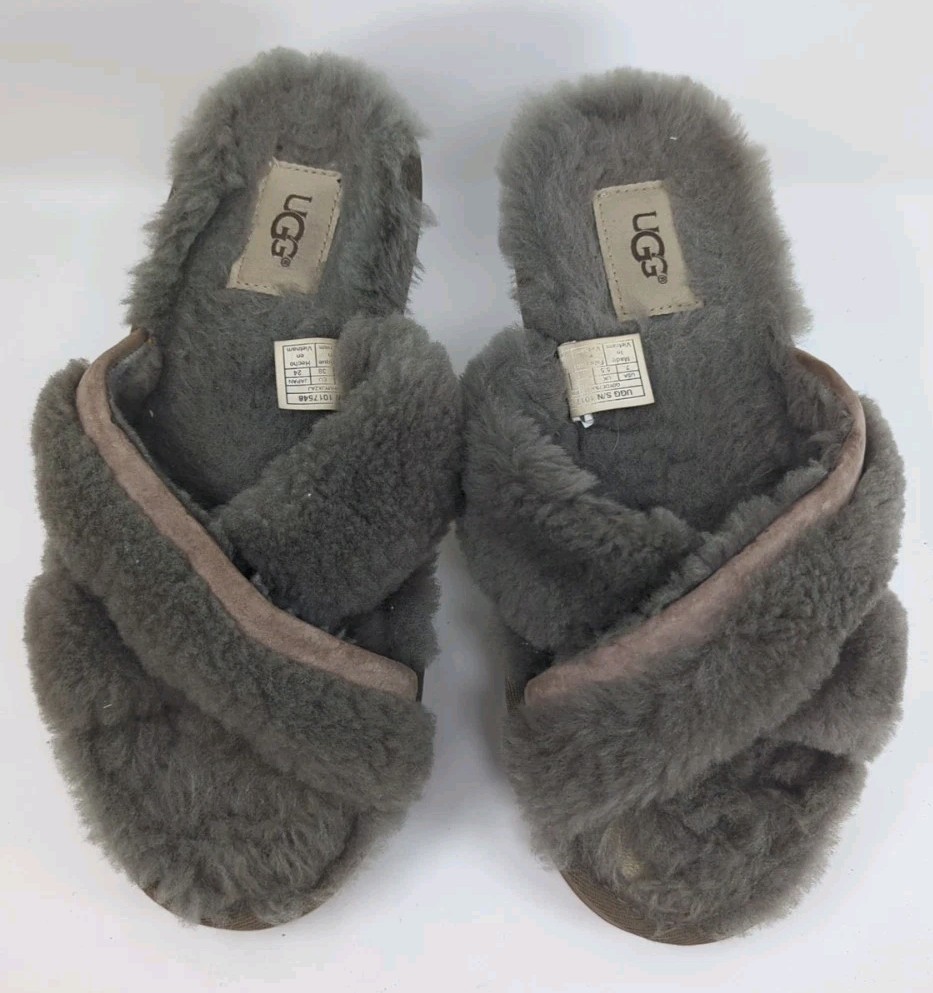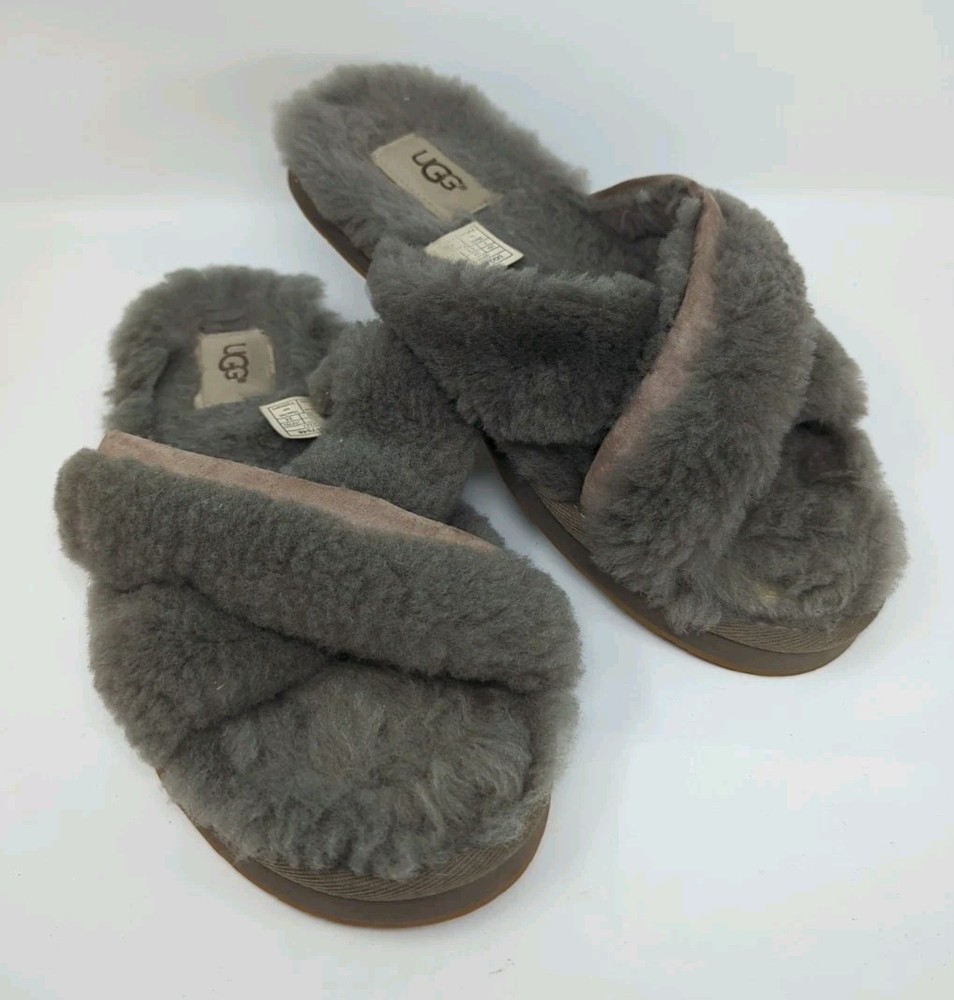 UGG ABELA SLATE FLUFFY SHEEPSKIN SLIPPERS OPEN TOE SLIDES WOMEN US 7 38 Fur Grey
