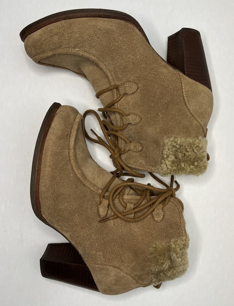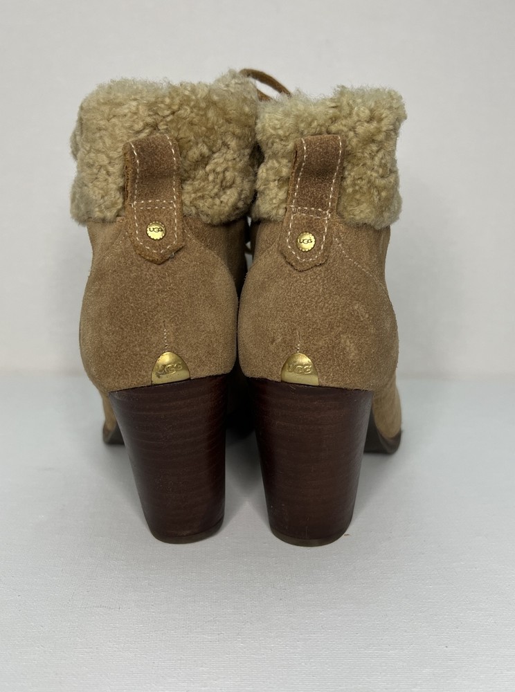 Step up your boot game with these stylish UGG Australia Analise ankle boots! Made with high-quality nubuck leather and a soft shearling cuff, these boots will keep you warm and fashionable all winter long. The lace-up closure ensures a secure fit, while the solid beige color and fur trim accents add a touch of elegance to any outfit. Perfect for casual wear, these boots are a must-have addition to your wardrobe.