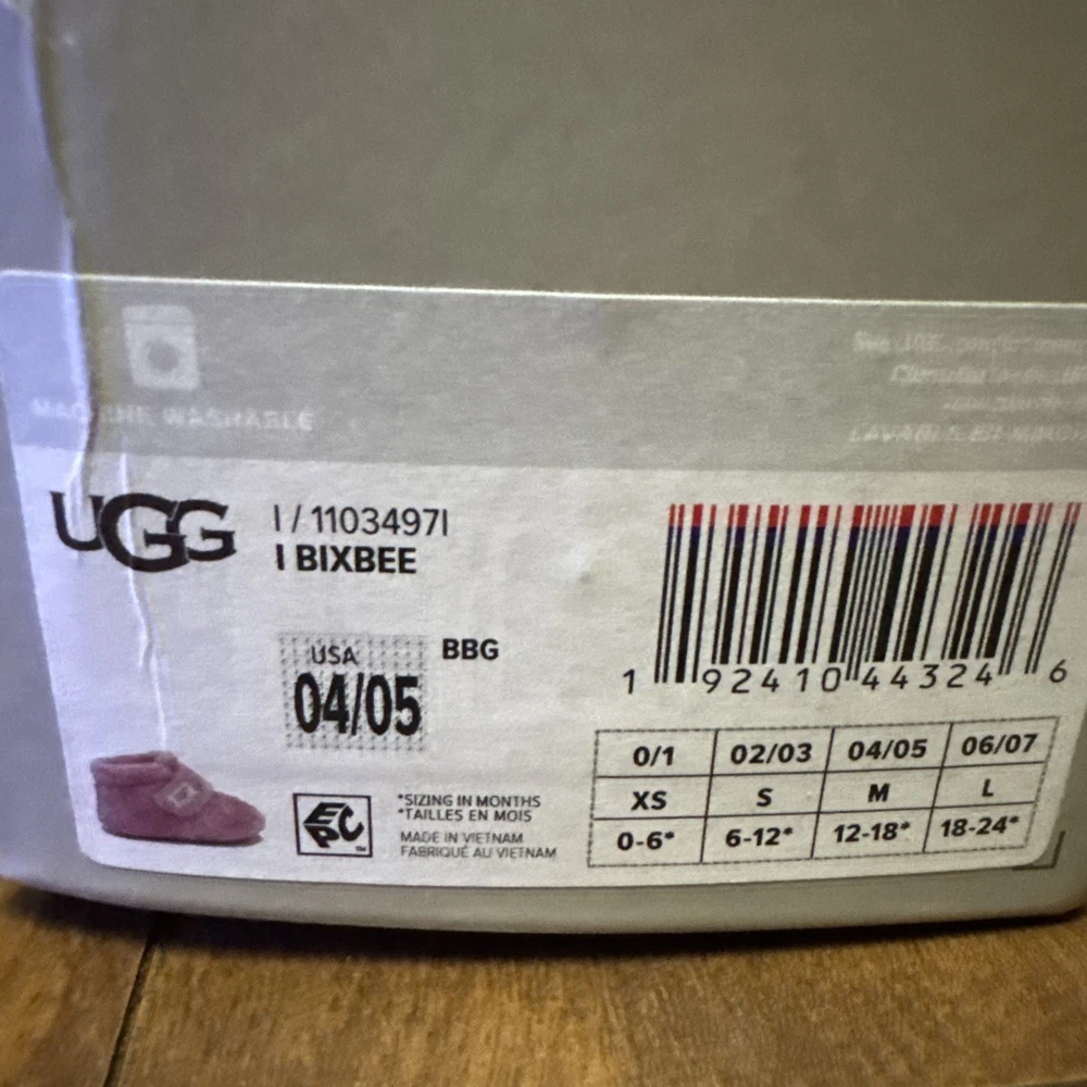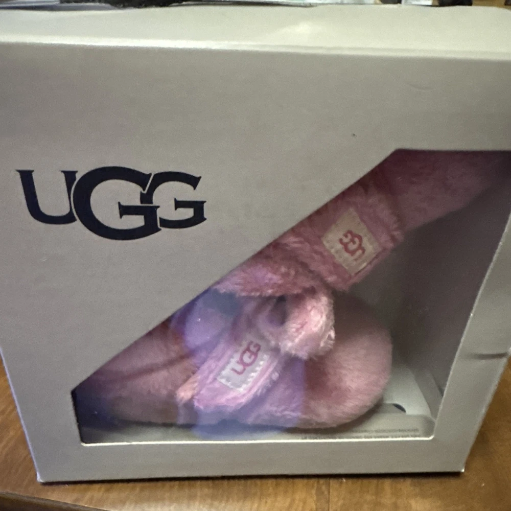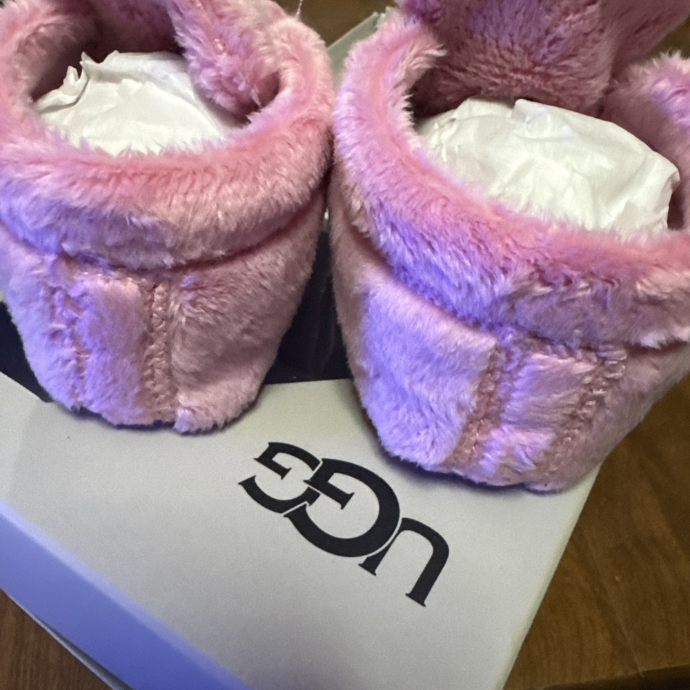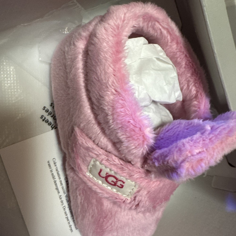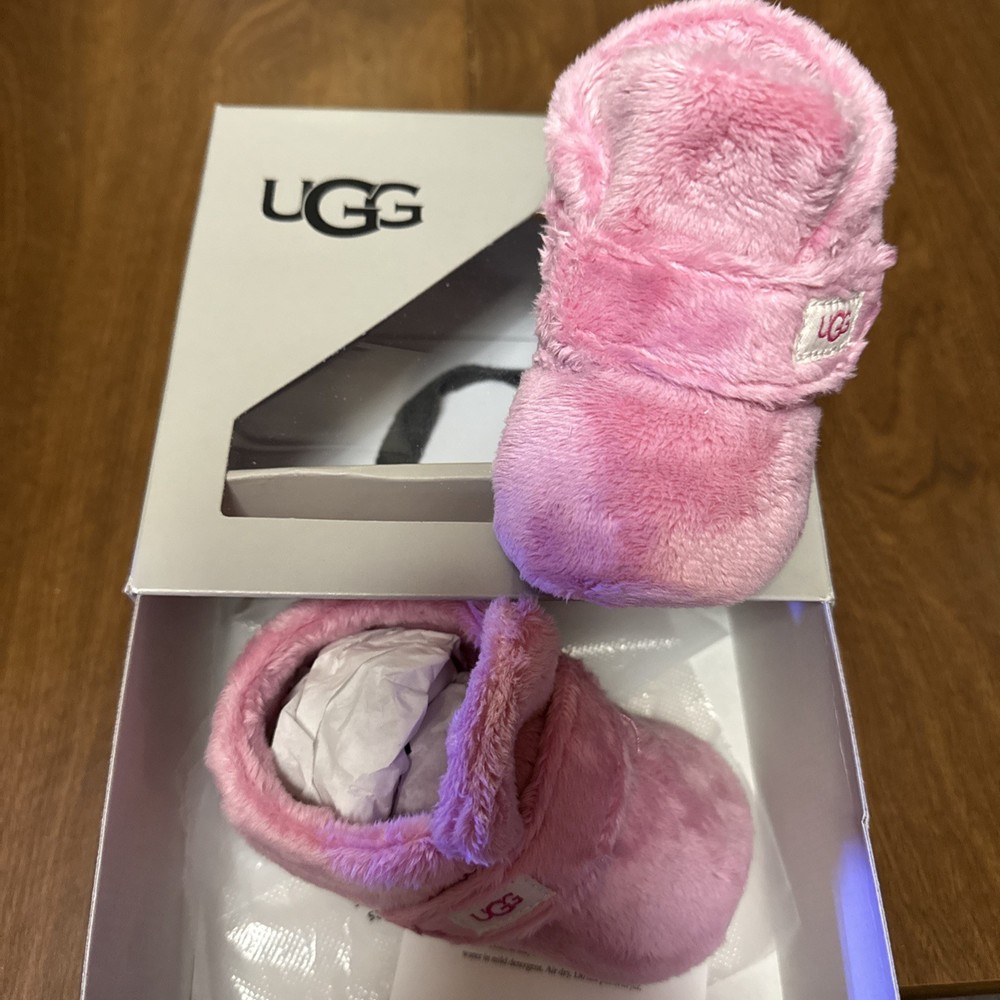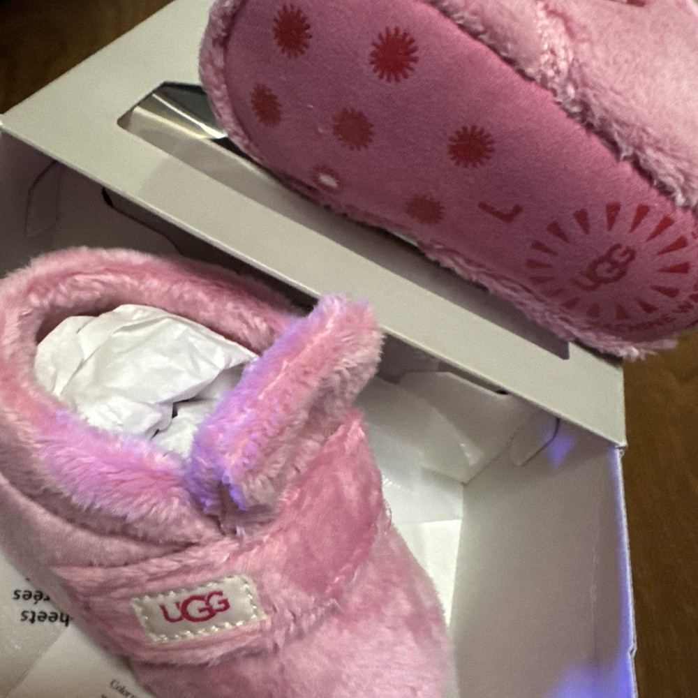 The UGG Bixbee Infant Soft Baby Booties Slippers in Bubblegum Pink are designed for babies aged 12-18 months. These ankle boots feature a hook and loop closure for easy on and off. Made with super soft polyester fabric and lining, these booties provide comfort and a cushioned feel. The slip-resistant design and lightweight construction make them suitable for various activities, from casual outings to parties or even formal events. With their adorable pink color and UGG logo accent, these booties are a stylish and versatile choice for your little one. NEW WITH BOX!!!