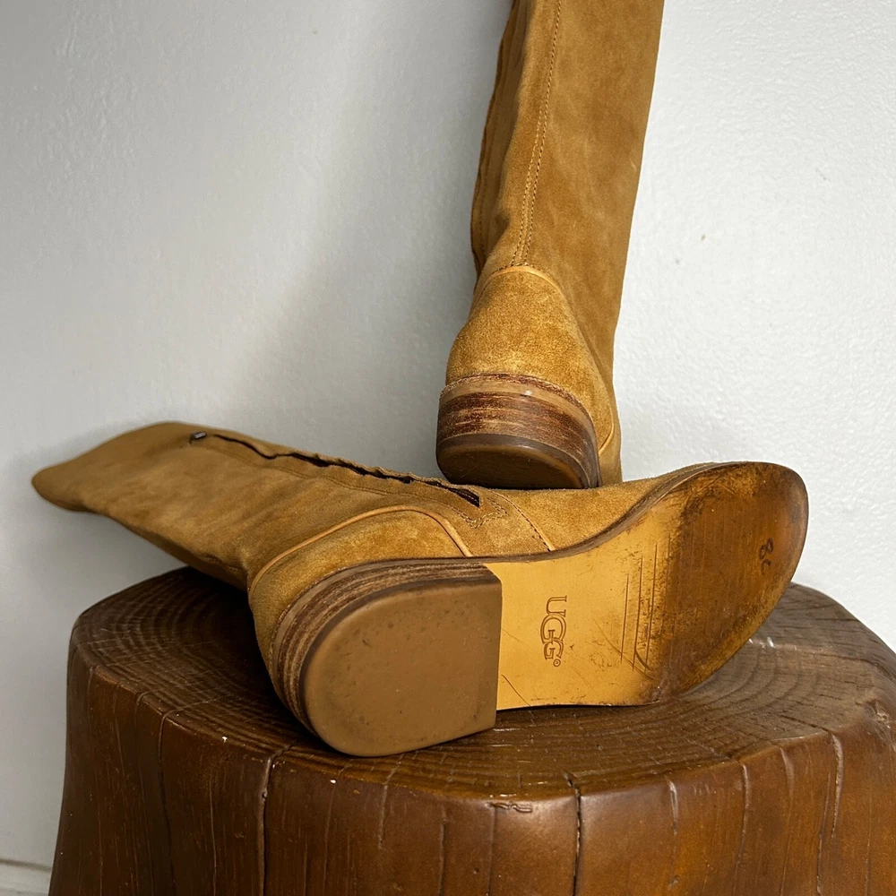 UGG 1020257 Daley Tall Equestrian Riding Boots – Chestnut Suede – US Size 5 Elevate your wardrobe with these timeless UGG Daley Tall Equestrian Riding Boots . Perfect for everyday wear or special outings, these boots combine comfort and sophistication in a classic design. Features: Brand: UGG Model Number: 1020257 Color: Chestnut (Tan) Material: Premium suede upper with leather accents Style: Tall equestrian/riding boots Size: US Women’s 5 Shaft Height: Approx. 15" Heel Height: Approx. 1" Details: Side zipper closure for easy on/off, cushioned footbed for all-day comfort Condition: Pre-owned Good Condition These boots exude a versatile style that pairs effortlessly with jeans, leggings, or dresses. Whether you're hitting the town or embracing a countryside vibe, the Daley boots offer both fashion and function. Don’t miss out on this classic UGG design—grab them before they’re gone! Feel free to reach out with any questions. Happy shopping!