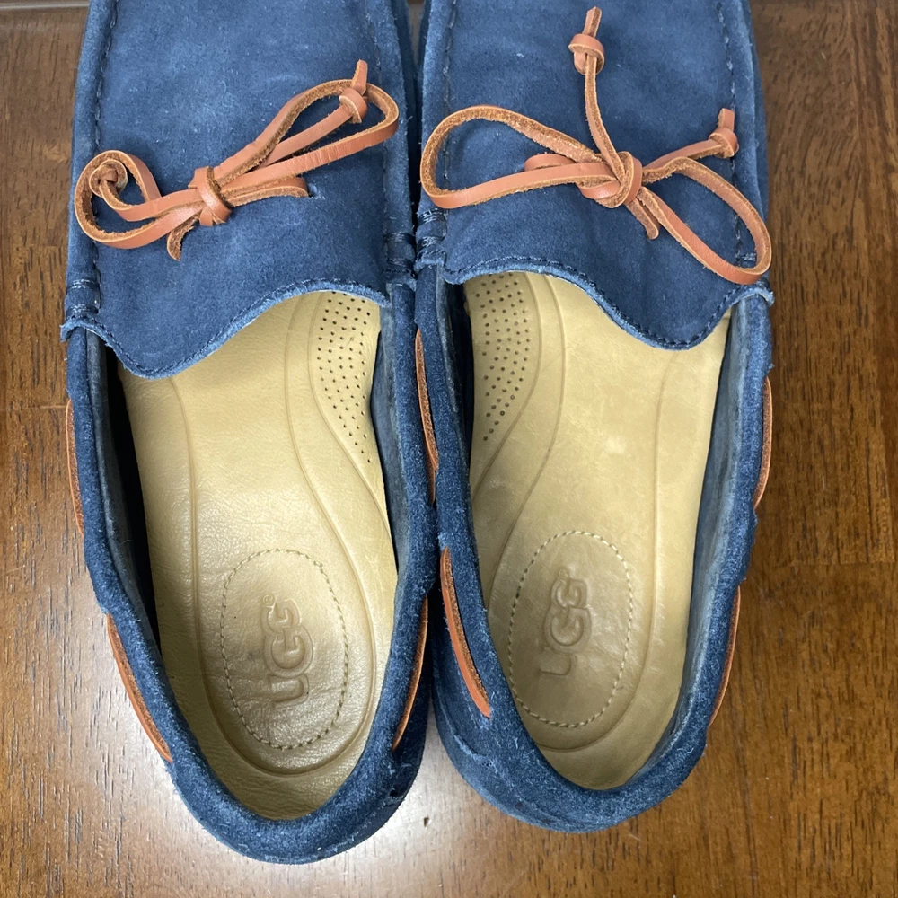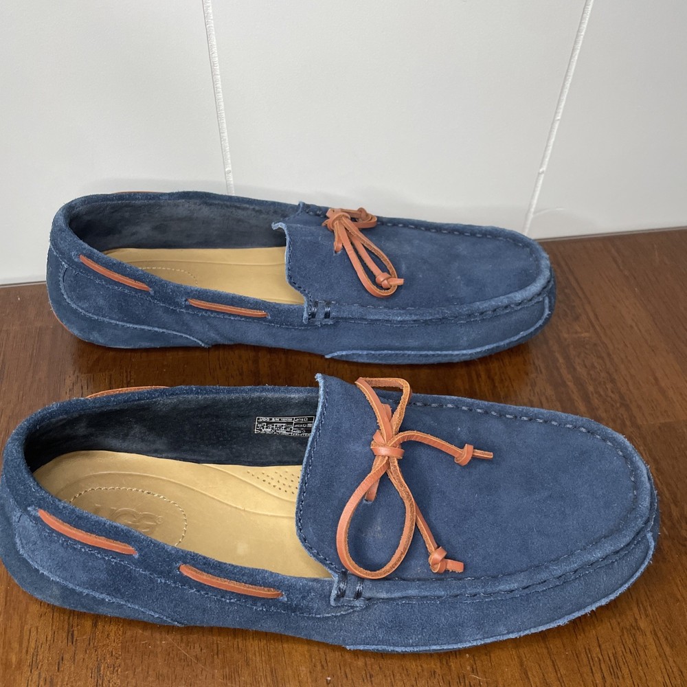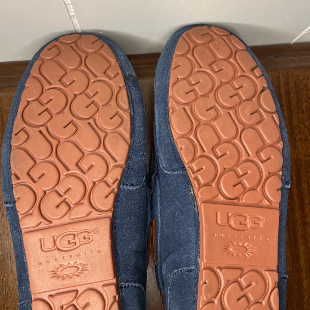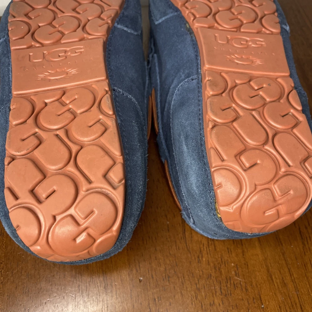 These UGG blue suede slip on loafer are in excellent condition with little to no wear. The only flaw I could find on them was the inside sizing rubbed up a little bit. Soles are still in like new condition and outside is very clean. Check out my store for more clothes! All items are packaged with care and consideration. Thank you!!