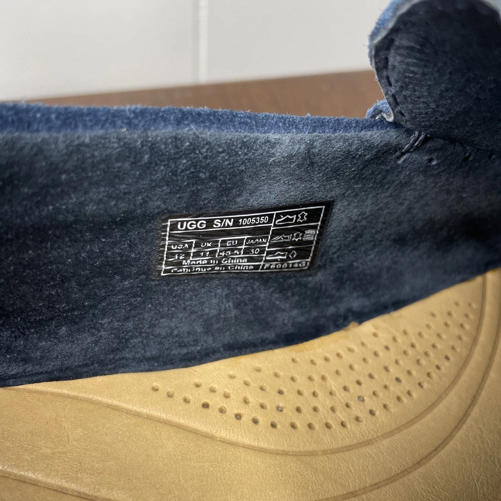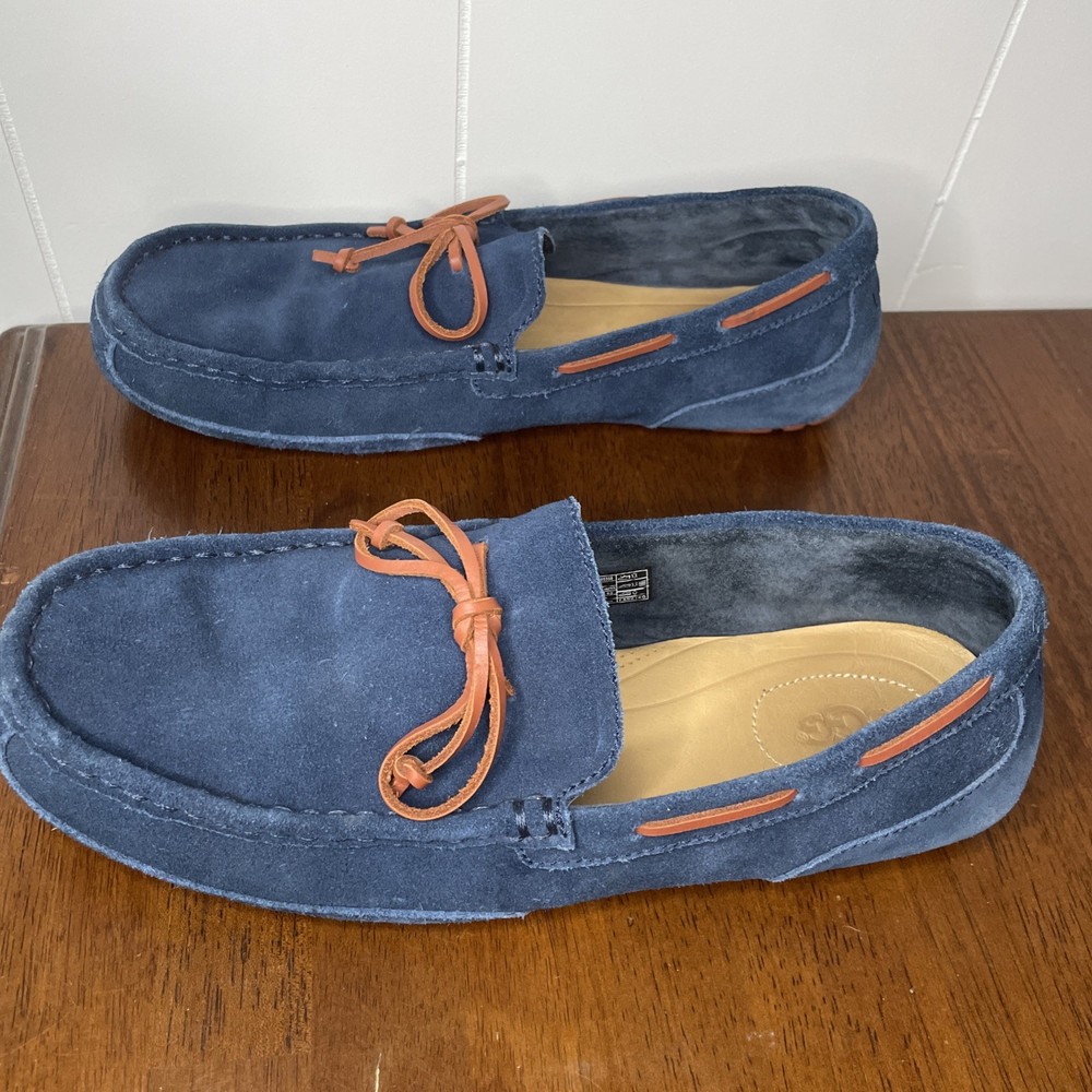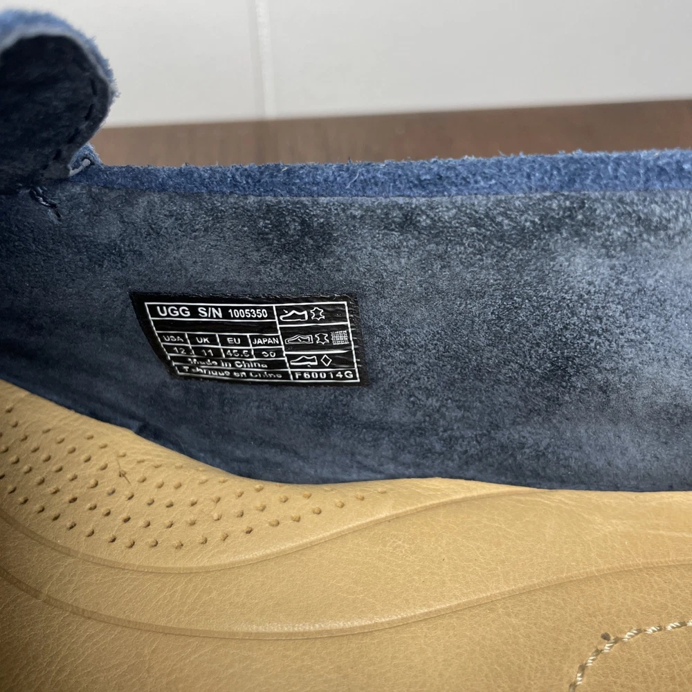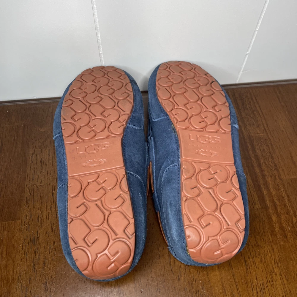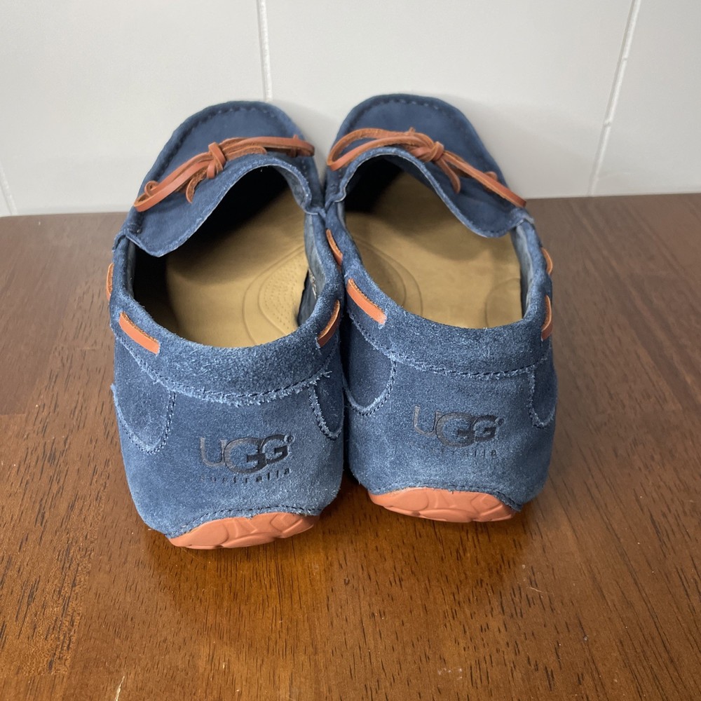 These UGG blue suede slip on loafer are in excellent condition with little to no wear. The only flaw I could find on them was the inside sizing rubbed up a little bit. Soles are still in like new condition and outside is very clean. Check out my store for more clothes! All items are packaged with care and consideration. Thank you!!