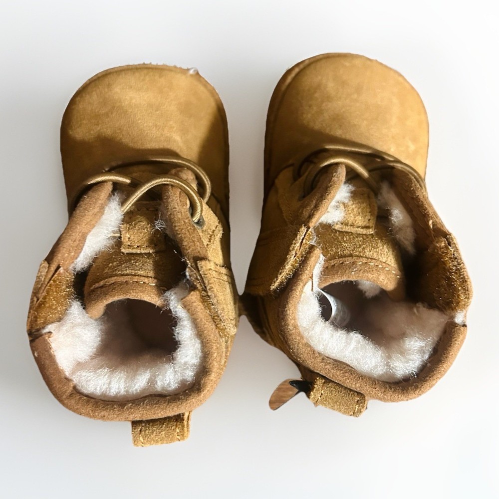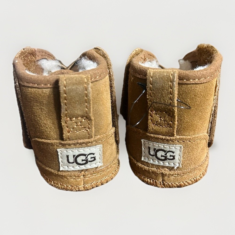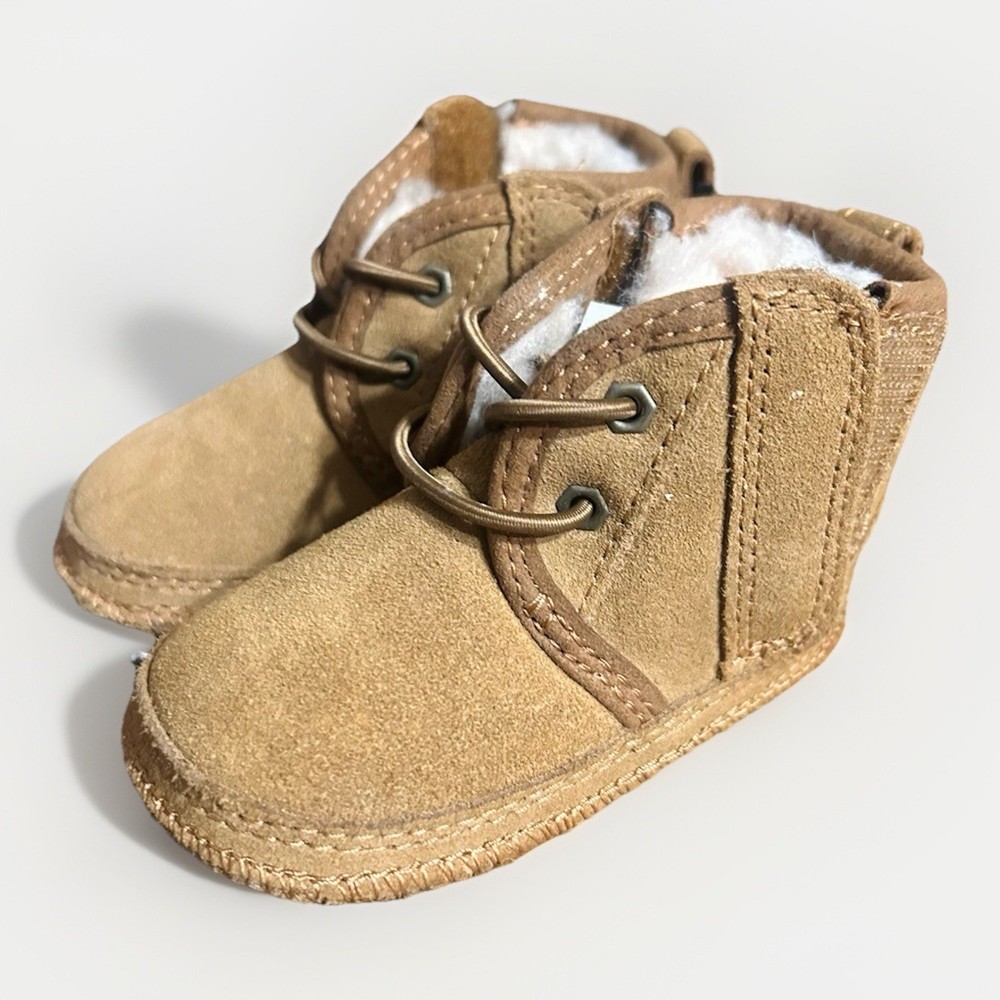 Keep their toes nice and toasty with the unique style and signature comfort of the Neumel Chukka Boot from UGG®! These little Neumel Chukka Boots sport soft suede uppers lined with luxurious fleece, and dual hook-and-loop closure for hassle-free on and off. Beanie has never been worn & the booties were only tried on.