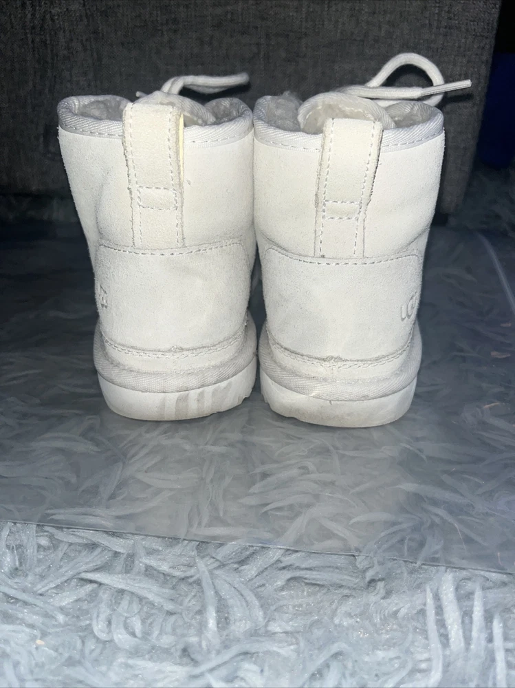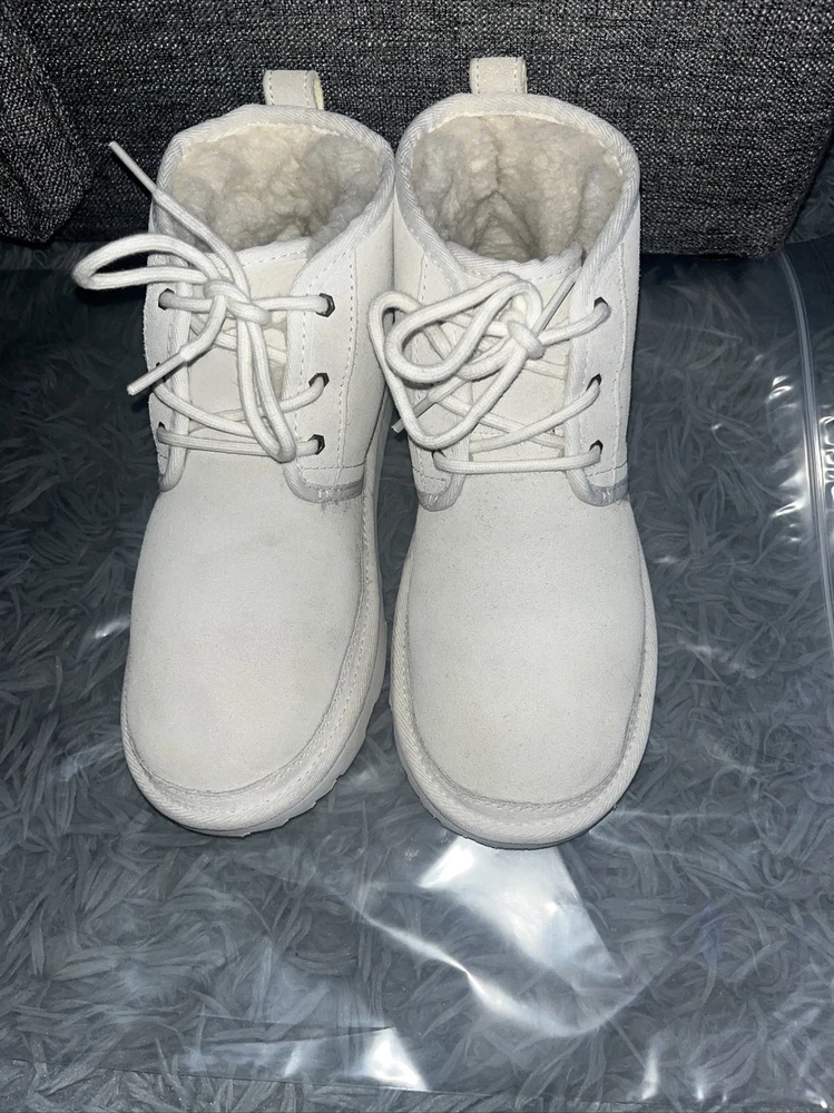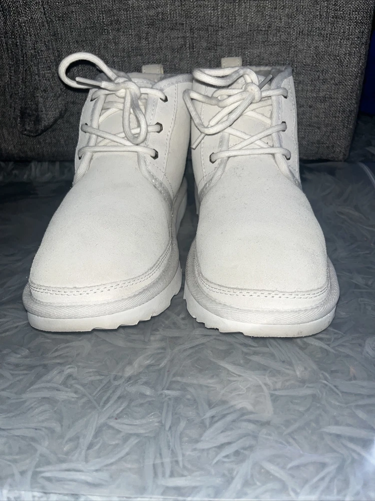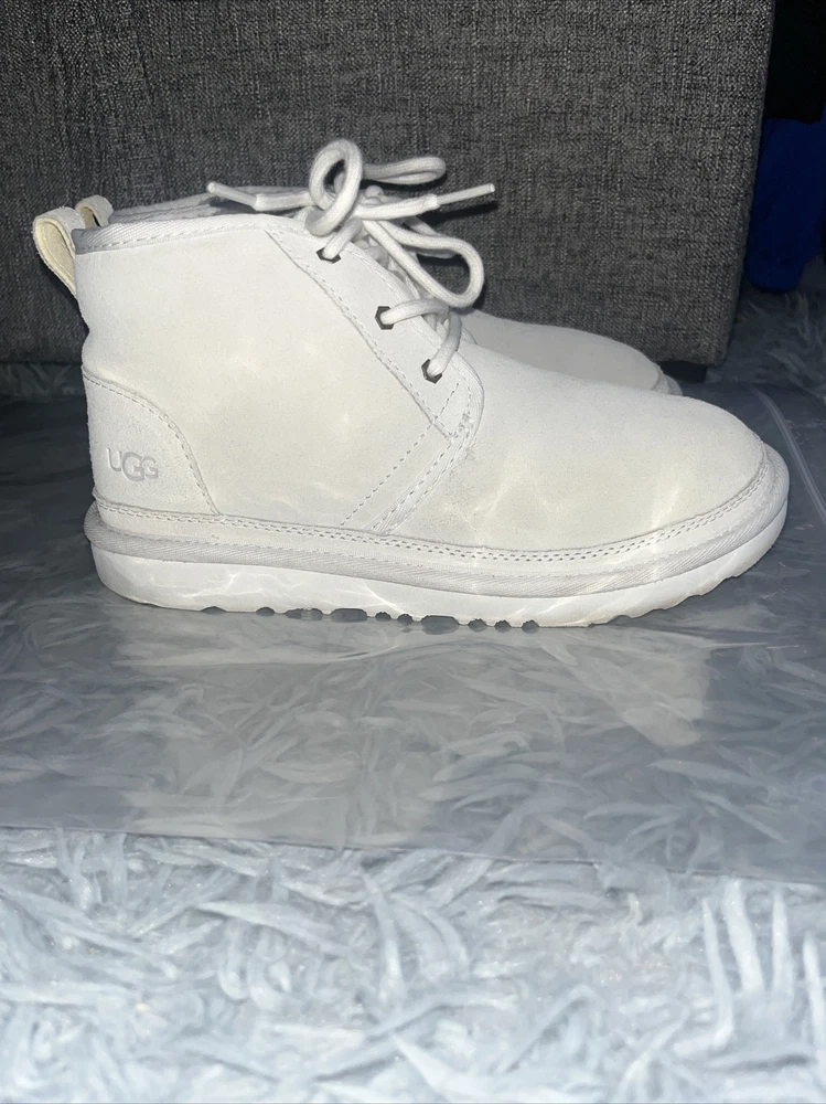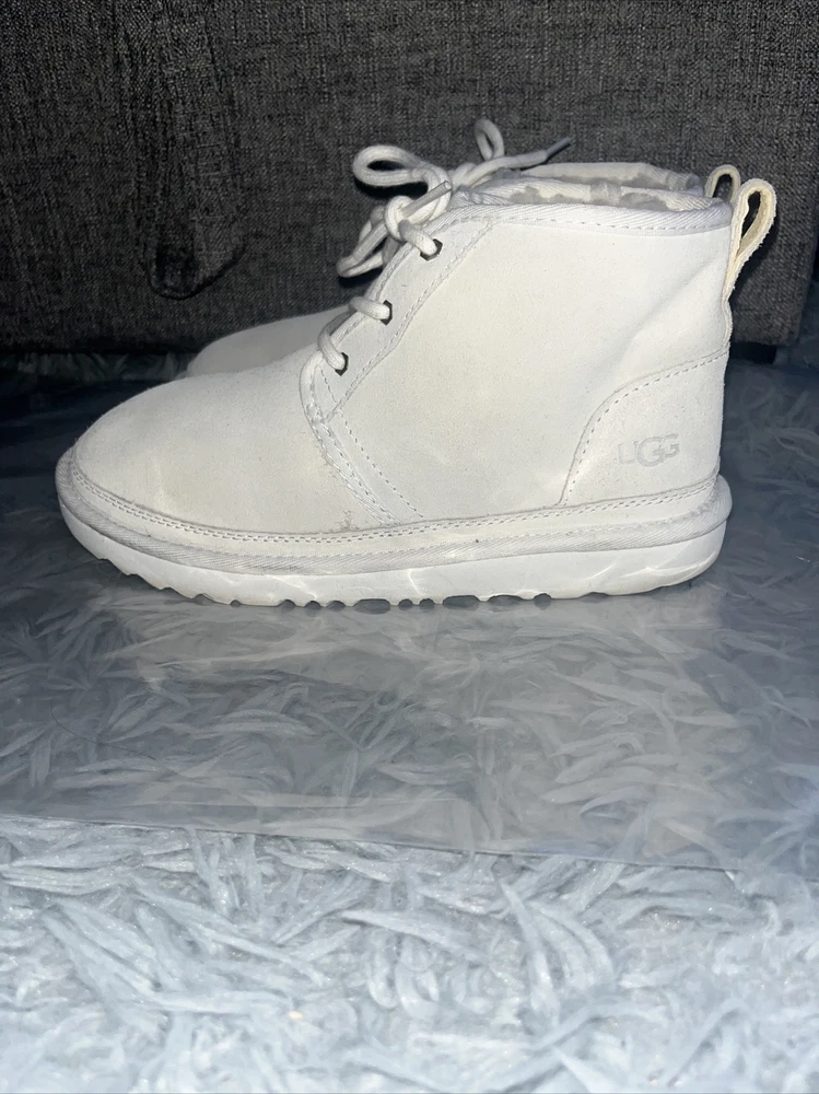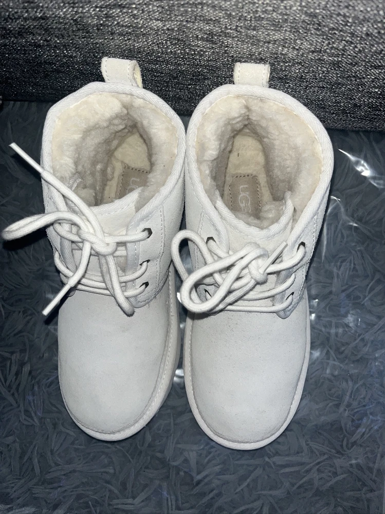 Condition: these are practically almost new (only worn 2 times) and well taken care of. Retails for $115. No box Step up your little one's shoe game with these UGG Neumel II Unisex Kid Chukka Boots in size 5. These white ankle boots feature a lace-up closure, sheepskin lining, and suede upper material, making them both stylish and comfortable. The boots are part of the UGG Neumel product line and have a unique Australian theme. Perfect for any occasion, these boots are a must-have addition to any child's wardrobe.