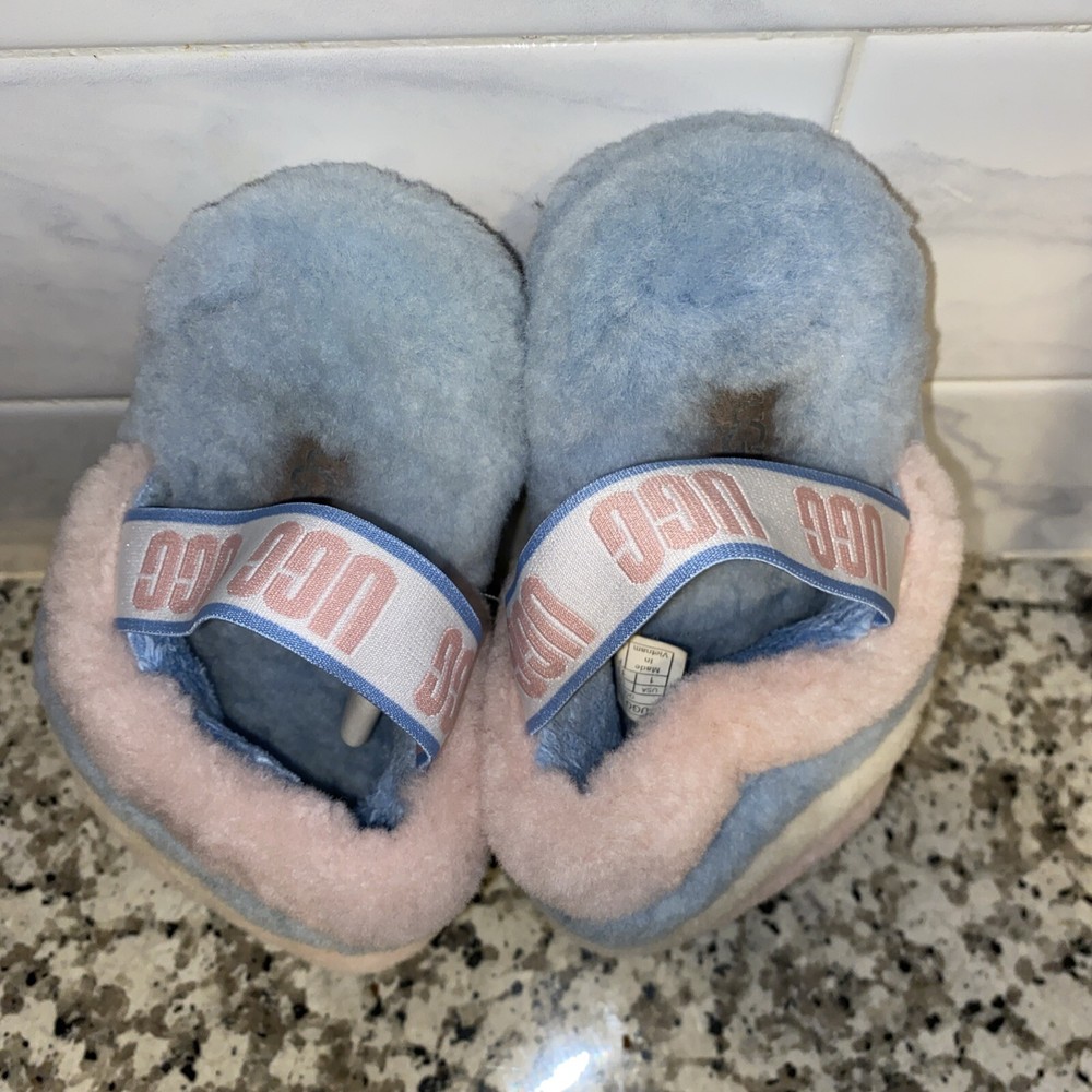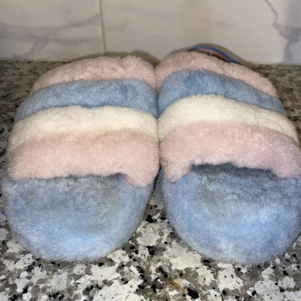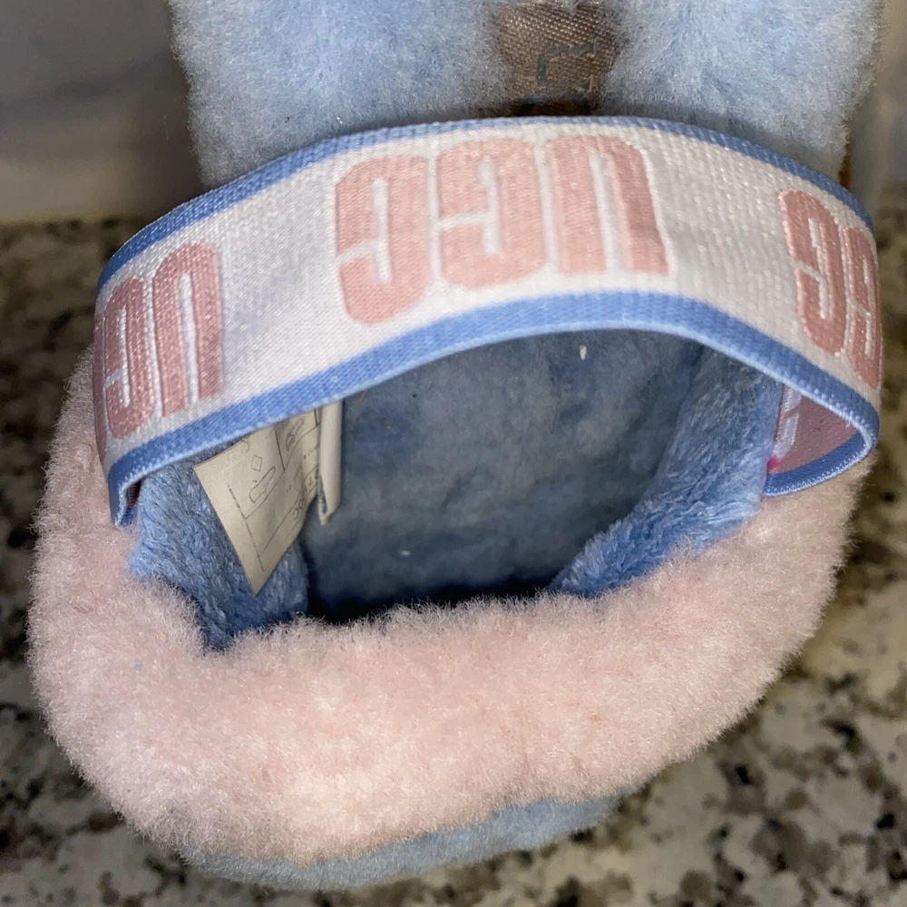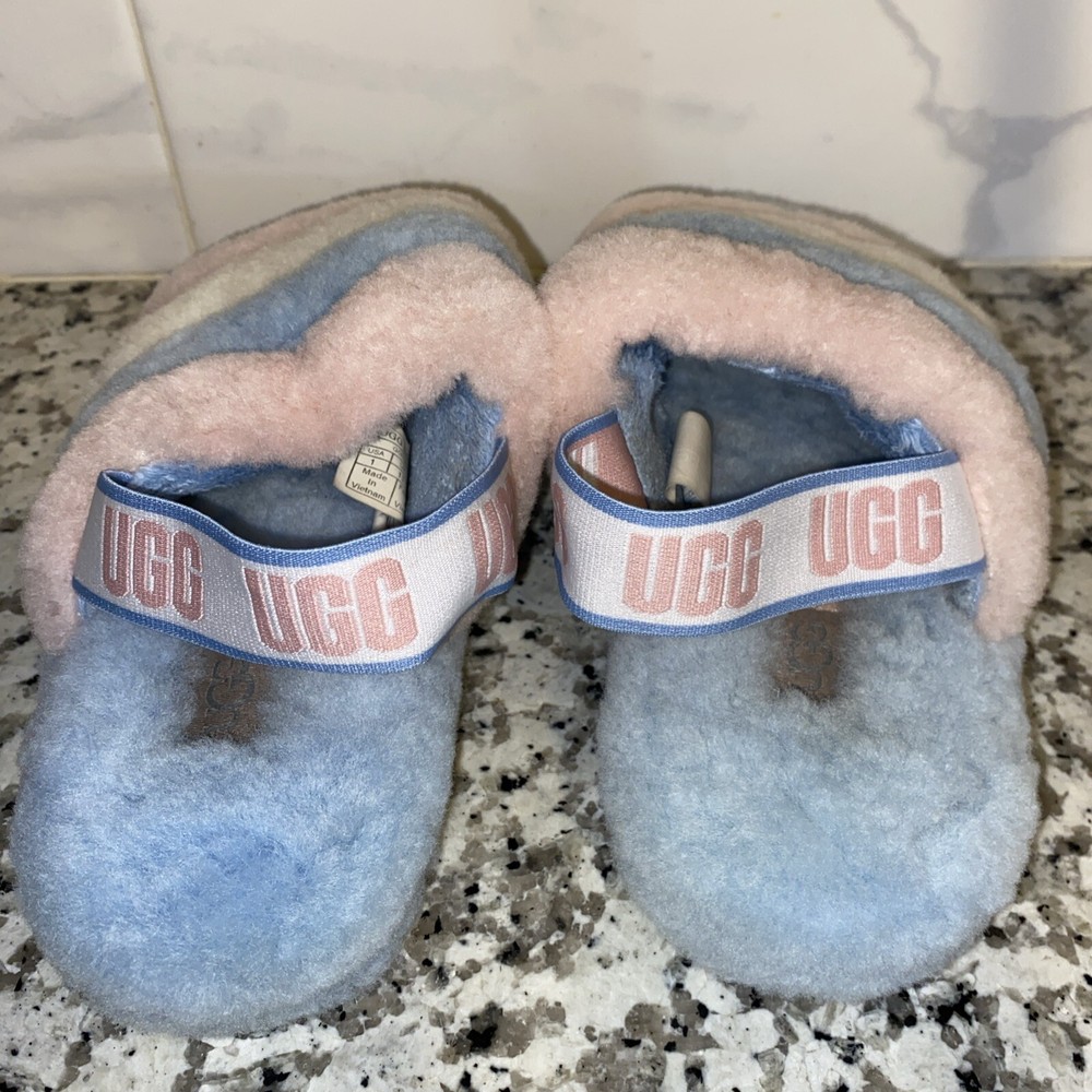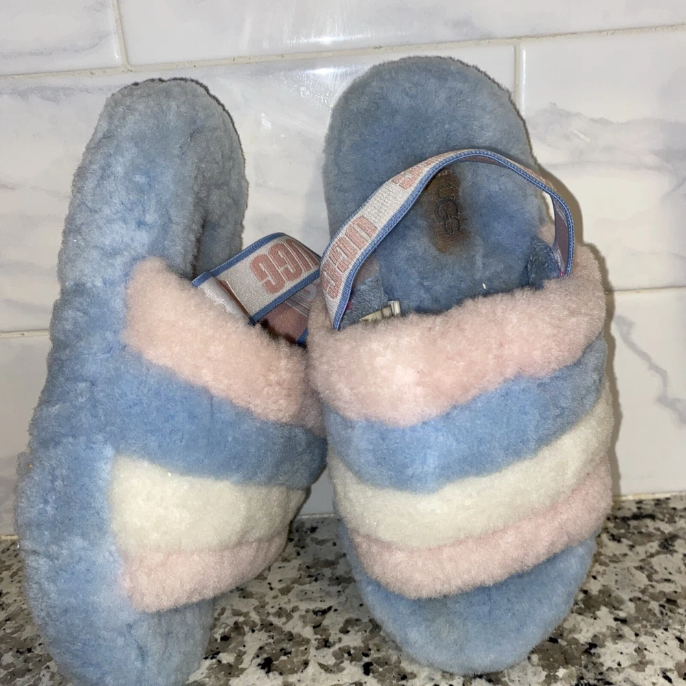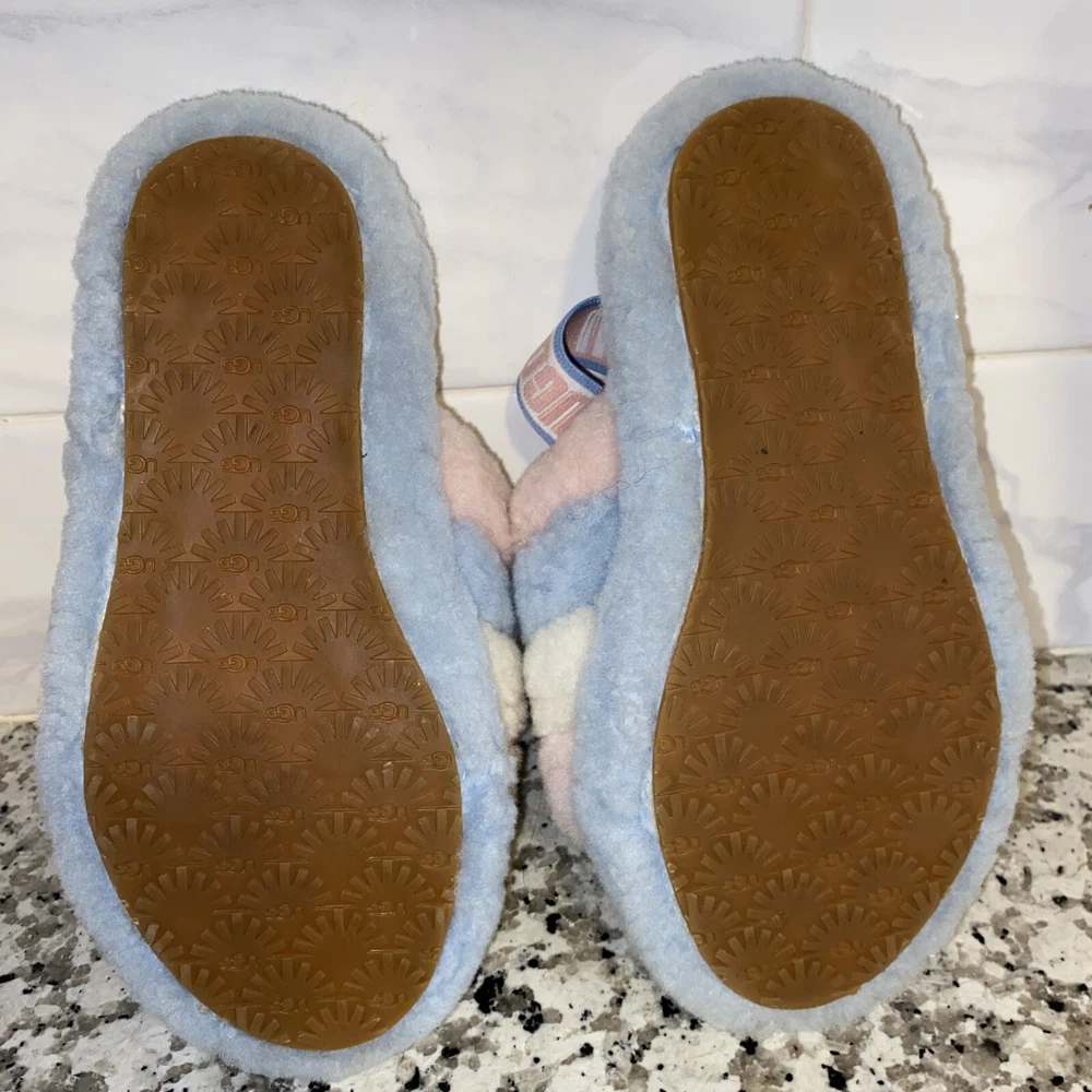 This UGG Rainbow Fluff Yeah slide sandal in multi-color is perfect for your little girl's comfort and style. Made with shearling fur upper material and lining, the sandal provides a soft and cozy feel. The rainbow design adds a fun touch to any outfit, while the slide style makes it easy to wear. The sandal is available in kids' size 1 and is part of the UGG Comfort Slide product line. It features a durable construction and is a great addition to any young girl's shoe collection.