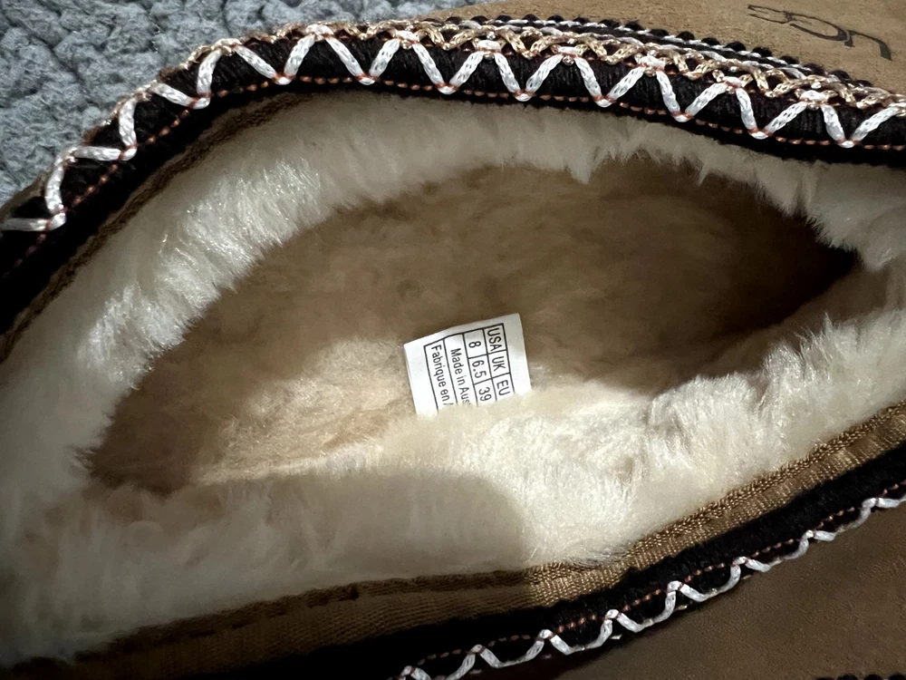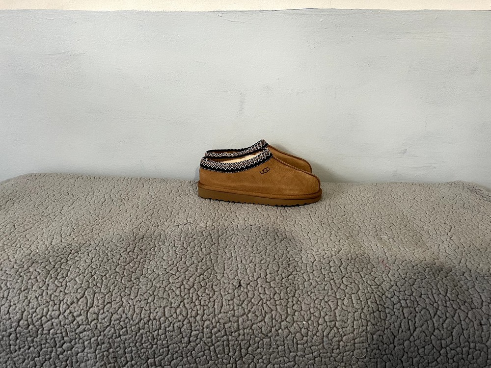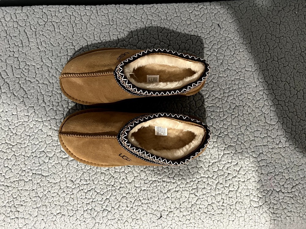 The UGG Size 8 Women's Tasman Slipper in Chestnut is a stylish and comfortable slip-on style shoe perfect for women. Made with suede upper material in a rich brown color, these slippers feature the signature UGG Australia Tasman model. With a US shoe size of 8 and a UK shoe size of 7, these slippers are designed for women who appreciate both fashion and comfort in their footwear. The slipper's soft design and quality materials make it a perfect choice for lounging around the house or running quick errands. Go A Half Size Up.