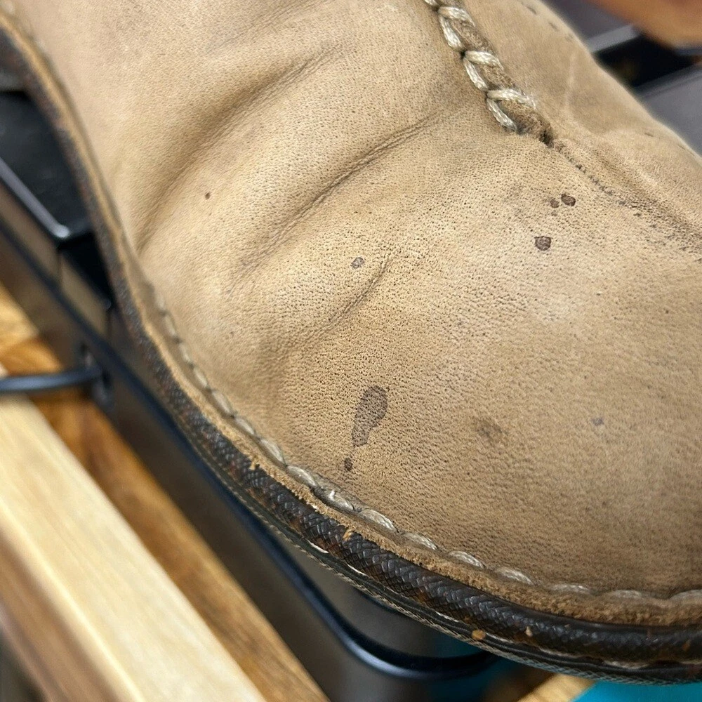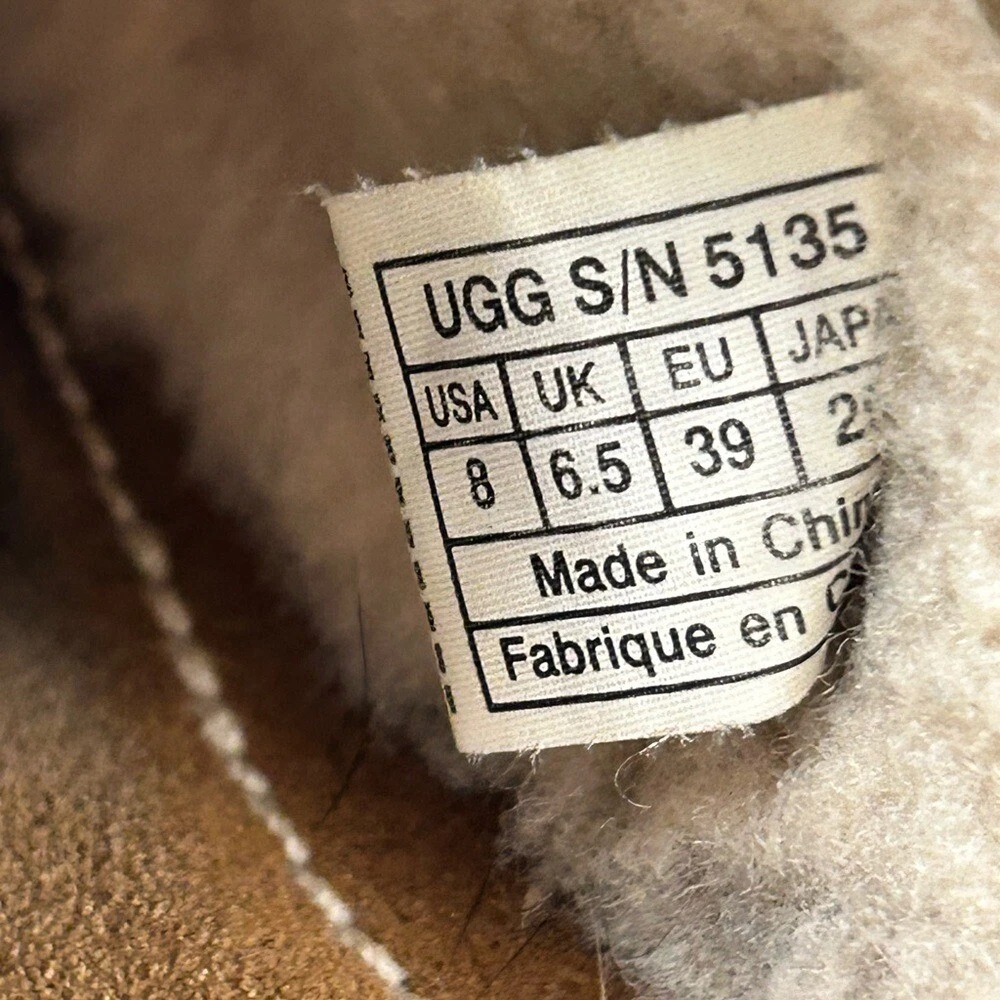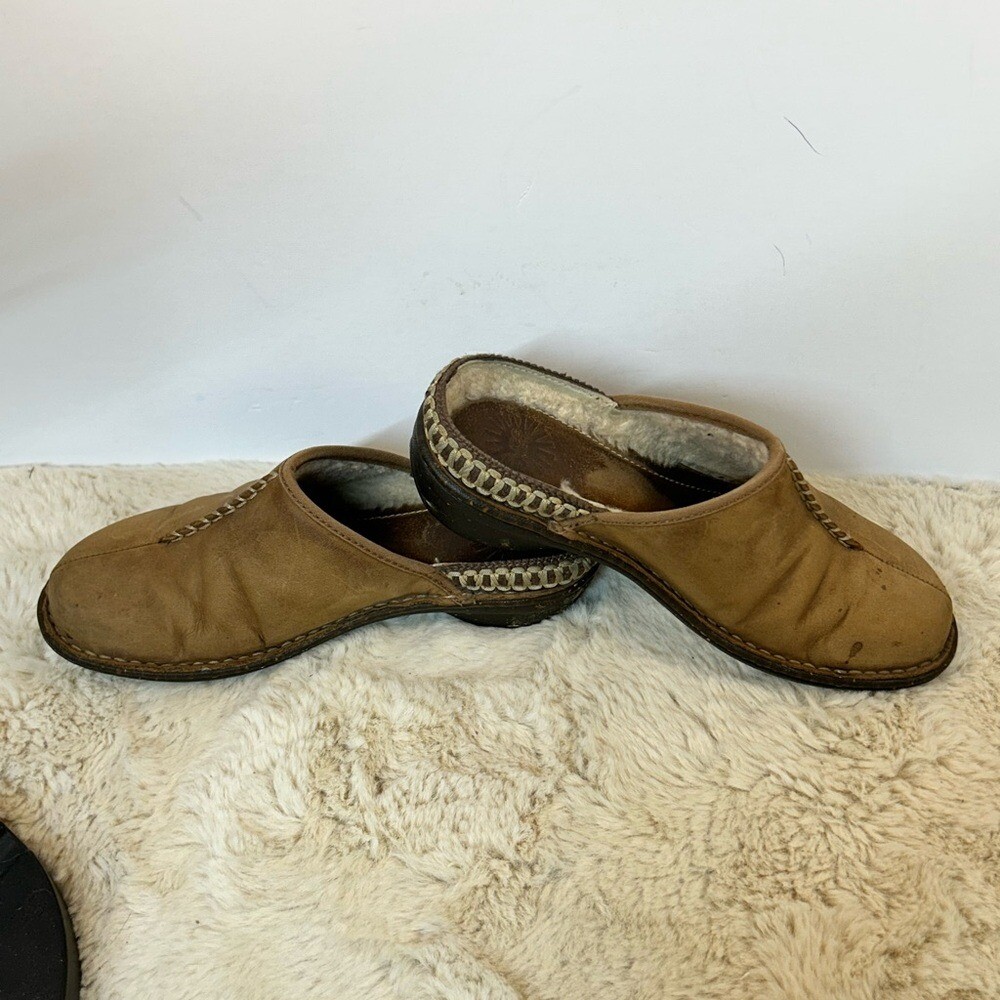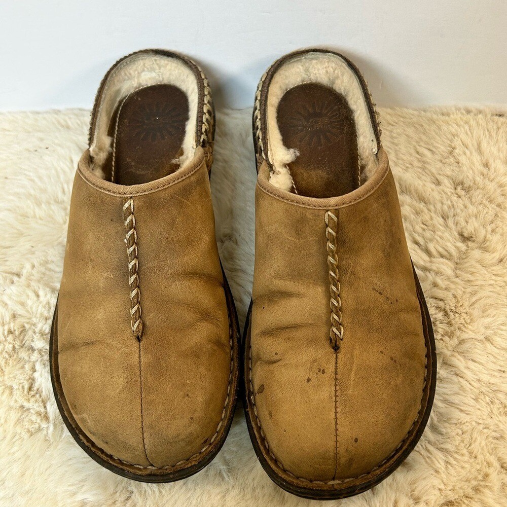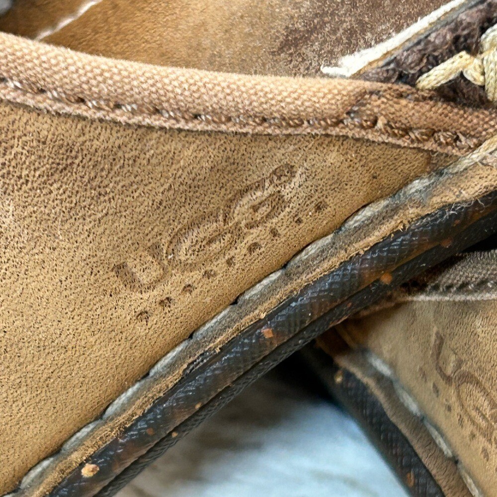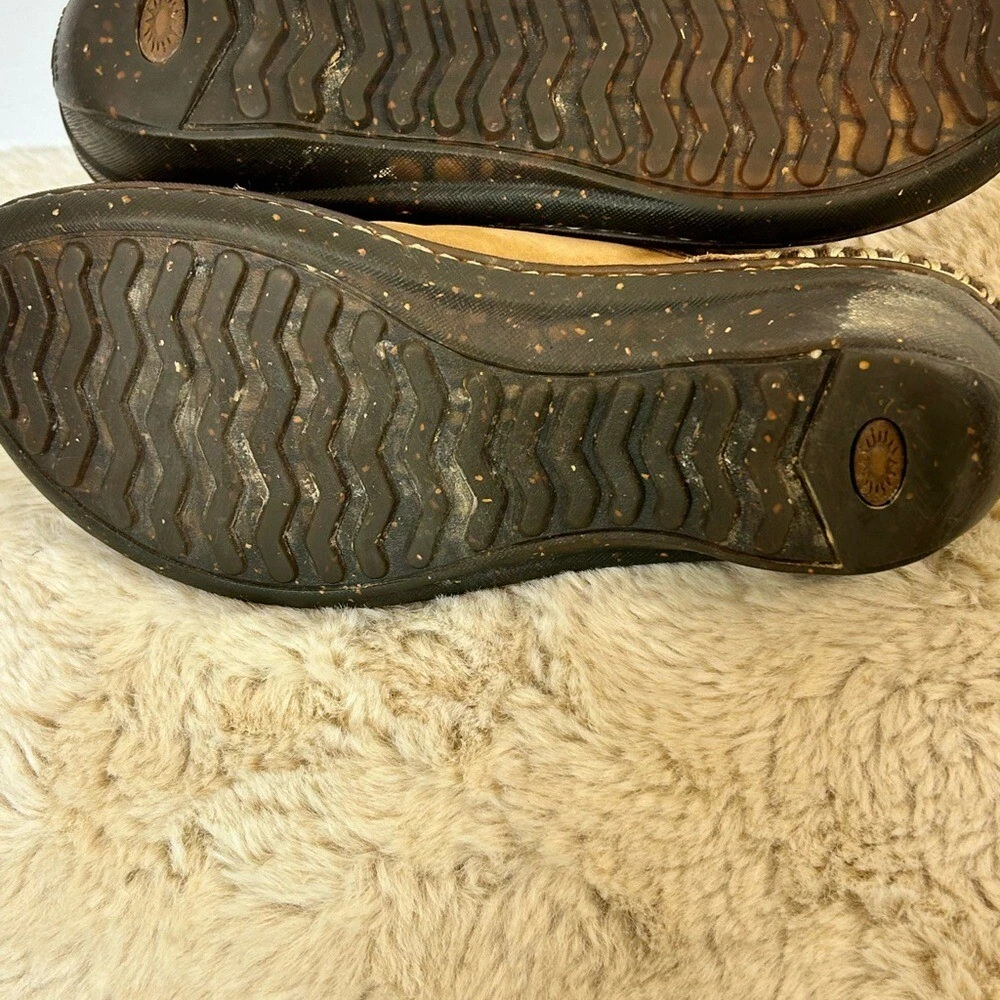 Step into comfort with these UGG Tan Slip-On Loafers, crafted from soft suede for a relaxed fit. The rounded toe and subtle stitching details add a touch of style, while the durable sole ensures lasting wear. Perfect for casual outings or lounging at home, these loafers offer effortless style and comfort. Note spots in pic 1.5