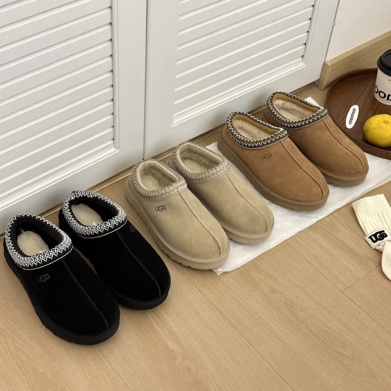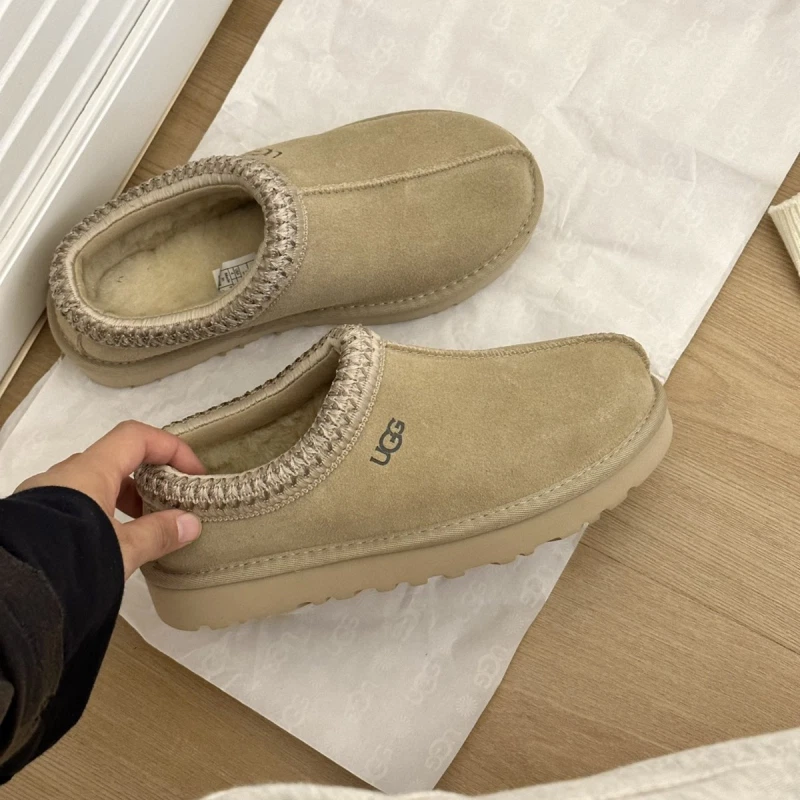 Suede upper, sheepskin and wool lining and insole, UGG braid trim A slipper for all occasions, our best-selling Tasman features the same light, durable outsole as our Classic boot, so you can wear it both indoors and out. Lined with plush natural wool, it’s crafted from soft suede with an embroidered braid and easy slip-on silhouette. Pair with boyfriend jeans and a knit sweater.