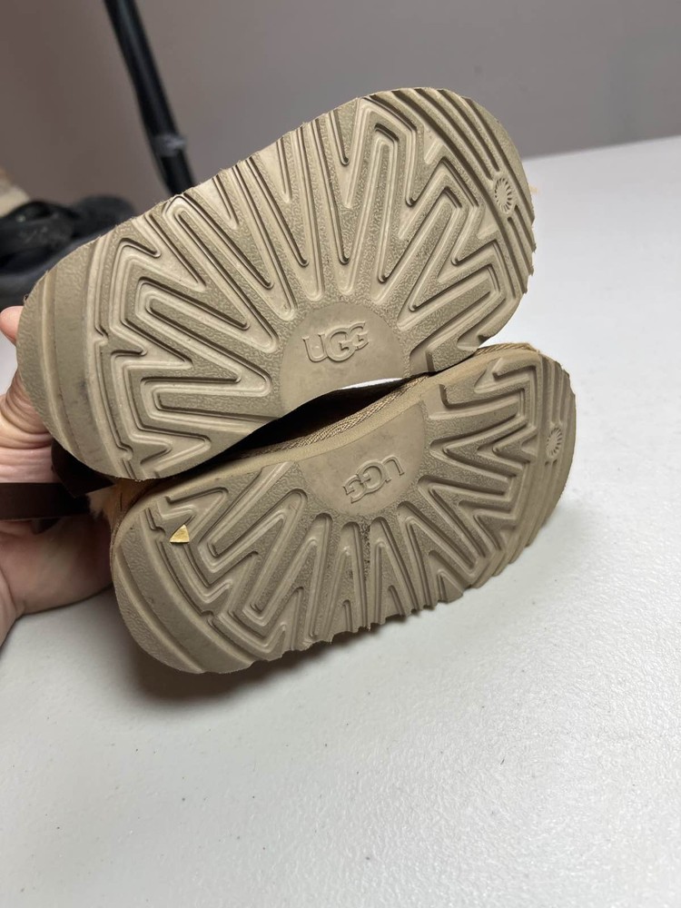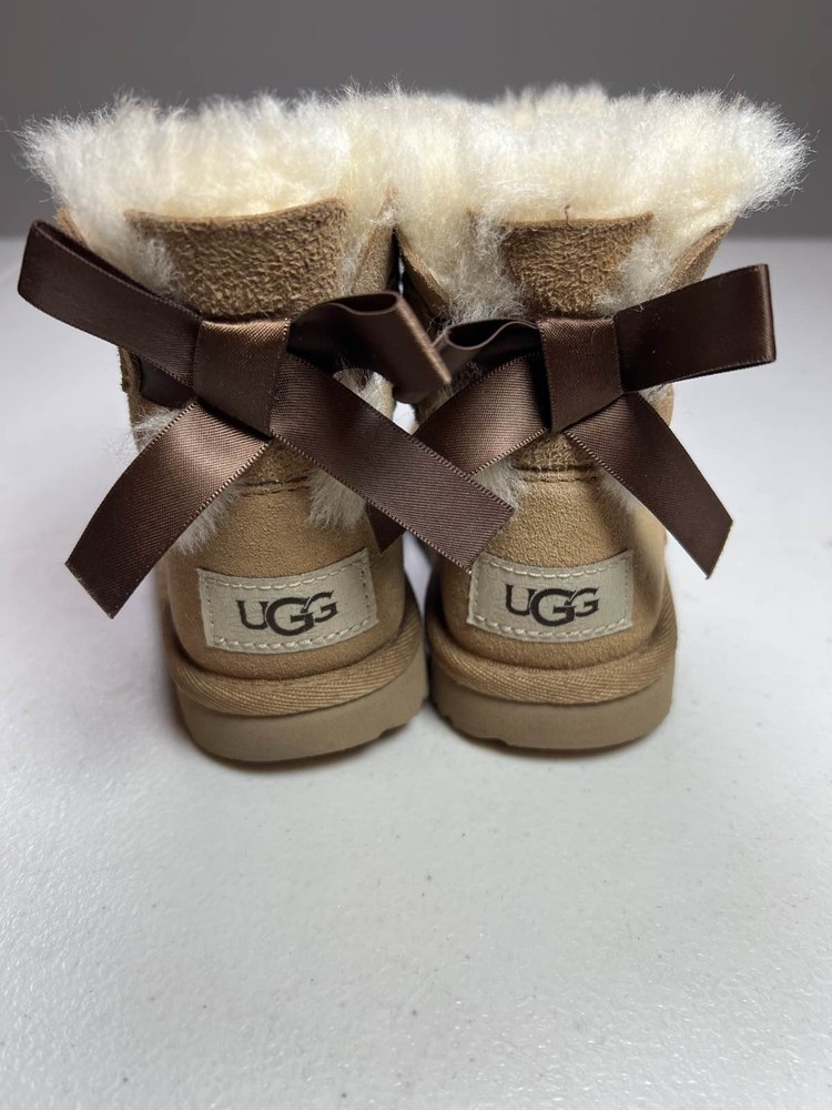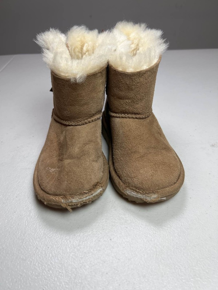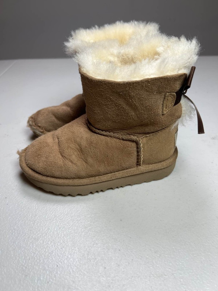 Dress your little one in ultimate comfort and charming style with these UGG Mini Bailey Bow II boots for toddlers. These well-known UGG boots feature a plush sheepskin lining, providing exceptional warmth and softness for tiny feet. The classic silhouette is elevated with sweet satin bows at the back, adding a touch of adorable detail that makes these boots a favorite for any young child. Crafted with a durable suede upper, these UGG Mini Bailey Bow II boots are designed for everyday adventures. The sturdy sole offers support, making them suitable for active toddlers exploring their world. Easy to pull on and off, they are a practical choice for parents and a cozy delight for kids, suitable for chilly days or simply adding a cozy touch to any outfit. This previously owned pair is in good condition, offering the well-regarded UGG comfort and style at a good price. These UGG Mini Bailey Bow II boots are a timeless addition to any toddler's wardrobe, providing both warmth and an undeniably cute aesthetic.