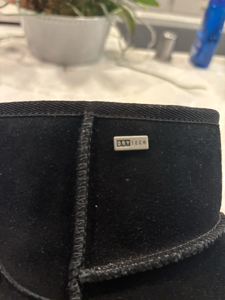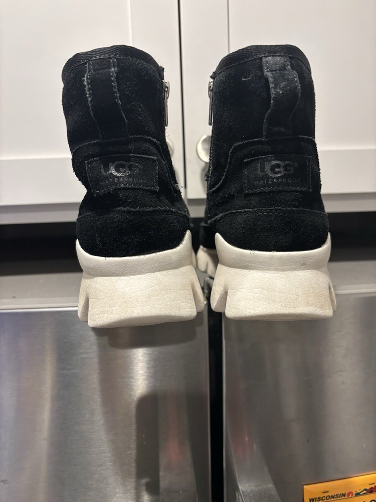 Step into comfort and style with these UGG women's boots. The black suede material and white soles create a chic and timeless look that will complement any outfit. The boots feature a zipper closure for easy wear and a Dry Tech lining to keep your feet dry and comfortable. These shoe boots are perfect for any occasion, whether you're running errands or going out for a night on the town. The UGG brand is known for its quality and comfort, and these boots are no exception. Don't miss out on the opportunity to add these stylish boots to your shoe collection.