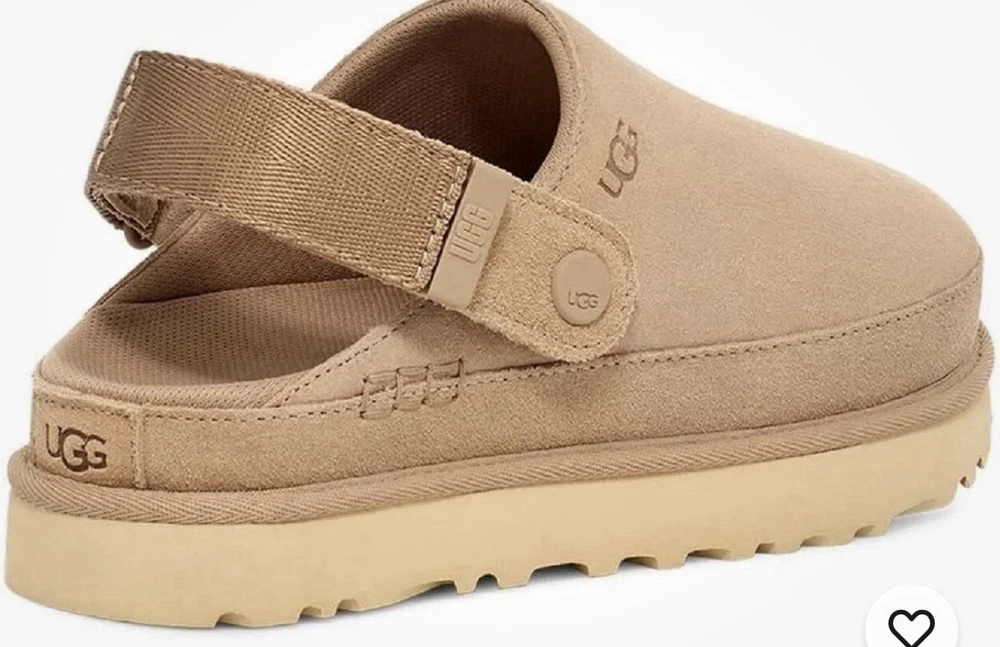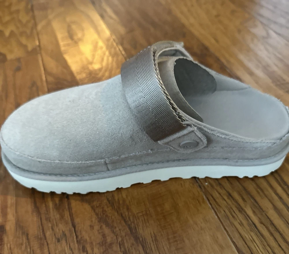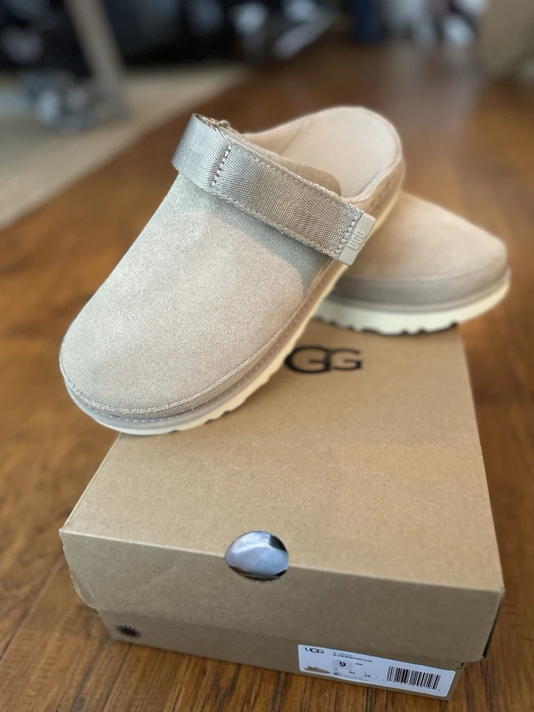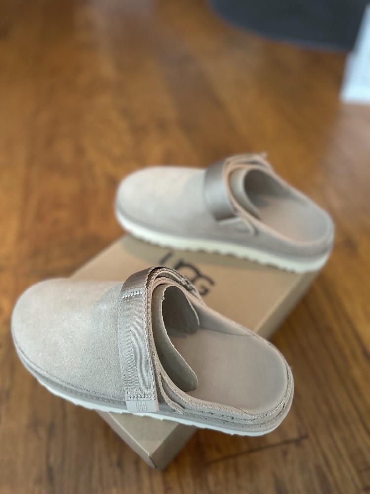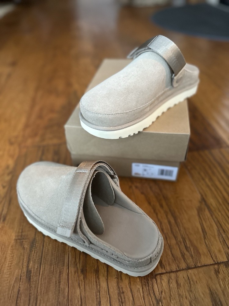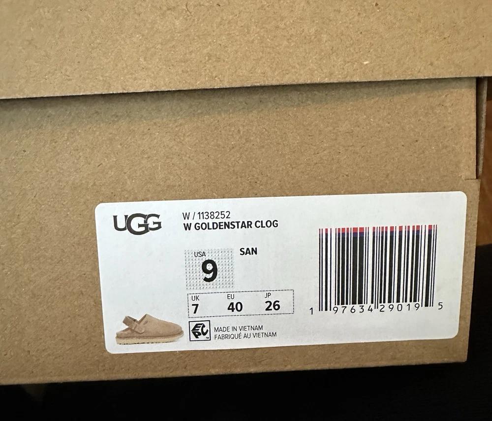 New with box! The UGG Women's Goldenstar Clog Slippers in sand color, size 9, are a stylish and comfortable choice for women looking for a cozy yet fashionable slipper. These clog-style slippers feature a beige color that adds a touch of elegance to the overall look. With the UGG brand known for its high-quality footwear, these slippers are sure to provide both comfort and style for any woman's wardrobe.