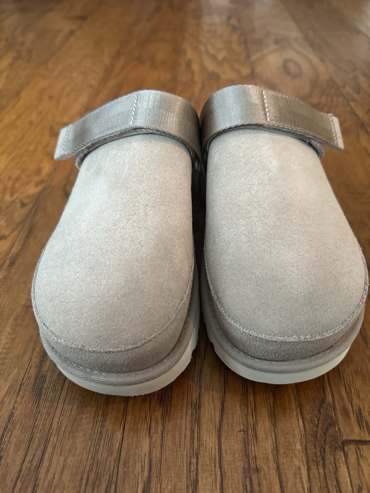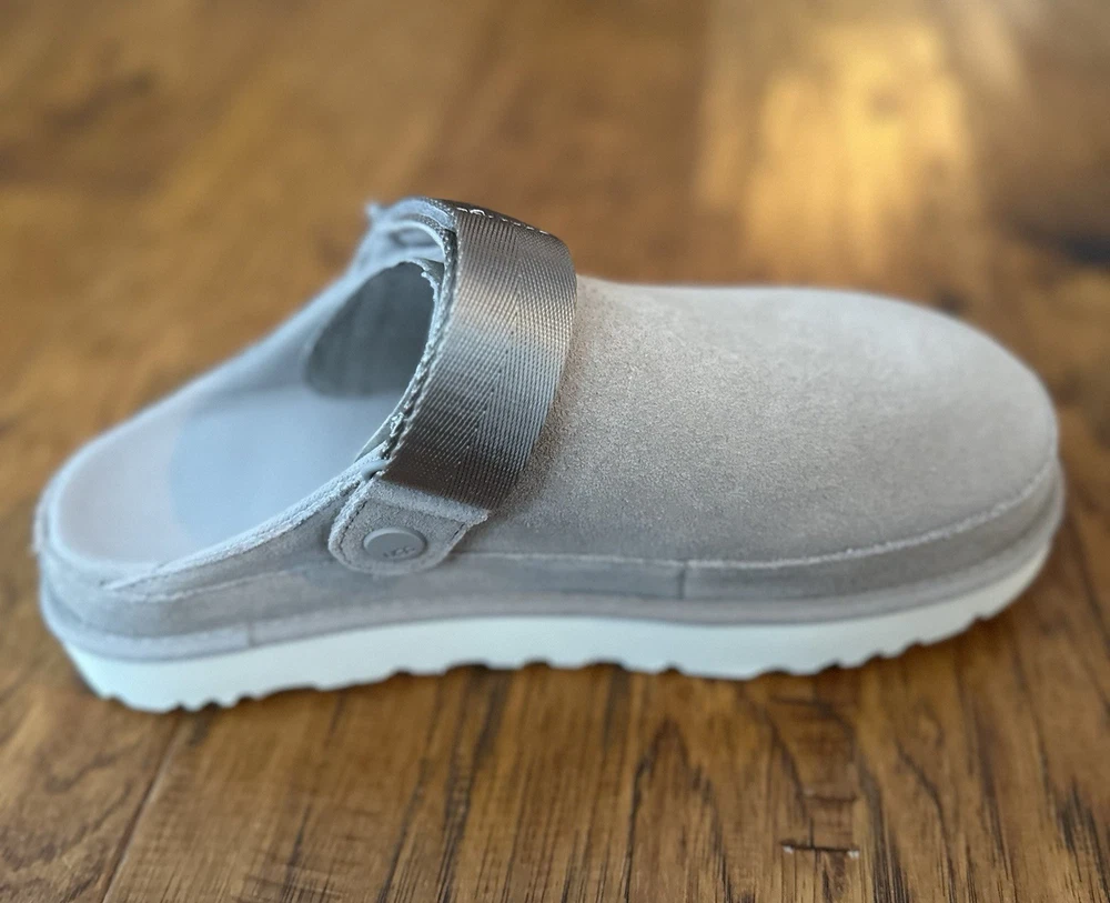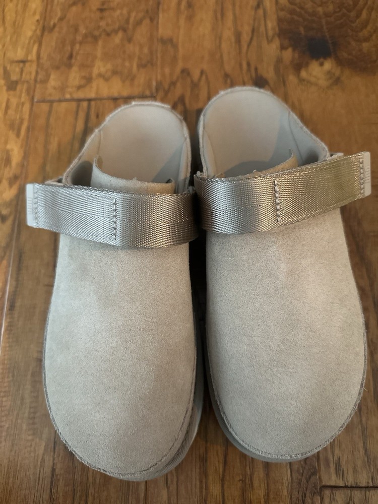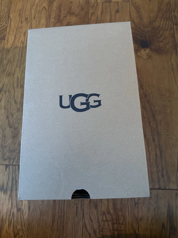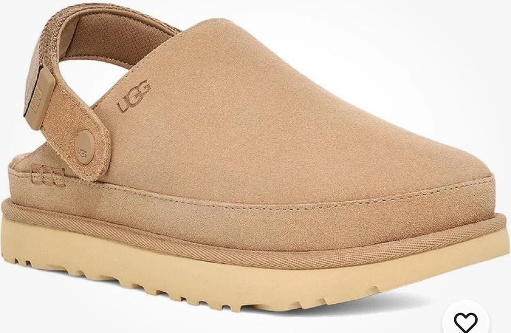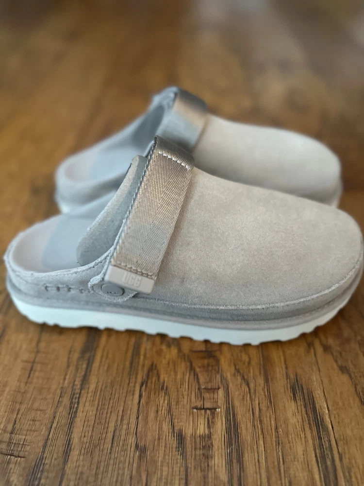 New with box! The UGG Women's Goldenstar Clog Slippers in sand color, size 9, are a stylish and comfortable choice for women looking for a cozy yet fashionable slipper. These clog-style slippers feature a beige color that adds a touch of elegance to the overall look. With the UGG brand known for its high-quality footwear, these slippers are sure to provide both comfort and style for any woman's wardrobe.