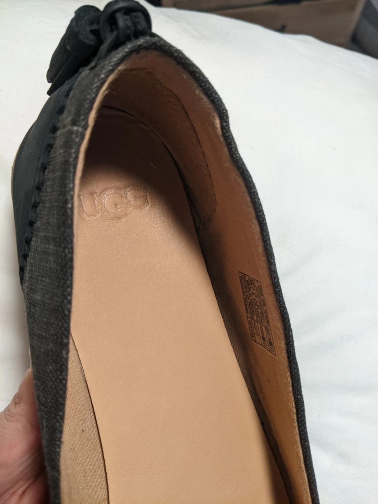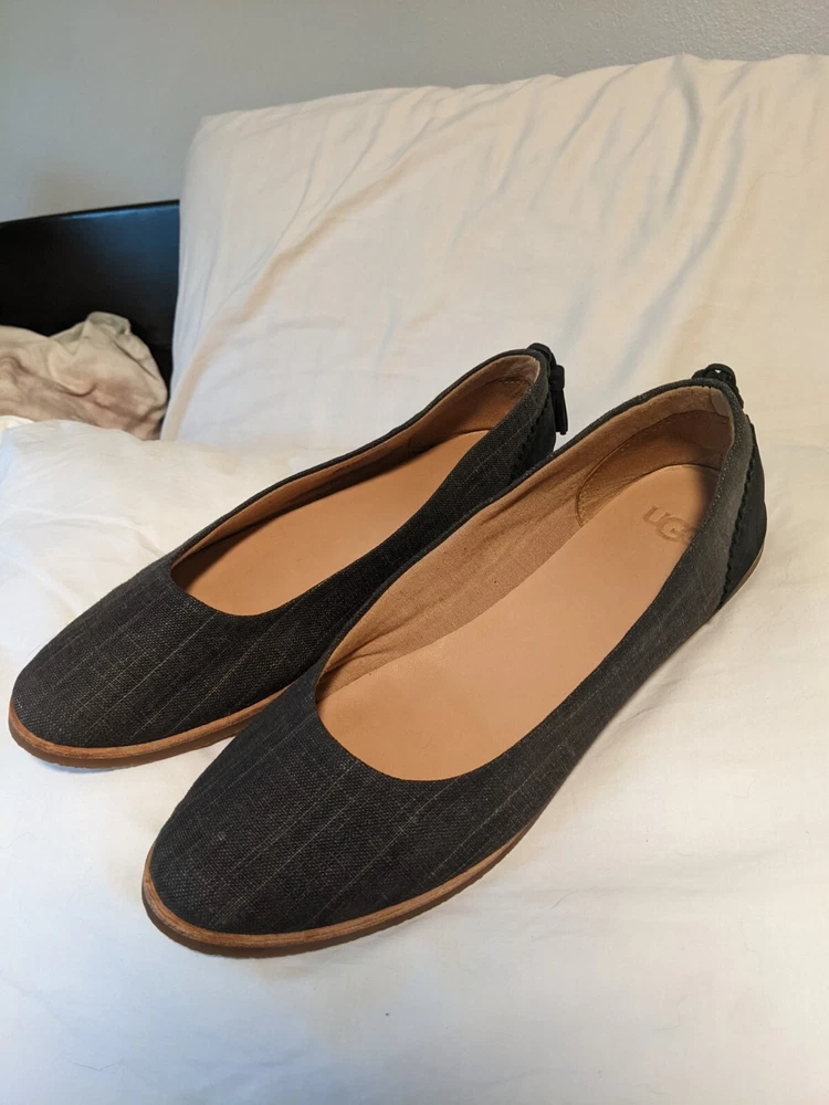 Pattern: Solid Model: Mesa Accents: Tasseled US Shoe Size: 9.5 Toe Shape: Round Toe Department: Women Brand: UGG Style: Ballet Color: Gray Theme: Classic Closure: Slip On Type: Flat Upper Material: Synthetic Occasion: Casual Features: Comfort