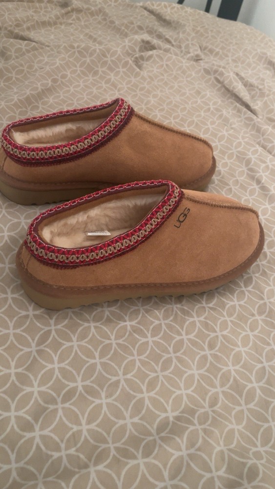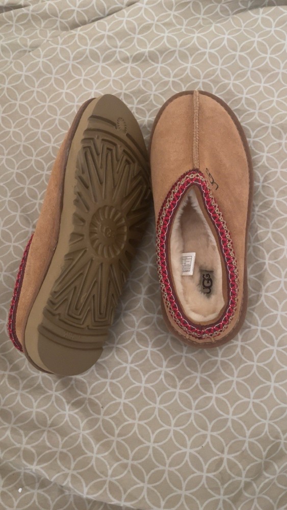 Occasion: Casual Accents: Patterned Trim Features: Comfort Toe Shape: Round Toe Insole Material: Shearling Heel Height: Flat (Under 1 in) Color: Brown, Red Season: Winter, Fall US Shoe Size: 7 Lining Material: Shearling Department: Women Outsole Material: Rubber Type: Slipper Pattern: Solid Theme: Classic Fabric Type: Shearling Upper Material: Suede Brand: UGG Closure: Slip On Style: Slip-On