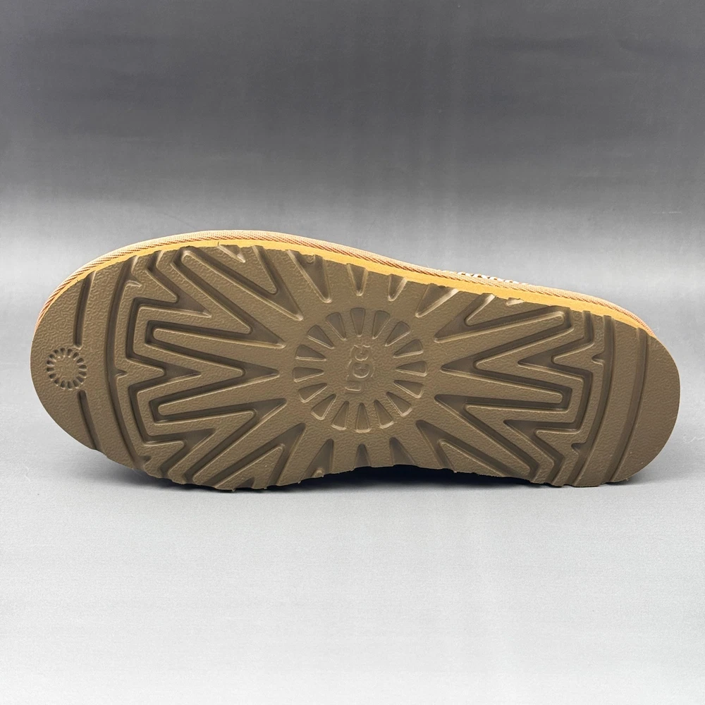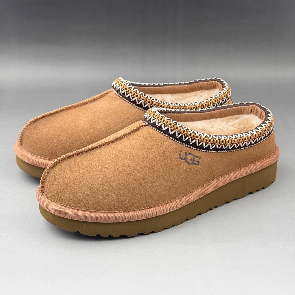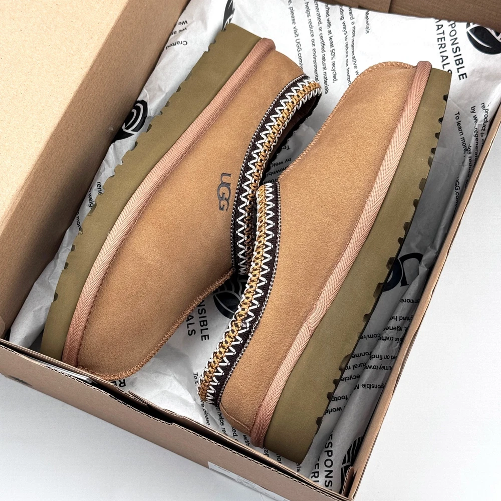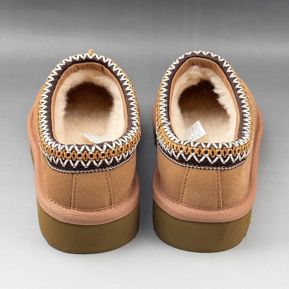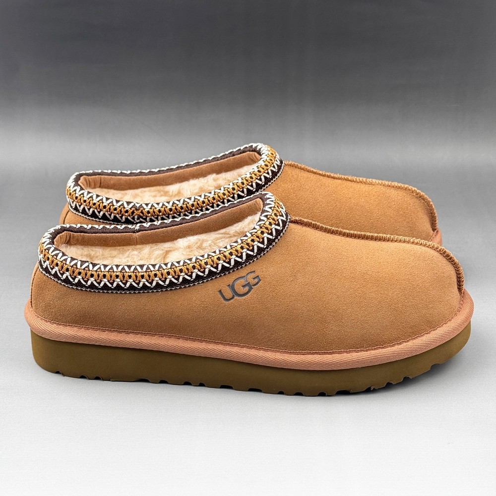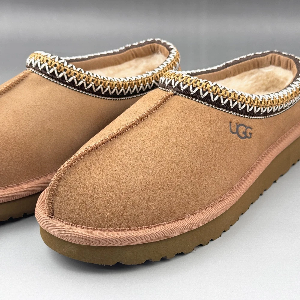 Women's Shoes US 6 - EU 37 - 230MM -(Heel-Toe 9.06IN) US 7 - EU 38 - 240MM -(Heel-Toe 9.45IN) US 8 - EU 39 - 250MM -(Heel-Toe 9.84IN) US 9 - EU 40 - 260MM -(Heel-Toe 10.24IN) US 10 - EU 41 - 270MM -(Heel-Toe 10.63IN) US 11 - EU 42 - 280MM -(Heel-Toe 11.02IN) Embrace cozy elegance with the Tasman Slip-On Slipper, a blend of style and warmth crafted for comfort. Made with a leather exterior, these slippers offer a classic look that’s effortlessly stylish. Inside, the soft 17mm lining and plush wool insole cushion your feet, adding warmth and support to every step. The rubber outsole provides excellent grip and a lightweight feel, ideal for both indoor lounging and light outdoor strolls. With a suede upper and a charming embroidered trim, these slip-ons elevate your casual wear, making every moment feel a touch more refined. Features: Material: Made from 100% leather for durability and a classic appearance. Lining: Soft 17mm lining for warmth and comfort. Insole: Features a 17mm wool insole for cushioning. Outsole: The rubber outsole provides excellent traction and lightweight comfort. Style: Suede upper with decorative embroidered trim, for lounging or light outdoor wear. Recycled Components: Textile binding made from 100% recycled polyester fibers reinforces our commitment to sustainability. Quality Branding: Features a heat-embossed UGG® logo and a woven label on the insole for authenticity. Genuine Fur : Contains real fur from sheep or lamb, sourced ethically from Australia, Ireland, the UK, or the US, and treated for durability.
