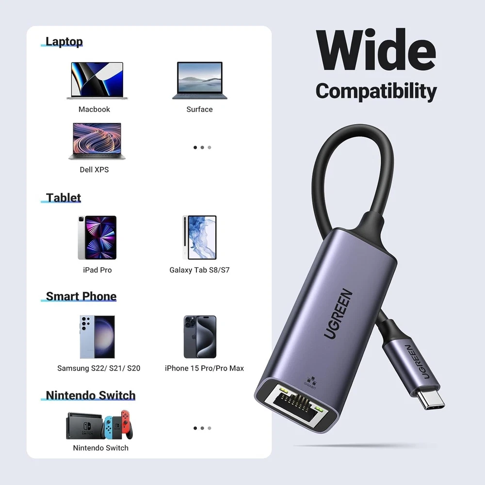 About this item Extend a Network Port for Your Device: The usb c to ethernet adapter offers a convenient way to extend or replace an RJ45 port for your device. It's a perfect choice for a device that is without network port or port failure to connect to the wired network 1000Mbps Hyper Speed: The ethernet to usb c can reach up to 1000Mbps network speed, giving a full play to the performance of your network and ensuring stable speed for you to online working, meeting, classing, gaming, streaming, upload, download, and more Plug and Play: UGREEN USB C to Lan Adapter is driver-free for Windows 11/10/8.1/8, macOS, iPad OS, Chrome OS, and Android Systems. Just plug in and enjoy a smooth wired network Widely Compatible: The usb c to ethernet is compatible with most laptops, tablets, smartphones, Nintendo Switch, and Steam Deck with USB-C or thunderbolt 4/3 port, like MacBook Pro/Air, XPS, iPhone 15/15 Plus/15 Pro/15 Pro Max, Mac Mini, Chromebook, iPad Built to Last: UGREEN USB C to Ethernet Adapter adopts a new aluminum shell and reinforced connect design, which can make the product extremely strong, durable, and more heat-dissipating