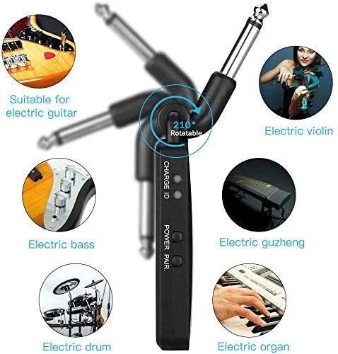 Whether you're conquering a large stage or a small venue, this wireless guitar transmitter receiver set will provides you with a nice stage experience. Strong ability to penetrate walls and withstand pressure. UHF provides fine signal reception and anti-interface quality, greater sound quality. 50m long transmission range without interference. 210° rotatable heads fit for most music instruments. Plug and play, simple to use. Compact size and lightweight, easy to carry. Built-in rechargeable battery, up to 6 hours of battery life after fully charged. Features: UHF wireless guitar system supports uncompressed signal transmitting and more than 50m outdoor transmission range without interference. Plug and play, no need of connection cable, flexible and convenient to use. Players can concentrate on their performance in stage, gigs and practice without the hassles of wires. 210° rotatable 1/4" plug design, available for instruments with input jack in different positions. Small in size and light in weight for portability. UHF sound transmission, anti-interference and ultra-short delay, giving you the perfect music sound. Superior 90dB dynamic range, 24bit/48KHz sampling frequency, and 20Hz-20kHz frequency response for more stable and more clear signal transmission. Built-in rechargeable lithium battery, working time is up to 6 hours after fully charged, and comes with a USB cable for convenient recharging, which ensures fine performance for your every show. Suitable for electric guitar, electric acoustic guitar, bass, and other musical instruments with 6.35mm jack. Also support for using with headphone, guitar amp, speaker, guitar effects pedal, audio mixer, etc. This guitar wireless system uses digital UHF radio frequency transmission technology to get rid of the cable, the transmission distance is up to 50 meters without interference, you are afforded the freedom to roam the stage for a truly dynamic performance. Specifications: Frequency Response: 20Hz-20KHz Main color: black Main material: ABS Signal-to-noise Ratio: 90dB THD+Noise: <0.03% Transmission Delay: Less than 1ms Transmission Range: 50 meters (No obstacle) Transmitter Battery: 3.7V, 600mAh Receiver Battery: 3.7V, 600mAh Package Size: 135 * 105 * 40mm / 5.3 * 4.1 * 1.6in Package Weight: 200g / 7.1ounce Packing List: I6309 1 * Transmitter 1 * Receiver 1 * USB Cable 1 * User Manual