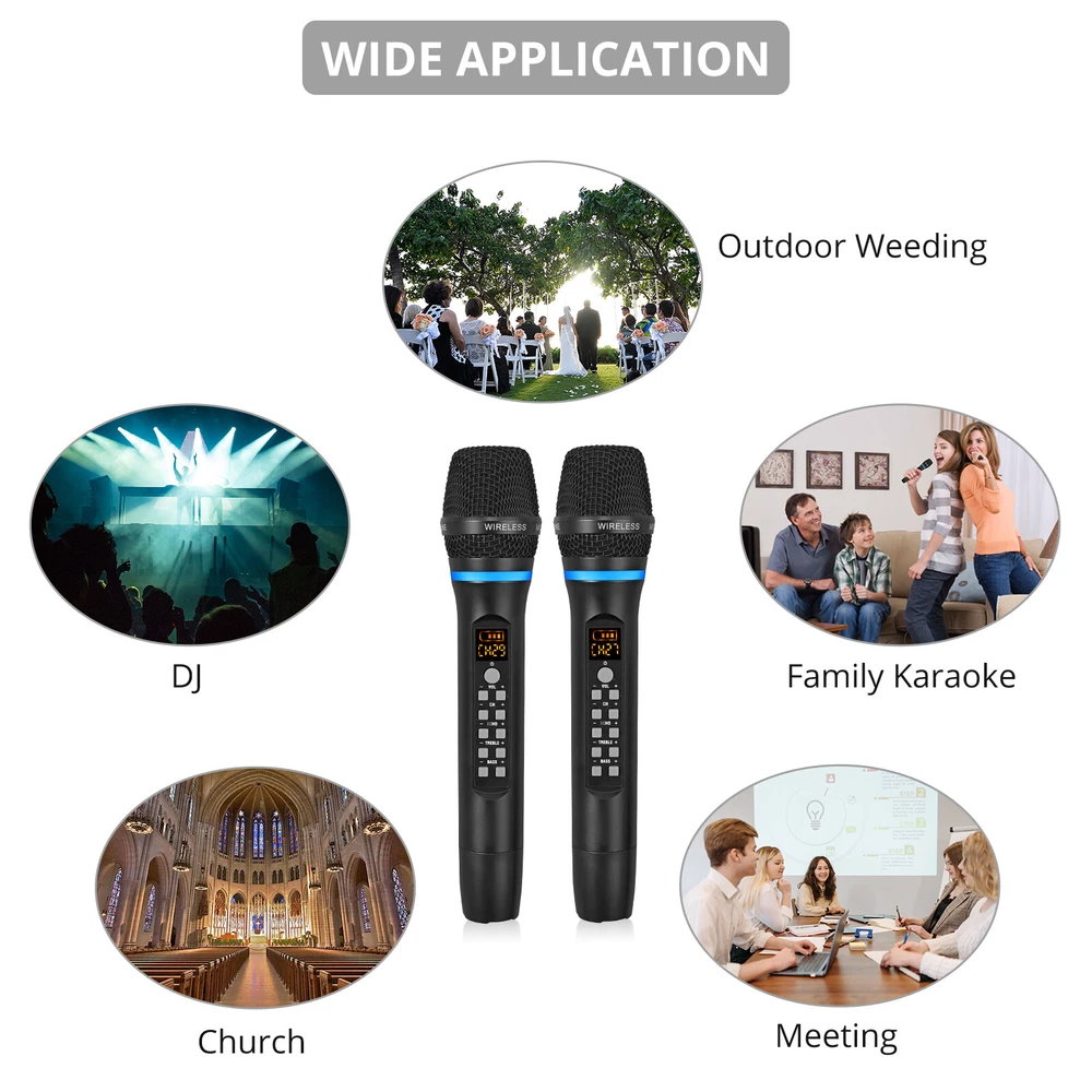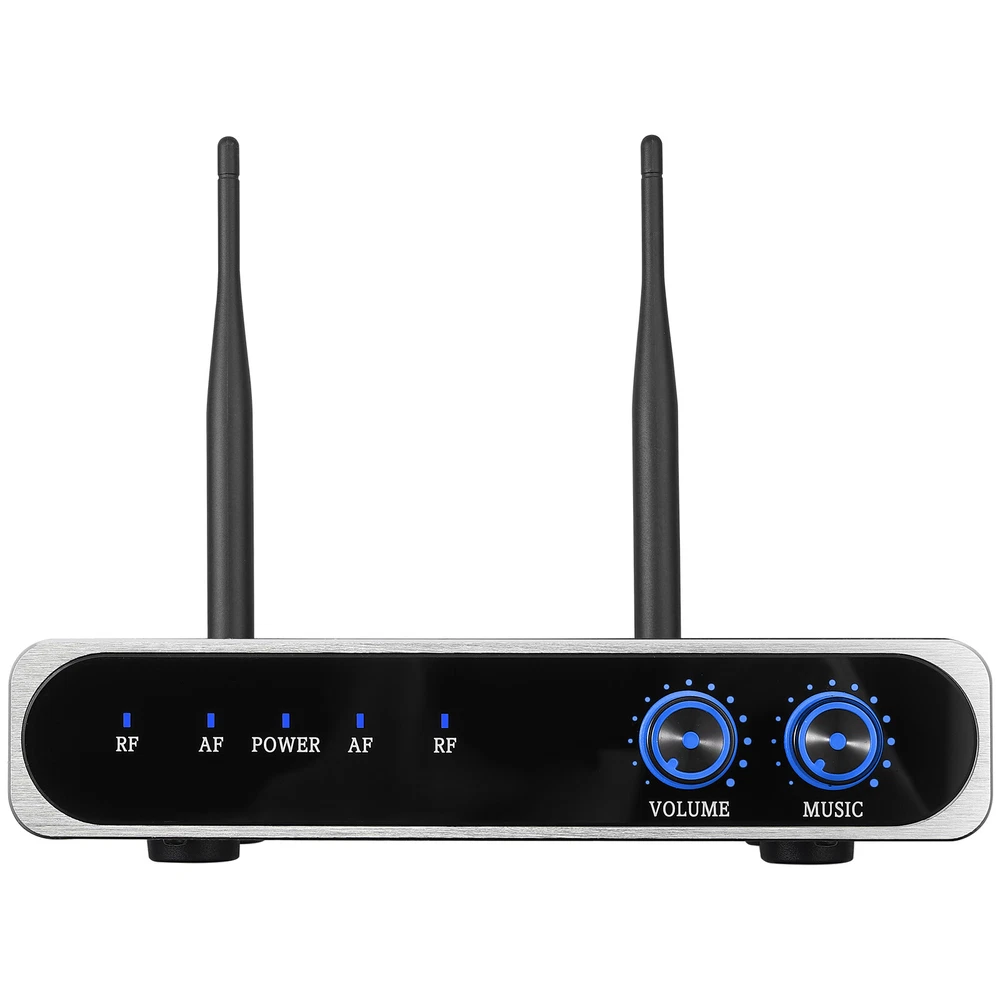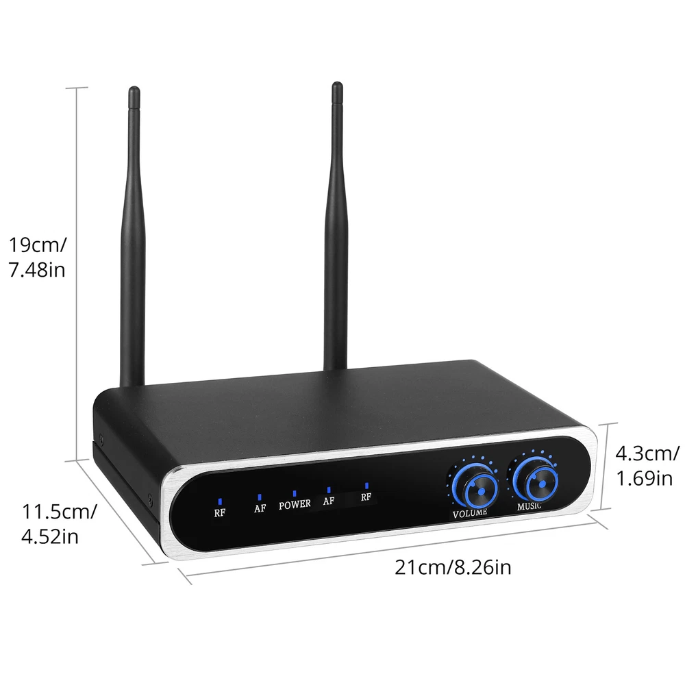 Description: UHF microphone system, Ultra high frequency signal transmission, offers powerful and stable wireless connection, allows to deliver your voice without delay or interference, crisp vocal & excellent sound reproduction Unlike other low Grade VHF unit. Ideal for karaoke machines, DJ, singing, Church, weddings, Speaker, amplifiers, PA systems. Our advantages: 1. Rechargeable microphone (different from regular microphones) 2. With Bluetooth (used to connect to mobile phones and TV to play music) 3. Microphone with high and low reverberation and volume adjustment (multifunctional microphone) 4. The host comes with music volume control and microphone volume control (multi-functional host) 5. Microphone input interface (can connect multiple sets of microphones) 6. 3.5mm AUX input output + 6.35mm output (AUX input can be connected to TV for music input, AUX output can provide stereo sound) 7. One in two charging cable (charging two microphones simultaneously) Specification: Receiver desktop Frequency: U band Frequency stability: <0.002% Sensitivity: 2/MV Adjacent channel interference ratio: >90DB Mirror interference ratio: >88DB SNR: >95DB Audio output: 0-300MV Working range: standard conditions 20 to 50 meters Accepted channel: 2 channels Power supply voltage: AC/100-240V Bluetooth: 5.0 Antenna: External antenna Launch handheld Carrier frequency: U band Frequency stability: <0.002% Transmit power: 10MV Current consumption: <25MA Subharmonic: