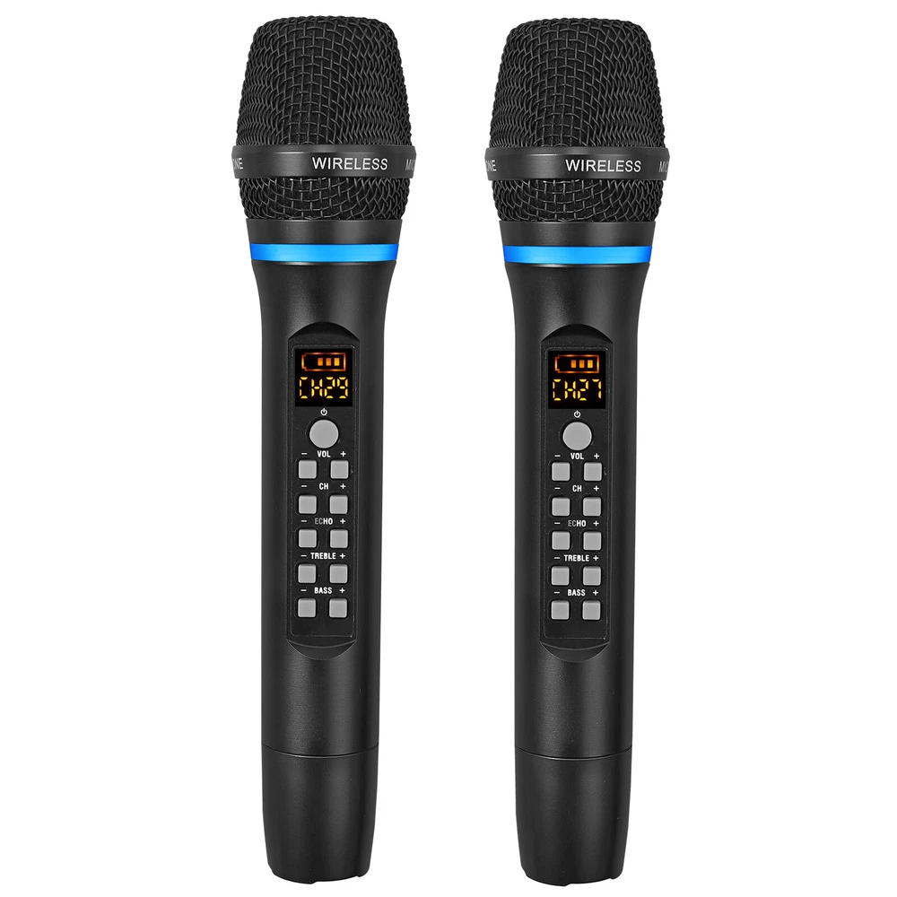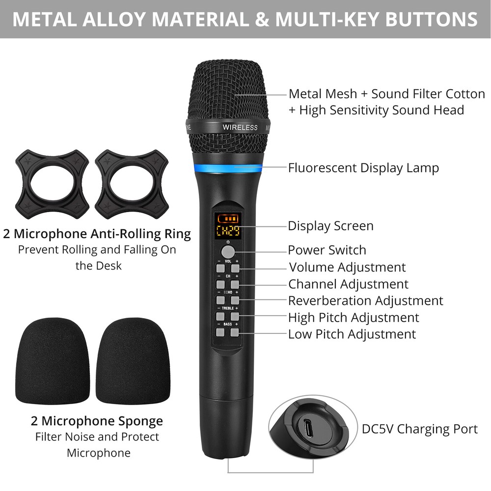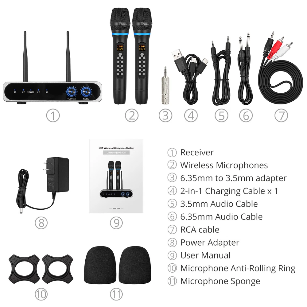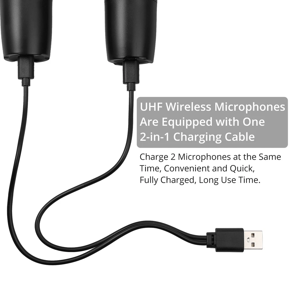 Description: UHF microphone system, Ultra high frequency signal transmission, offers powerful and stable wireless connection, allows to deliver your voice without delay or interference, crisp vocal & excellent sound reproduction Unlike other low Grade VHF unit. Ideal for karaoke machines, DJ, singing, Church, weddings, Speaker, amplifiers, PA systems. Our advantages: 1. Rechargeable microphone (different from regular microphones) 2. With Bluetooth (used to connect to mobile phones and TV to play music) 3. Microphone with high and low reverberation and volume adjustment (multifunctional microphone) 4. The host comes with music volume control and microphone volume control (multi-functional host) 5. Microphone input interface (can connect multiple sets of microphones) 6. 3.5mm AUX input output + 6.35mm output (AUX input can be connected to TV for music input, AUX output can provide stereo sound) 7. One in two charging cable (charging two microphones simultaneously) Specification: Receiver desktop Frequency: U band Frequency stability: <0.002% Sensitivity: 2/MV Adjacent channel interference ratio: >90DB Mirror interference ratio: >88DB SNR: >95DB Audio output: 0-300MV Working range: standard conditions 20 to 50 meters Accepted channel: 2 channels Power supply voltage: AC/100-240V Bluetooth: 5.0 Antenna: External antenna Launch handheld Carrier frequency: U band Frequency stability: <0.002% Transmit power: 10MV Current consumption: <25MA Subharmonic: