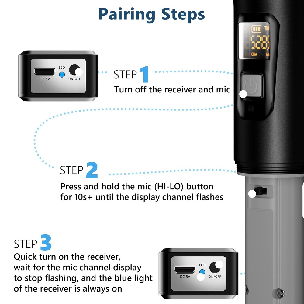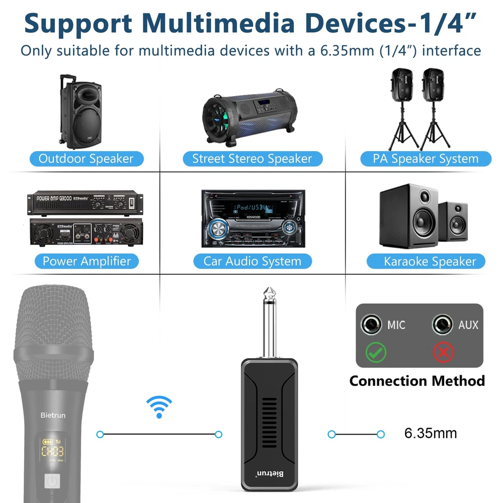 UHF Receiver Wireless Microphone WXM02 / WXM04, with 720mAh Rechargeable Battery, 160 ft Working Range, 1/4" Output for for Karaoke Machine/PA Speakers System/Mixer Receiver for WXM02 / WXM04 Wireless Microphone : Use to replace your old, damaged, or non-working receiver. Note: The receiver only works with WXM02 / WXM04 microphones. Pair Steps: 1. Turn off the receiver and mic. 2. Open the mic battery cap. 3. Press and hold the mic(HI-LO)button for 10s+ until the display channel flashes. 4. Quick turn on the receiver, wait for the mic channel display to stop flashing, and the blue light of the receiver is always on, ready to use. Built-in 720mAh Rechargeable Battery: Up to 4.5hrs working time. When the indicator light is blue and flashing fast, it indicates the battery power is low, please recharge the receiver. 160ft Long Distance Receiving Range: ●Can receive your microphone signals within 160ft/50m. ●Adopt the UHF wireless system, excellent anti-interference ability, and no latency. Plug And Play, Easy To Use: ●Can only plug-in equipment with MIC input, can't plug In AUX input, Otherwise, there will be no sound. (Not compatible with Bluetooth speakers and laptop) ●Idea for MIC input speaker, singing machine, audio amplifier, PA system, mixer, voice amplifier, and More streaming multimedia equipment. Use to replace your old, damaged, or non-working WXM02, WXM04 wireless microphone receiver Shipping We offer FREE shipping on all orders! We ship within Three business days of payment, usually sooner. We use a selection of shipping services such as UPS, FedEx, USPS etc. We only ship to the lower 48 states, no APO/FPO addresses or PO Boxes allowed. Local pickups and combined shipping options are not provided at this time. Return You can return a product for up to 30 days from the date you purchased it. Any product you return must be in the same condition you received it and in the original packaging. Please keep the receipt. Payment We accept payment by any of the following methods: PayPal Please pay as soon as possible after winning an auction, as that will allow us to post your item to you sooner! Feedback Customer satisfaction is very important to us. If you have any problem with your order, please contact us and we will do our best to make you satisfied. Contact Us If you have any queries, please contact us via ebay. We usually respond within 24 hours on weekdays. Please visit our eBay store to check out other items for sale! Thank you for shopping at our store.