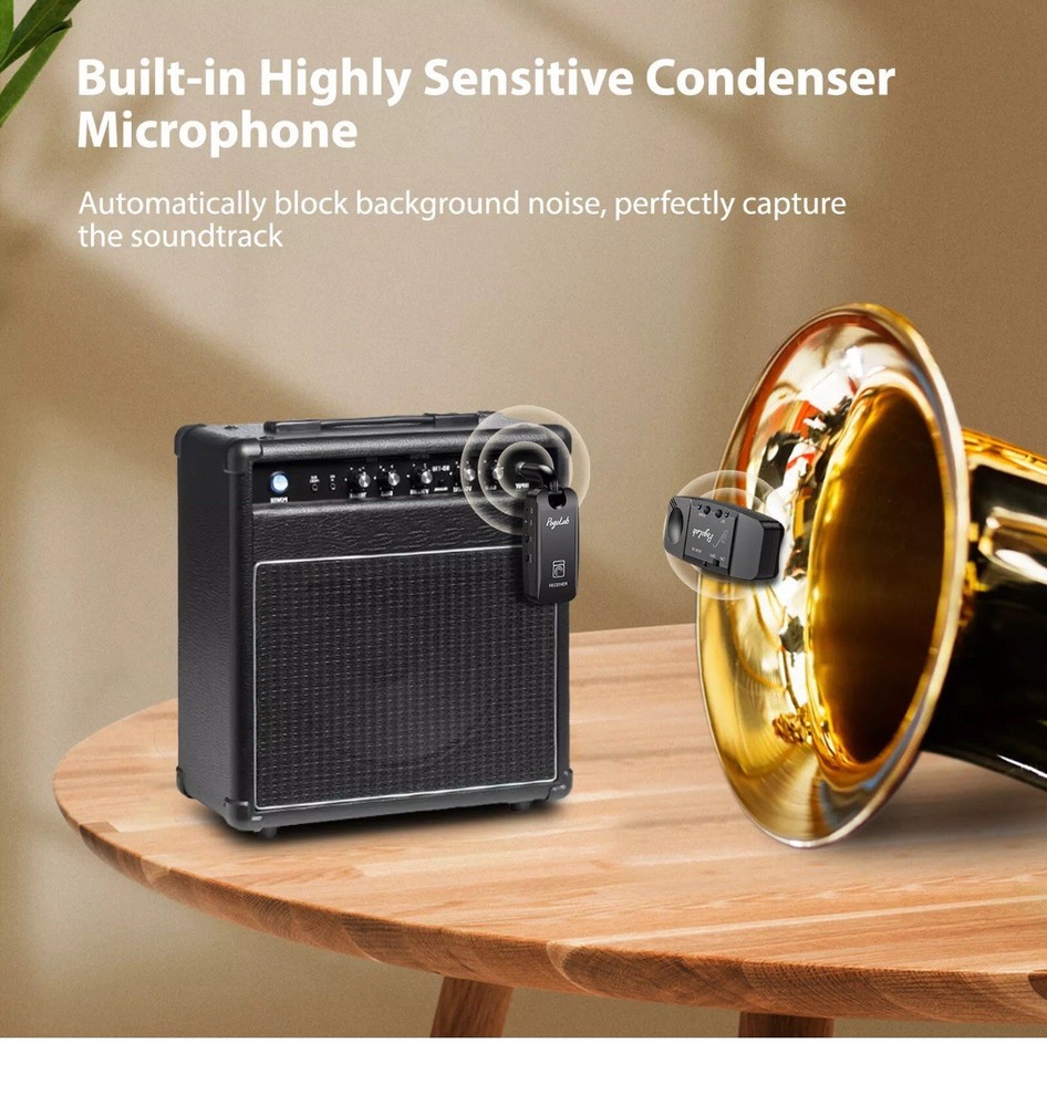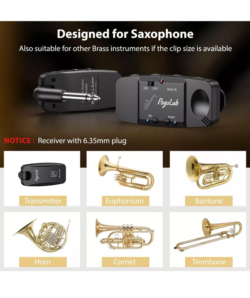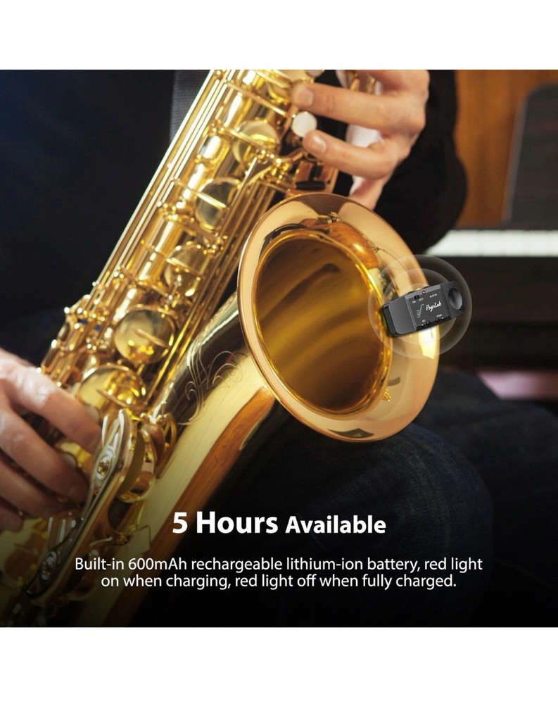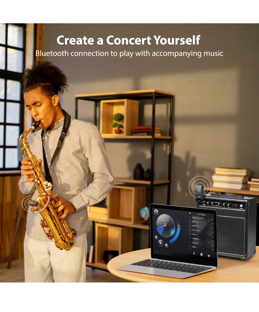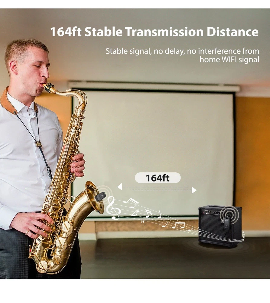 ⭐️⭐️⭐️UHF Saxophone Wireless System⭐️⭐️⭐️ ⭐️UHF STABLE TRANSMISSION --- wireless saxophone system is based on UHF technology, stable transmission up to 164 feet (50m) in open areas, clear sound with almost no delay. In addition, 4 signal channels can be easily switched. Even in big gigs, you can play the saxophone continuously without interference from WIFI (or other signals). ⭐️CLIP-ON TRANSMITTER --- Transmitter has a built-in upgraded high-sensitivity condenser microphone, which can easily capture clearer and more realistic voices, and at the same time automatically seal the ambient noise to obtain a more perfect recording. In addition, the transmitter clip has a rubber pad, which can be firmly fixed on the sax without damaging the sax, and it is also very easy to remove. ⭐️PLAY MUSIC ACCOMPANIMENT --- You can use Bluetooth connection or plug the audio cable to play background music, the fusion of saxophone and accompaniment music makes your performance richer and more attractive. ⭐️5 HOURS BATTERY LIFE --- Built-in rechargeable battery, it can work for about 5 hours after fully charged, suitable for several rehearsals or performances. A dual usb cable is included to charge the transmitter and receiver at the same time. There's an indicator light to let you know when the battery is running low. ⭐️EXCLUSIVE FOR SAXOPHON --- Designed for saxophones and brass instruments such as euphonium, baritone, French horn, and cornet. The receiver has a 6.35mm plug, which can be connected to speakers and amplifiers. Plus, it comes with a storage bag for easy storage and portability.