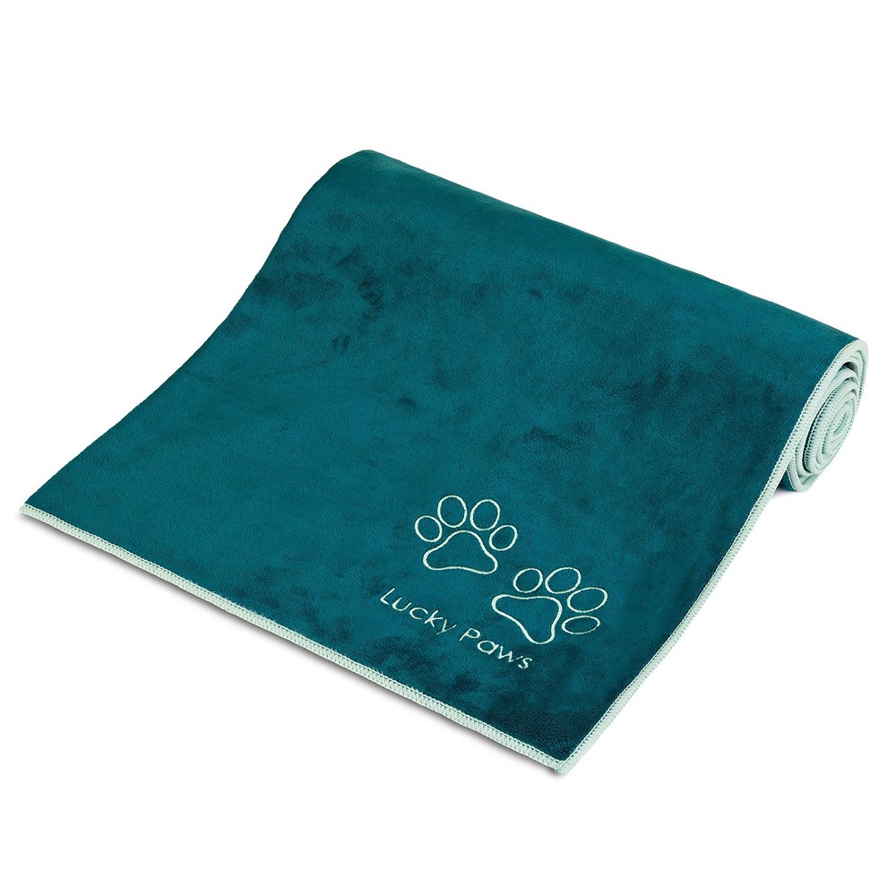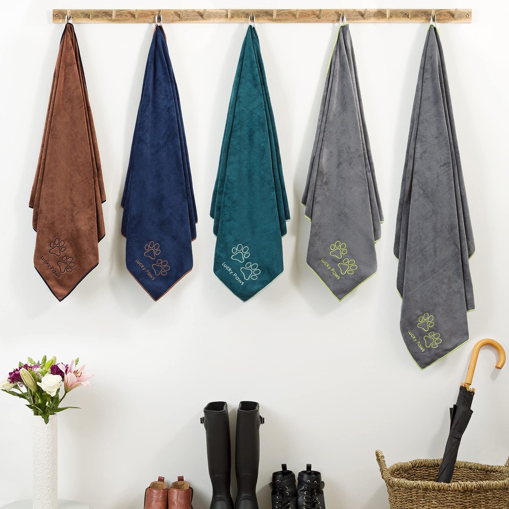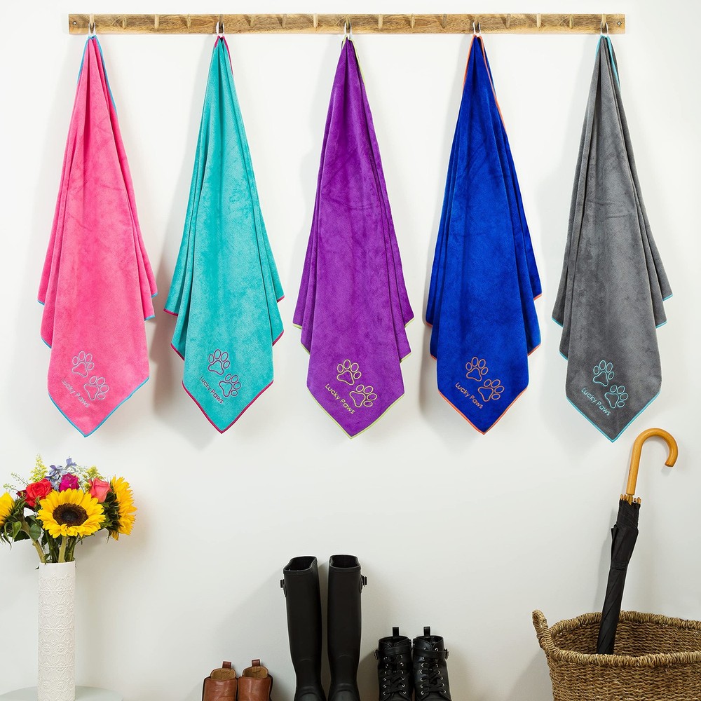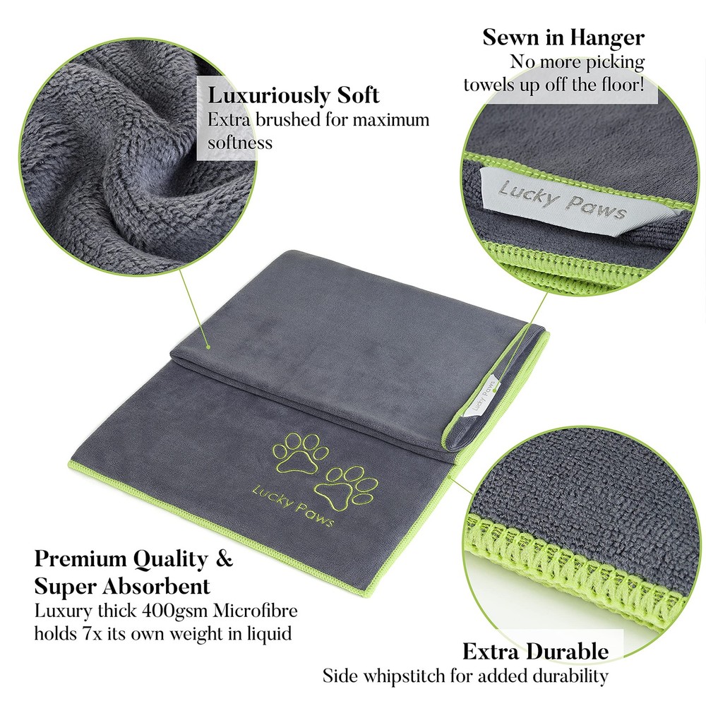 Features: SUPER ABSORBENT - Our Microfibre dog towel can hold nearly 3 litres of water, making drying your dog after a swim, muddy walk or shower that much quicker and easier compared to using an old bath towel. FAST DRYING - Our quick dry towel dries up to 4x faster than a cotton towel. Perfect for dog grooming and daily use. SUPER SOFT - Our towels are made from super soft microfibre. Your furry friend will love being dried with this and even snuggling underneath the dog towel as a blanket. PREMIUM QUALITY - Our luxury pet towels are made from 400gsm microfibre, making them thicker and softer than standard microfibre towels. You can feel the difference and so will your beloved friends. EXTRA LARGE SIZE & SEWN IN HANGER 140 x 70cm, making it suitable for even the largest dogs and our sewn in hanger means no more picking dog towels up off the floor!
