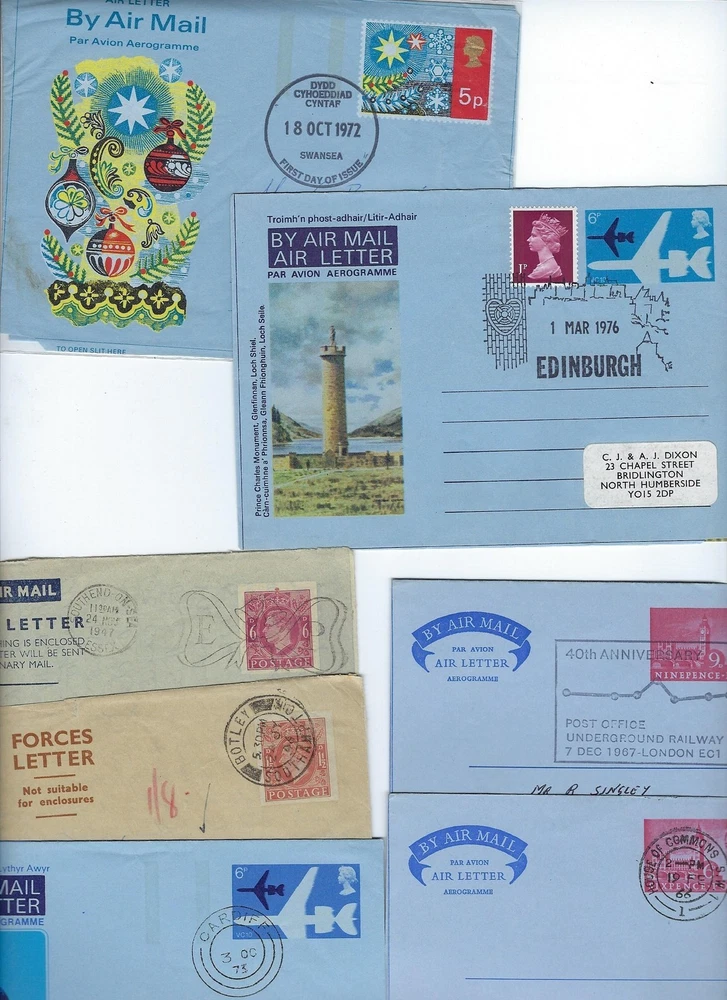 UK GB 1940 1980s LARGE COLLECTION OF 19 AIR LETTERS INCLUDING FDCs SPECIAL CANCE