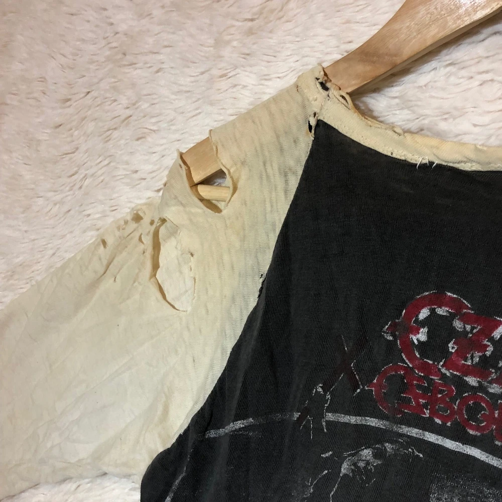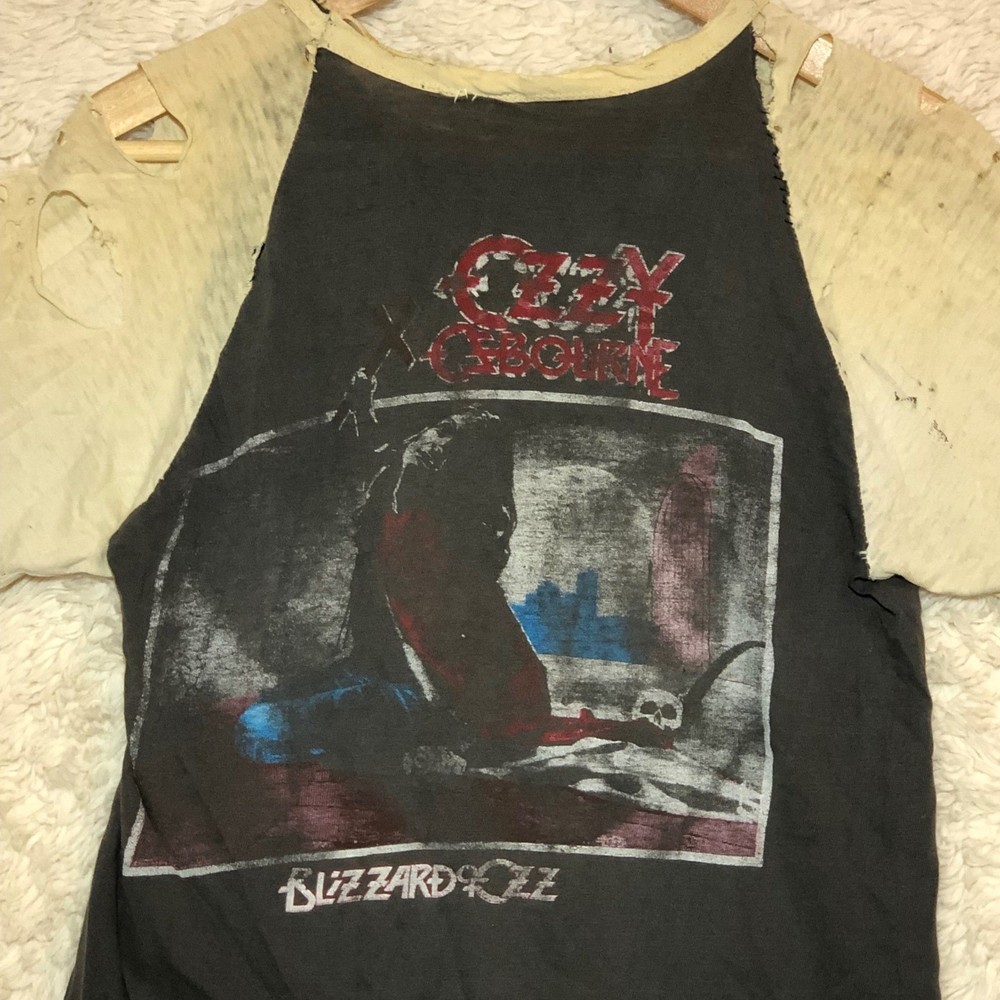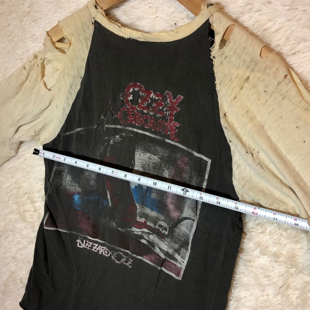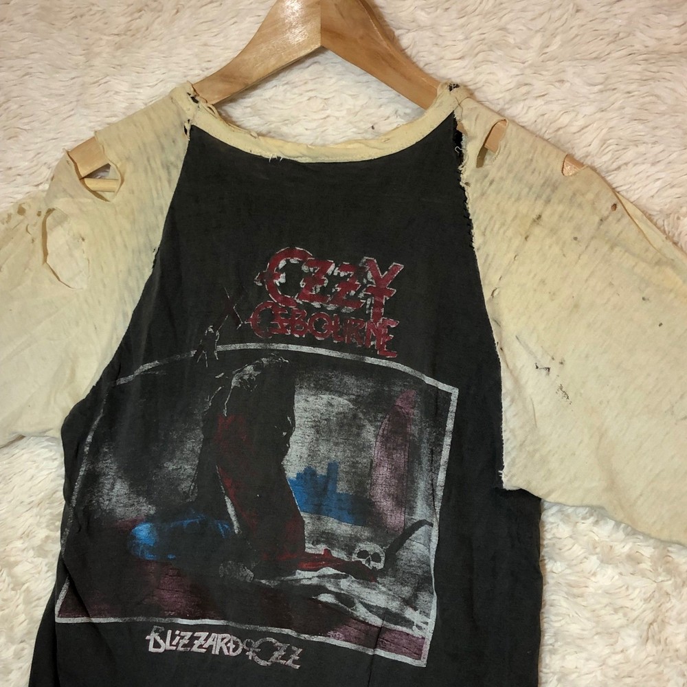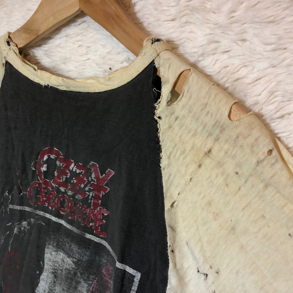 Vintage Ozzy Osbourne Blizzard of Ozz band raglan t-shirt. Features the iconic album artwork on the front and distressed, ripped sleeves and neckline. This iconic rock tee is perfect for concerts, casual wear, or as a statement piece. Measurements: • Chest: 19 in • Length: 26 in • Sleeve Length: 17 in Keywords: Ozzy Osbourne, Blizzard of Ozz, vintage t-shirt, band shirt, rock music, raglan, distressed, heavy metal, concert tee, graphic tee, retro, iconic, worn For measurements please see photos. All items come from a smoke-free and pet-free home. We use minimal scents but are not a fragrance-free home.
