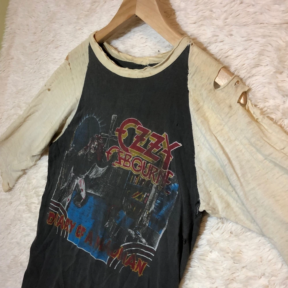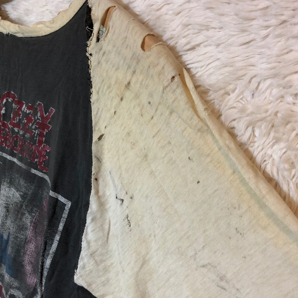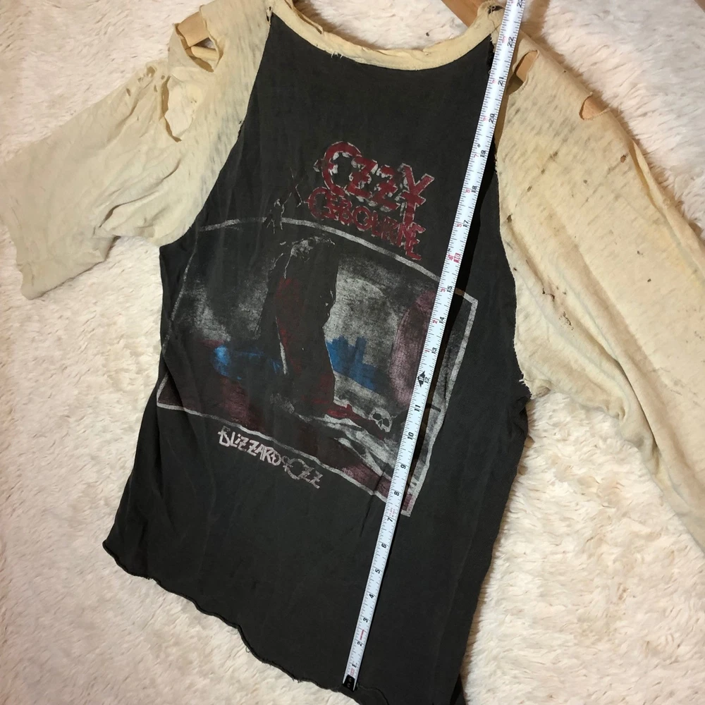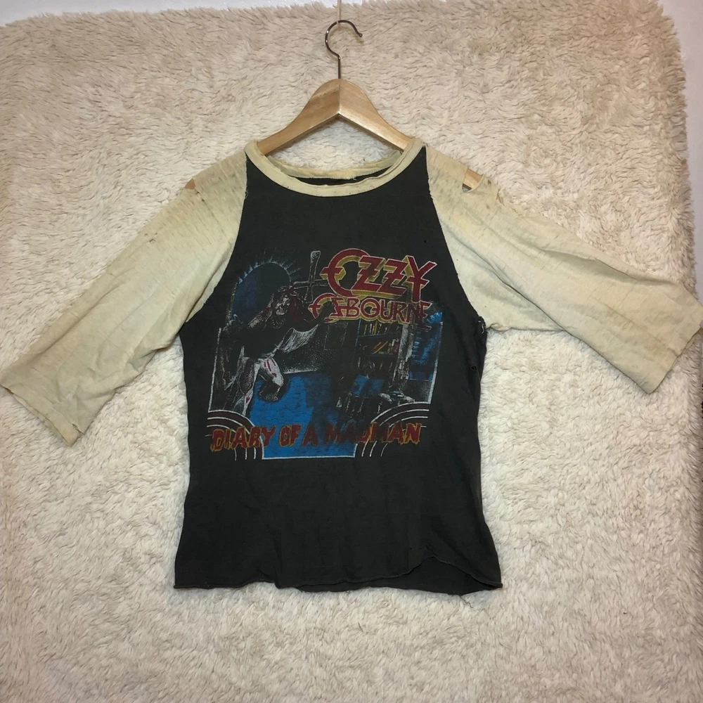 Vintage Ozzy Osbourne Blizzard of Ozz band raglan t-shirt. Features the iconic album artwork on the front and distressed, ripped sleeves and neckline. This iconic rock tee is perfect for concerts, casual wear, or as a statement piece. Measurements: • Chest: 19 in • Length: 26 in • Sleeve Length: 17 in Keywords: Ozzy Osbourne, Blizzard of Ozz, vintage t-shirt, band shirt, rock music, raglan, distressed, heavy metal, concert tee, graphic tee, retro, iconic, worn For measurements please see photos. All items come from a smoke-free and pet-free home. We use minimal scents but are not a fragrance-free home.