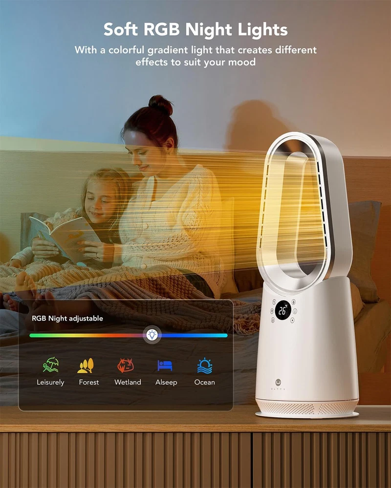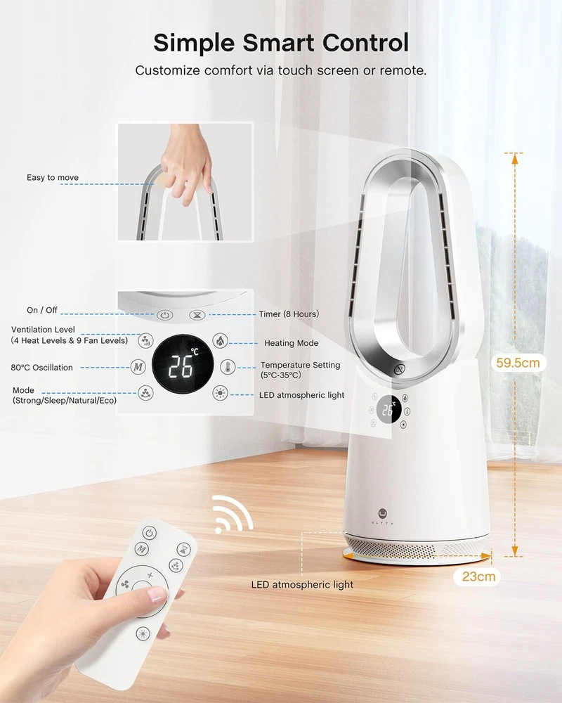 3S Fast Heating, Instant Warmth: Powerful 1400 watt Brushless DC motor heating element allows this space heaters for indoor use quickly heat up to 70°F in 3 seconds, 80°widespread oscillation portable heater rotates from side to side to generates more effective, immediate and evenly warmth for your surroundings, guards your family's warmth and happiness in winter. There are 3 modes of our heated fan, including low, high heating settings and fan only Soft & Strong Wind Like Nature: The swing tower fan uses a large-diameter centrifugal wind wheel to rotate at a high speed to supply strong power. The wind is cut into more bundles and the airflow is more delicate. The tower fan has 9 adjustable wind speeds, you can touch the button on the surface to control the speed. The cooling fan also equipped with a remote control, so you can easily control the speed of the wind in the home, office, sofa or bedroom, and enjoy the coolness anytime, anywhere 80°Oscillating, Quick Cooling and Heater: Experience the heat that envelopes you in the widest way possible. 80°wide-angle oscillation sweeps around to cover the whole area, providing wide-reaching heat and cool for your bedroom, garage, basement, office, desktop, etc. Cooling up to 35W; Warm up to 1400W Leafless Design, Protect Family: This desktop tower fan can provide fresh air without rotating the blades, the leafless design will not hurt your baby and pet, it is an ideal summer/winter must-have for families with children and pets. Easy to clean, just wipe the surface with a rag. This bladeless tower fan with space heater will accompany you the whole cool summer and cold winter Quiet and Evenly Breeze: This powerful yet silent floor fan is expertly engineered to produce little noise(only 25-35dB) that won’t disturb your sleep; built-in timer can be set from 1 to 8 hours for a good night’s sleep or nap during nights. The LED will automatically turn off after 15 seconds Multiple safety protection: Auto-shut-off safety system includes tip-over, over- current and overheat protection. Overheat system will shut the heater off when the parts of the heater over heat, this indoor bladeless space heater also will shut off once it is tipped over to help prevent accidents(when in heater mode) Desk Fan with 6 Colorful LED lights: The desk fan equipped with colorful decorative light, it be adjusted according to different weather or mood. Whether the elder or children, for anyone who is sensitive to darkness, the decorative light can illuminate a small space and the gentle breeze will accompany you all night. Easy Operation & No Assembly Required: This bladeless tower fan with space heater is transported as a whole machine and can be used immediately without your assembly. In order to ensure safe transportation, we use very strong packaging materials.We also provide 24-hour online service, so you can buy with confidence