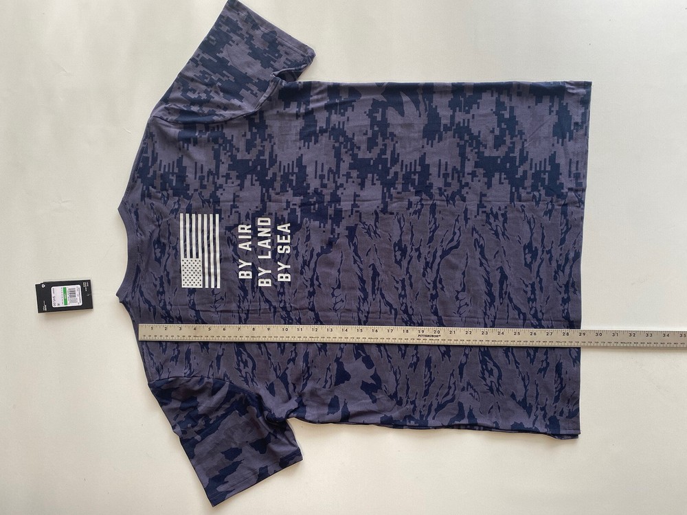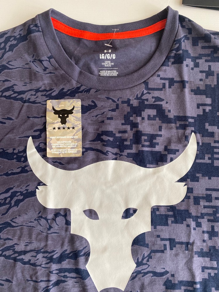 This Under Armour Project Rock T-Shirt is perfect for gym and training sessions or casual wear. The blue camouflage pattern with a logo accent adds a touch of style. The shirt is made of a polyester, cotton, and elastane blend and is machine washable for easy care. The pullover style with a crew neck and short sleeves makes it a great choice for all seasons. The T-shirt is unlined, tagless, and non-iron, ensuring maximum comfort. Please refer to the pictures for shirt length and chest size. Condition of the item is New w/ Tag. Shipped asap by USPS First Class Mail.