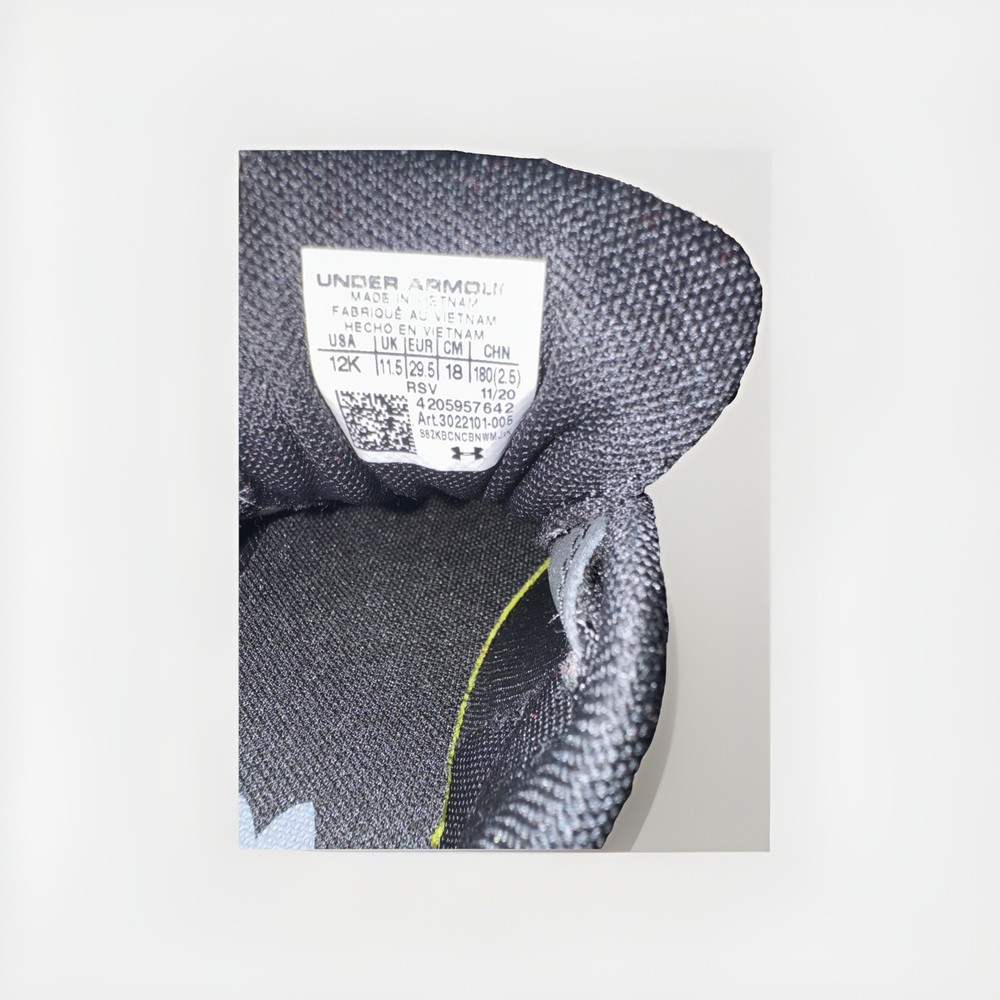 UPC: 194512360872 Upper Material: Synthetic Accents: Logo Color: Black Style: Sneaker Character Family: NONE Shoe Width: M Personalize: No Closure: Lace Up Lining Material: Synthetic Season: Fall, Spring, Summer Performance/Activity: Running & Jogging, Walking gtin13: 194512360872 Occasion: Activewear Brand: Under Armour Fabric Type: Blended Fabric Theme: NONE Model: Under Armour Essential Year Manufactured: 2021 Department: Boys AU Shoe Size: 11.5 Vintage: No US Shoe Size: 12 Product Line: essential Insole Material: Synthetic Customized: No Outsole Material: Synthetic Cushioning Level: Moderate Handmade: No EU Shoe Size: 29.5 Signed: No MPN: 3022991 Type: Athletic Features: Cushioned Character: NONE Country of Origin: Vietnam Toe Shape: Round Toe UK Shoe Size: 11.5 Shoe Shaft Style: Low Top Pattern: Solid