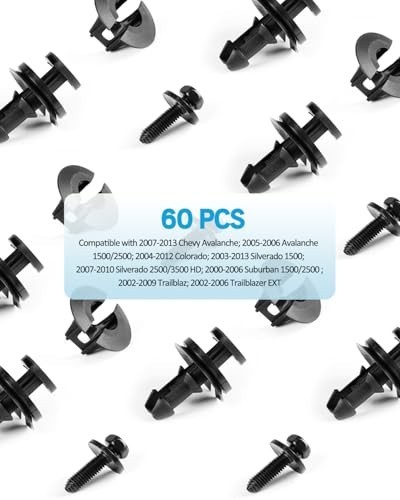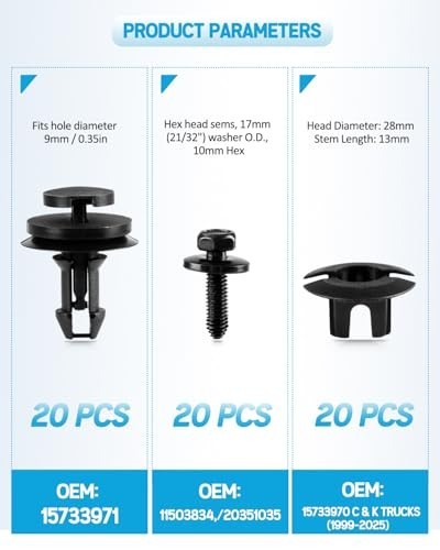 20 Sets Silverado Bumper Clips Front Air Deflector Retainers Clips 15733971 15733970 with M6 1.0 X 25mm Head Sems Body Bolts Fits Chevy GMC Trucks Sierra Suburban Tahoe Yukon Escalade Avalanche Description : 20pcs Front bumper retainer clips replace OEM # 15733971, fits hole diameter 9mm / 0.35in, made of high-quality black nylon material, anti-wear, and anti-corrosion 20pcs Front air deflector grommet retainers replace OEM #15733970 C & K Trucks 1999-, Head Diameter: 28mm, Stem Length: 13mm 20pcs Head Sems Body Bolts M6-1.0 x 25mm, replaces OEM # 11503834, 20351035 , hex head sems, 17mm (21/32") washer O.D., 10mm hex, phosphate, class 9.8 Widely used as air deflector clip, bumper cover retainer, outer bracket clip, lower bracket retainer, bumper trim clips, bumper cover fastener, door interior trim panel bolt. fog light Screw, horn mount bolt