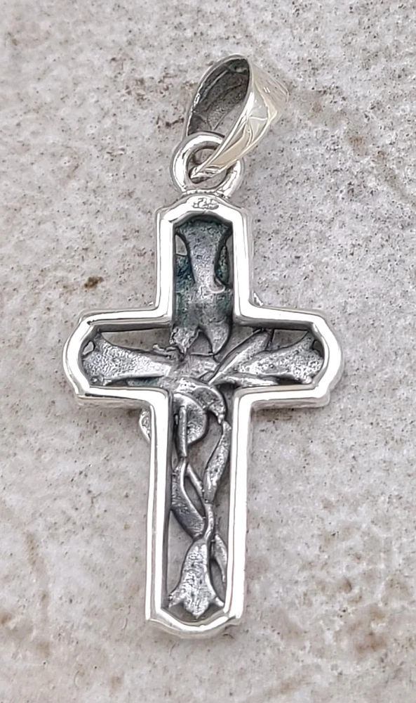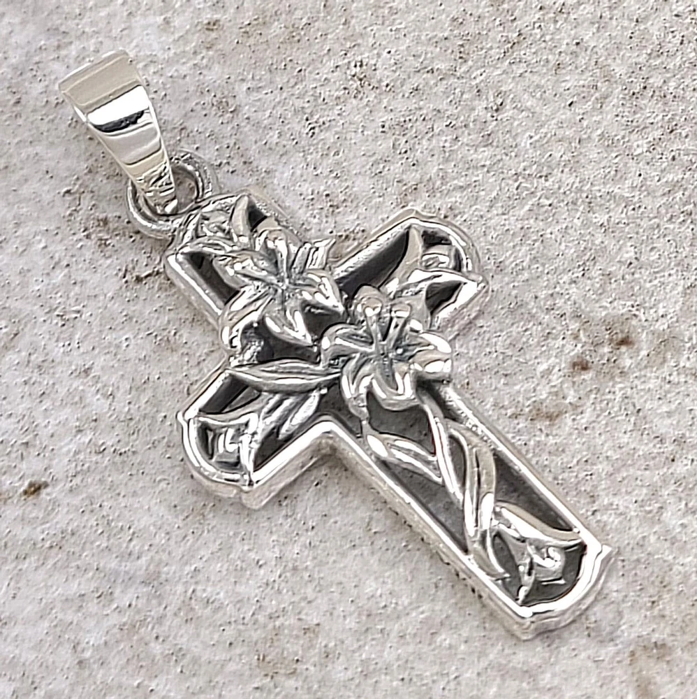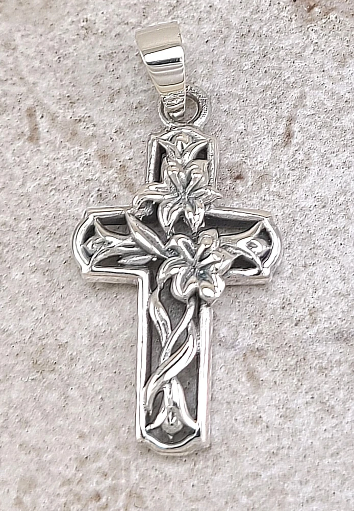 DETAILS dimensions 34mm(1 3/8") tall with bale 16mm(5/8") wide retail value $40.00 part no. p1152 You are bidding on a cute sterling silver flower cross pendant. This beautiful cross measures 34mm(1 3/8") tall with the bale and 16mm(5/8") wide and has a detailed flower in the center and a floral pattern around the cross. The bale has an opening of 4mm and will fit on most light chains up to 3mm wide(most box and snake chains, and light rope or link chains will fit). This piece has a beautiful high polish finish that will compliment anything in your silver collection. to view all listed items in the same style click here to see them in my EBAY store this auction is for the item and size specified only all our merchandise is sterling silver and stamped .925 Flat shipping rates: we charge a flat rate of $4.50 per order within US for items ending within 7 days from 1st to last item. All items must be paid together to receive shipping discounts. domestic shipping rates (US address) 1st item additional items USPS 1st Class mail $4.50 free USPS Priority mail $9.00 free packing and shipping: all orders will ship by the next business day after payment is received Monday to Friday except holidays. All items are sent in a padded envelope for security and protection about us: We have been selling the finest sterling silver jewelry at wholesale prices exclusively on ebay for over 10 years. Customer service: Good service is very important to us!!!! Our goal is to provide you with accurate descriptions and detailed pictures of the highest quality sterling silver jewelry to help you in your purchase. return policy: if for any reason you are not satisfied with your purchase contact us within 7 days of receipt, and return the item within 30 days for a full refund of the purchase price.(shipping fees will not be refunded) Feedback: we appreciate all positive feedback and we will automatically leave positive feedback for all customers who have left positive feedback for the transaction. please do not use feedback to relay a message to us, if you have a problem with anything contact us first thru ebay messages .